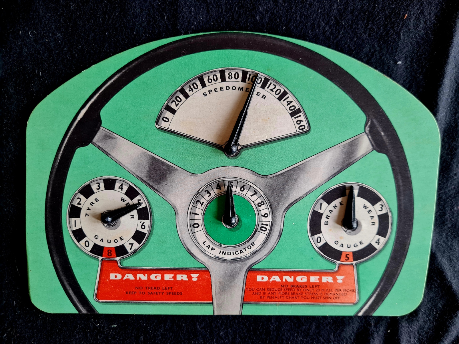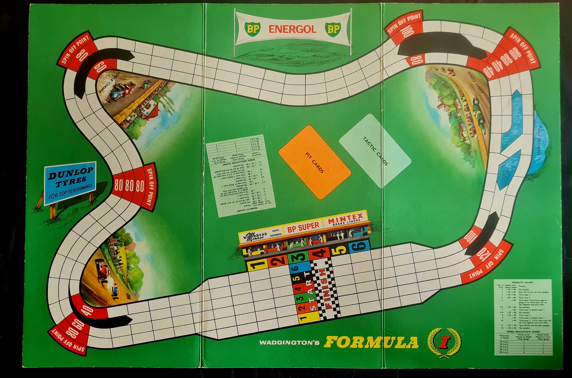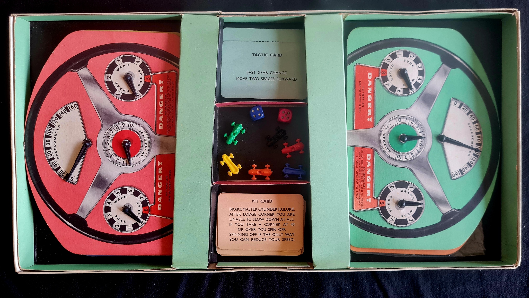 Das Sammlungsexemplar (Geschenk von Sepp Obermaier) ist vollständig und sehr gut erhalten (mit kleinen Schäden an der Schachtel). Es enthält das Spielbrett, 6 analoge dash-boards (zum Einstellen der Geschwindigkeit, der Reifenabnutzung, der Bremsbelagabnutzung und einen Rundenzähler),6 Miniaturautos, 2 Würfel, 16 Boxenkarten, 30 Taktikkarten und die Spielregel (englisch).