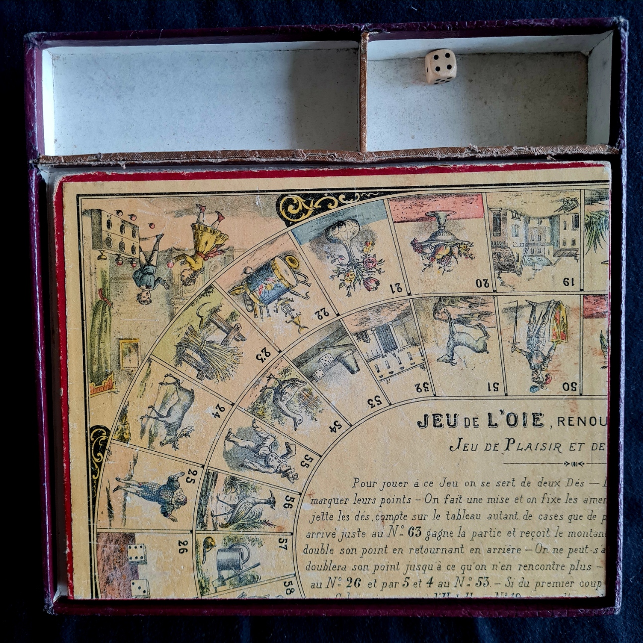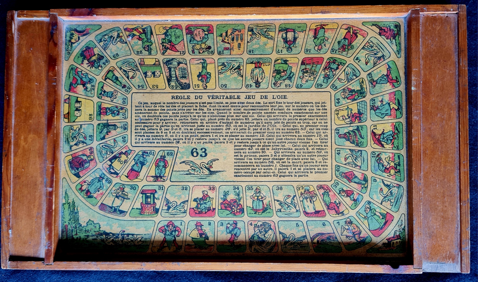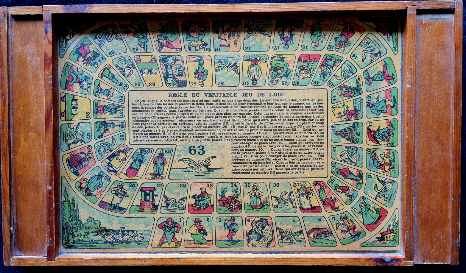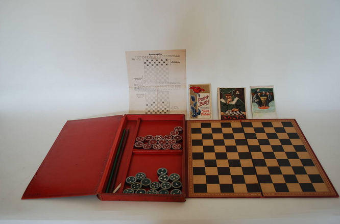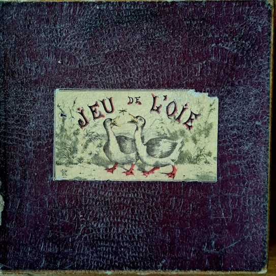 Jeu de l’oie oder Gänsespiel in einer Holzkiste mit in Holzschubern aufbewahrten Spielsteinen und Würfeln wurden voe allem am Beginn des 20. Jahrhundert in Frankreich hergestellt. Während auf einer Seite ein Spielplan mit spiralig angeordneten 63 Feldern und mittig Spielregeln des Gänsespiels angebracht sind, ist auf der Rückseite ein Spielplan für die polnische Dame (mit 10x10 Feldern, in Frankreich zu der Zeit die gebräuchliche Dame-Variante). Die dazu benötigten jeweils 20 weißen und schwarzen Steine befanden sich in den beiden Holzzubern, als Spielsteine für das Gänsespiel wurden Pöppel benutzt.