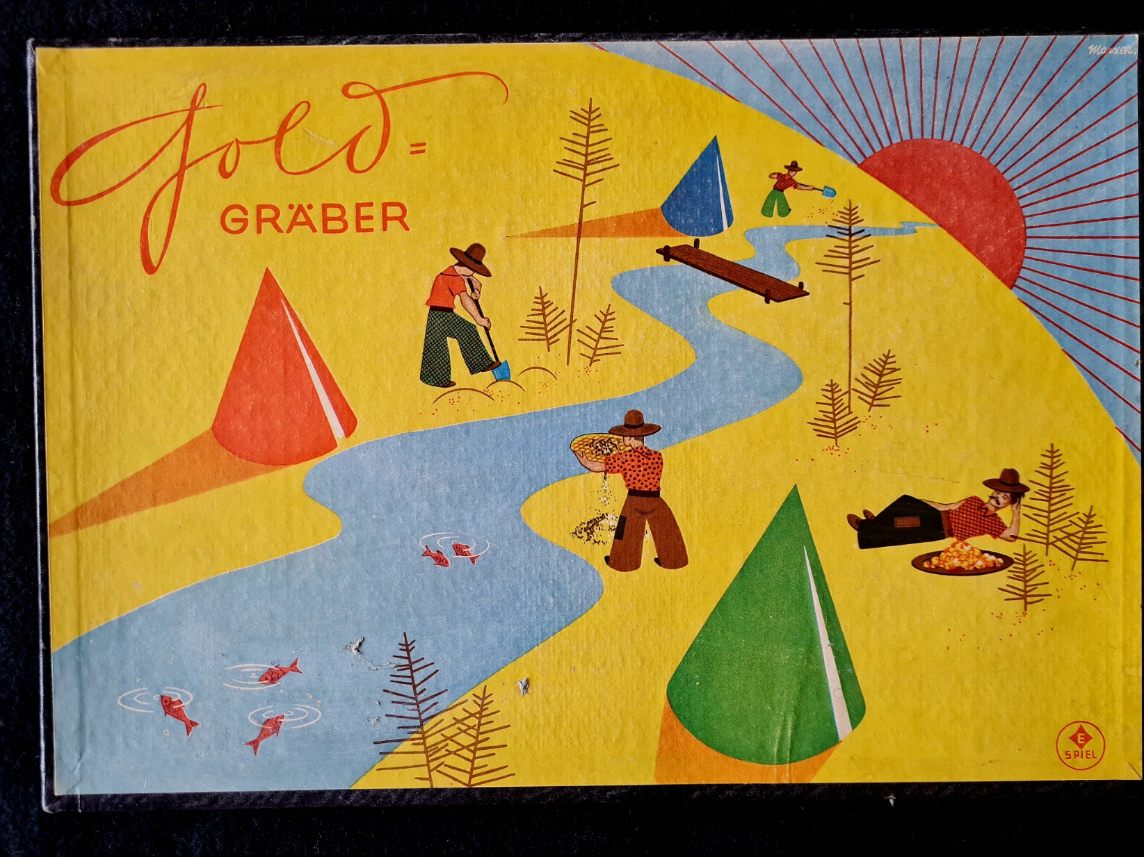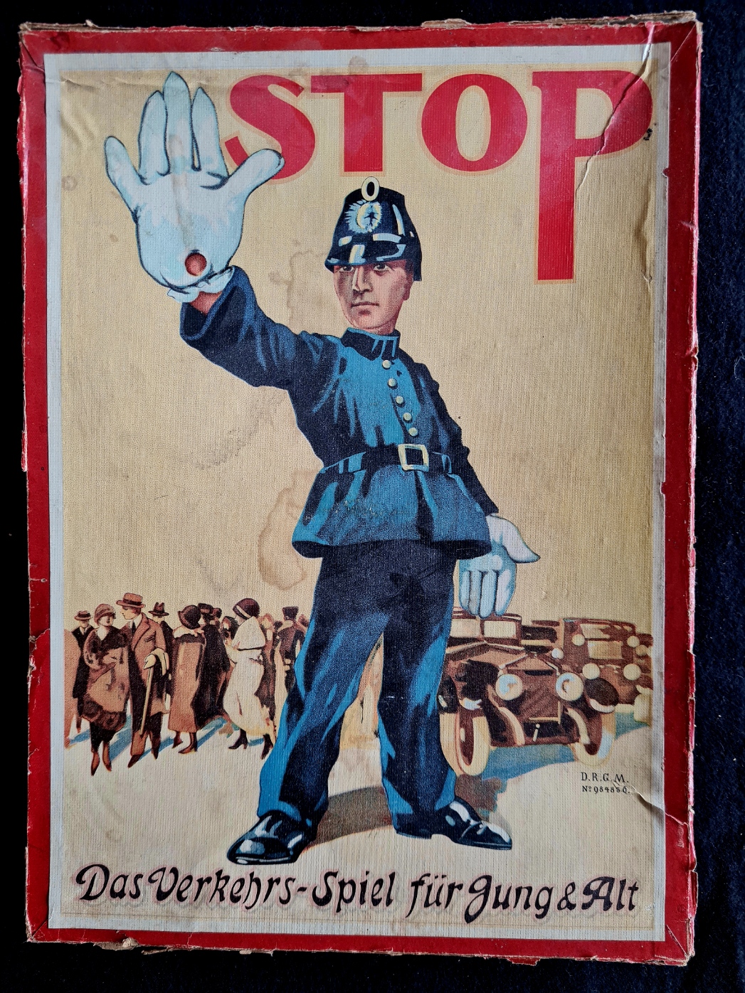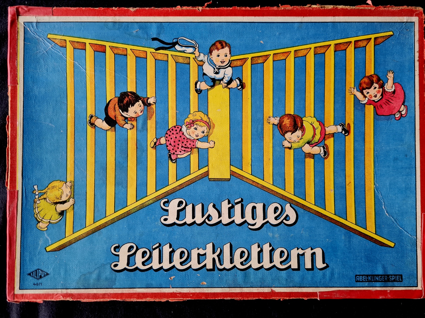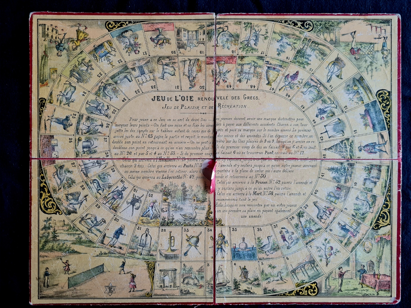 Das Exemplar der Spielesammlung entspricht dem im Internet gezeigten und dürfte vor 1915 entstanden sein. Leider fehlen alle Figuren (Gänse), die Spielschachtel ist relativ gut erhalten, der Spielplan weist leichte Schäden auf, ob der beiliegende kleine Würfel original ist, ist fraglich.