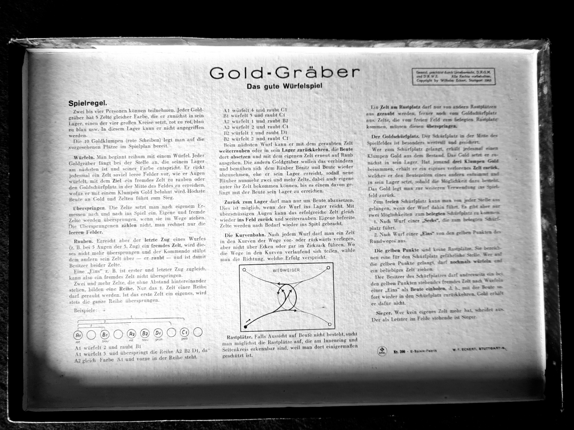 Ab 1931 war Wilh. F. Eckert wohnhaft in der Gartenstraße 14 in Zuffenhausen. In seiner Fabrik war er dort als Bonbon- und Schokoladenhersteller tätig. 1938 zog er dann samt seiner Fabrik in die in der Sachsenstraße 14 in Zuffenhausen um. 1941 erweiterte er sein Geschäft, indem er auch Spielwaren herstellte. Unter anderem stammt das Brettspiel „Tippel-Brüder“ von ihm. https://www.spiele-check.de/page.php?page=publisher_profile&pubid=3578 Bis einschließlich 1944 ist der Fabrikant Wilh. Eckert bisher nachweisbar, weil zum Beispiel das Spiel “Tippel-Brüder” aus dem Jahr 1944 ist.