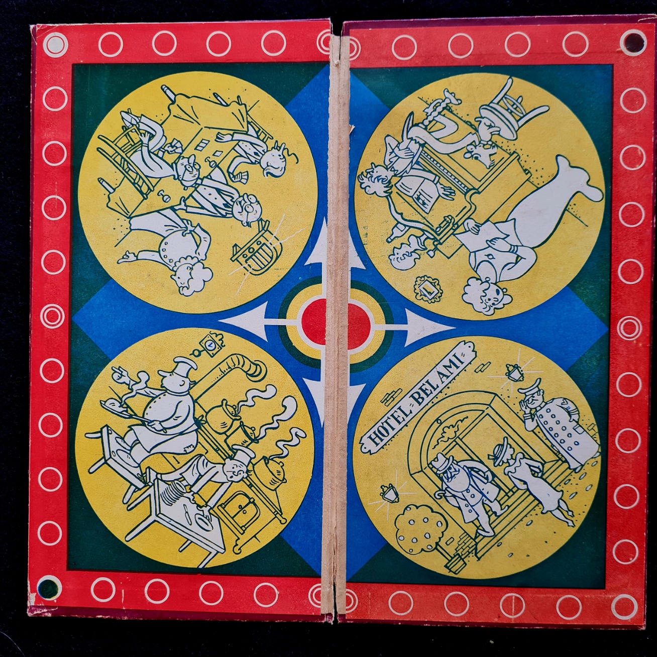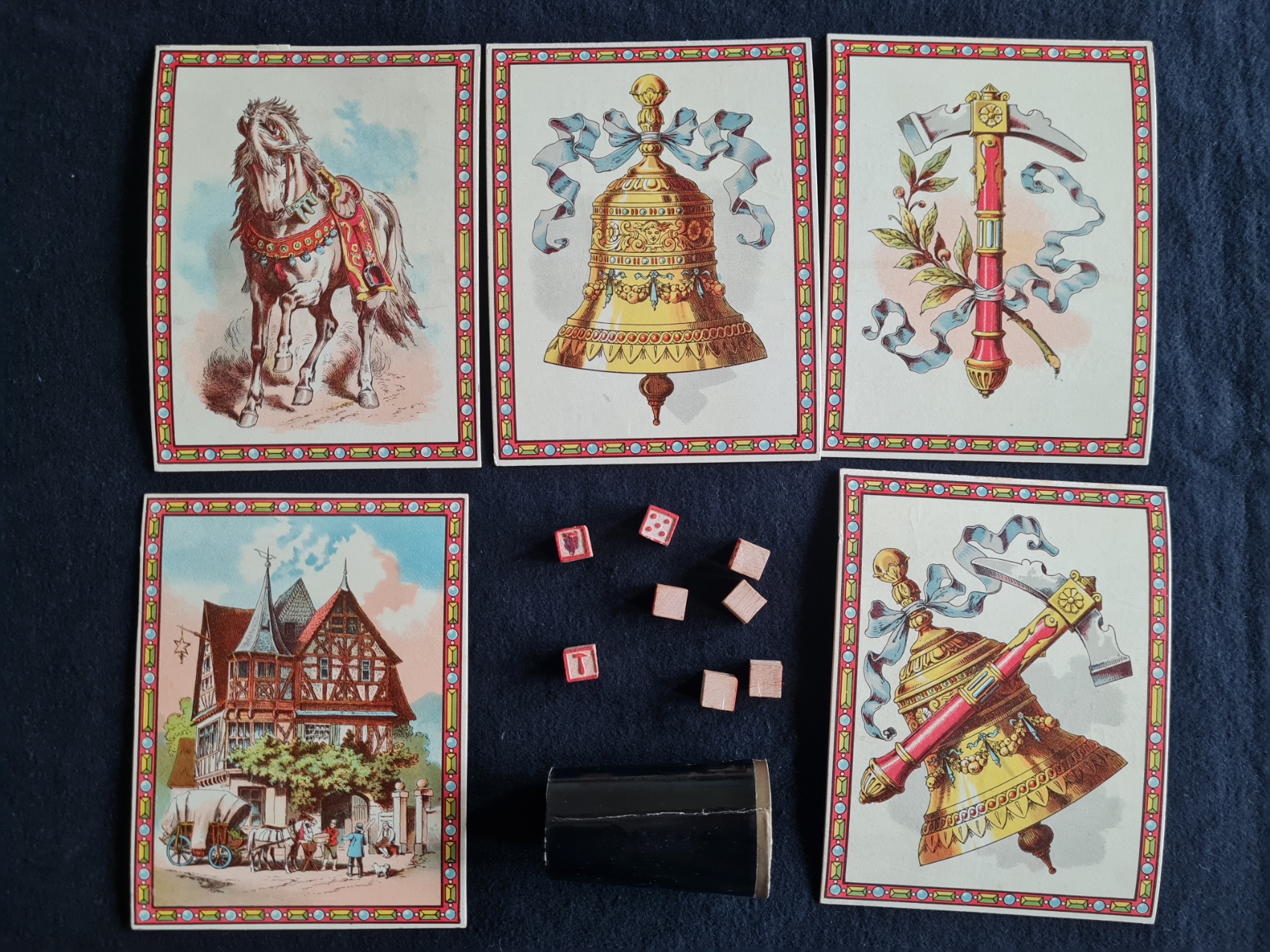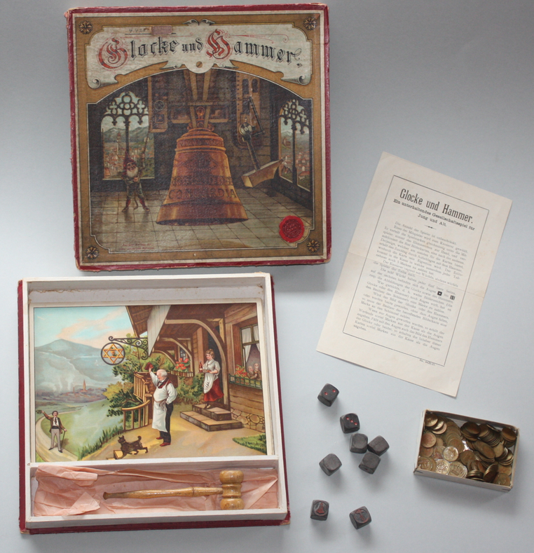 Im Bild oben in der Schachtel liegt die Karte “Gasthof”. Das Schild zeigt einen Davidstern in dem ein Kelch prangt. Tatsächlich ist überliefert, dass “Glocke und Hammer” häufig abends beim Chanukka-Fest gespielt wurde. Offensichtlich wurde bei dieser Prachtausgabe bei der Gestaltung darauf Wert gelegt, auch wohlhabende, jüdische Käufer anzusprechen.
