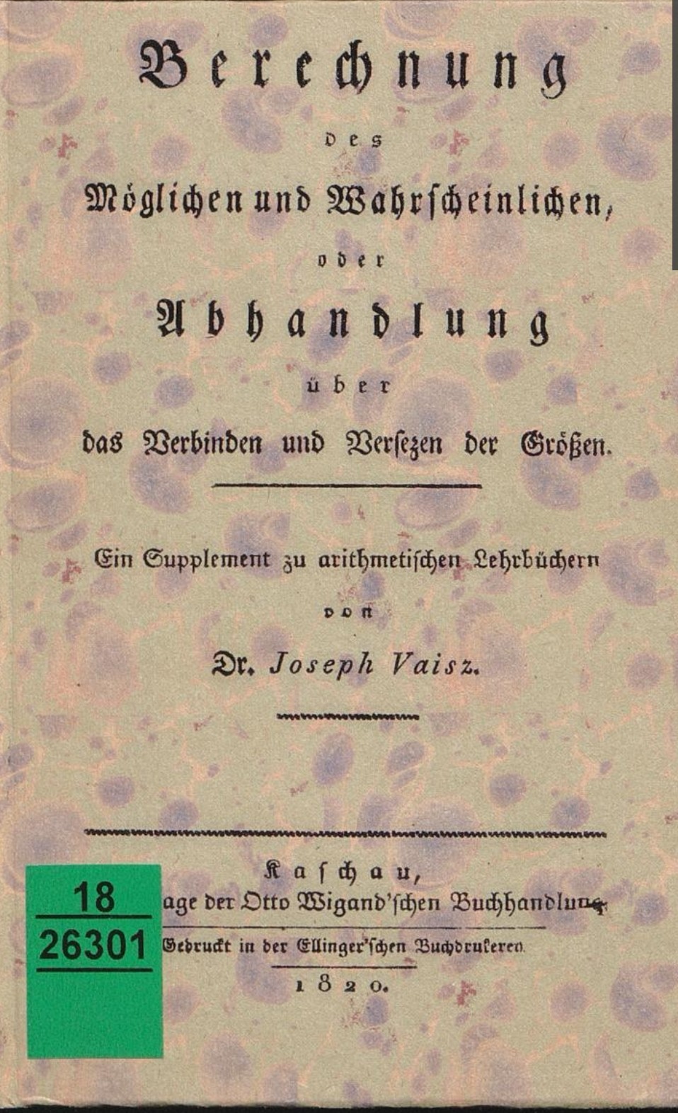 Die erwähnte Veröffentlichung (Ein Supplement zu arithmetischen Lehrbüchern von Dr. Joseph Vaisz mit dem Titel Berechnung des Möglichen und Wahrscheinlichen, oder Abhandlung über das Verbinden und Versezen der Größen) aus dem Jahr 1820 (!) https://sammlungen.ub.uni-frankfurt.de/sdd/content/titleinfo/9909561 ist nicht nur für Statistiker interessant. Auf den Seiten 5 bis 14 wird der Theil der Mathematik, welcher sich hiermit beschäftigt, die Lehre von der Verbindung und Versezung der Größen, (de combinatione et permutatione)[heißt] beschrieben, auf den nachfolgenden Seiten wird diese Lehre kurz und praktisch durch Beispiele, die aus dem wirklichen Leben genommem, auf eine Art erklärt, die eine vorläufige Kenntniß der Buchstabenrechnung eben nicht voraussezt.