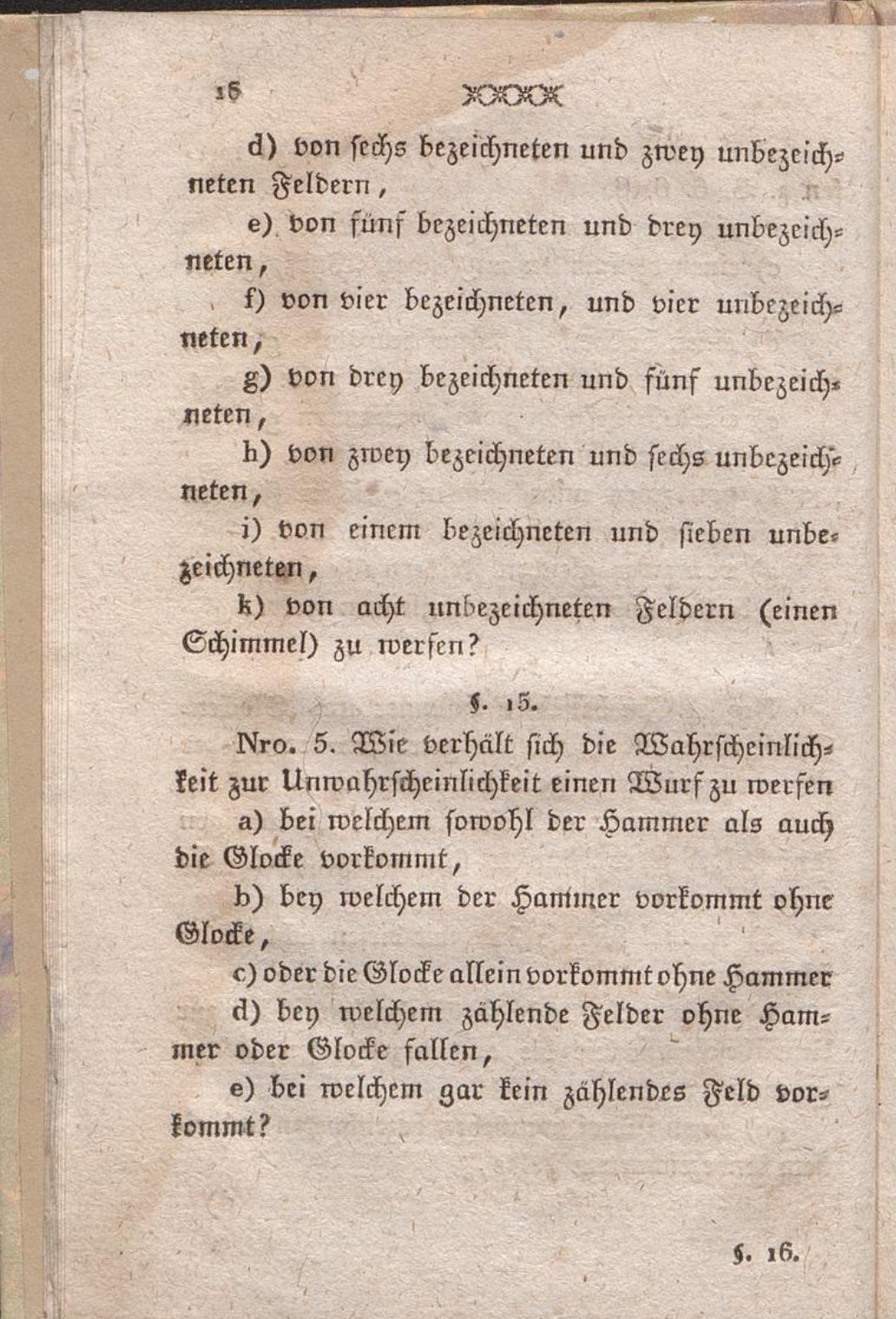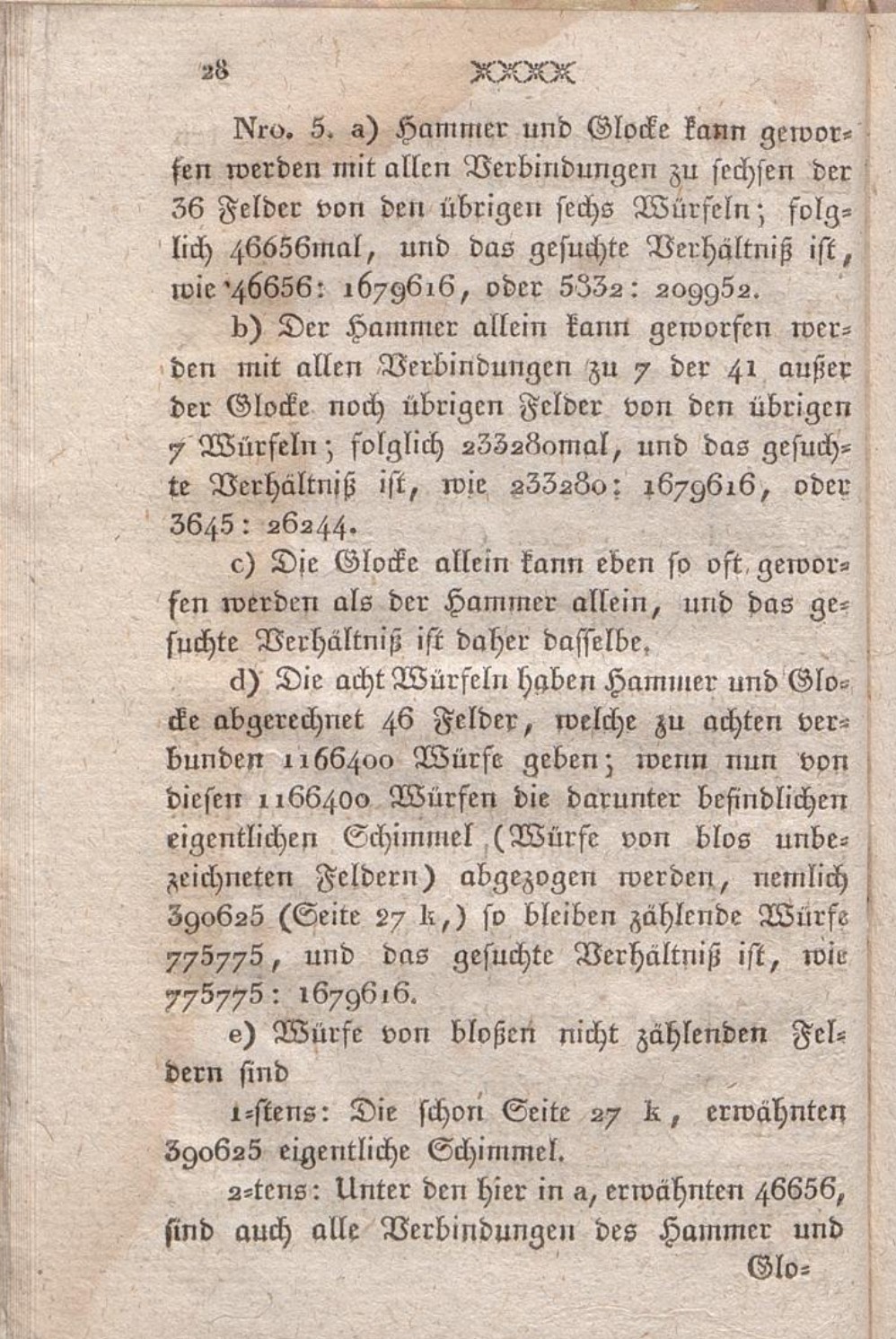 Nro. 4. Im beliebten Hammer und Glocken-Spiele wird mit 8 Würfeln geworfen deren jeder nur ein bezeichnetes Feld hat, nemlich 1. 2. 3. 4. 5. 6. ein Hammer und eine Glocke, die übrigen Felder jedes Würfels sind unbezeichnet.