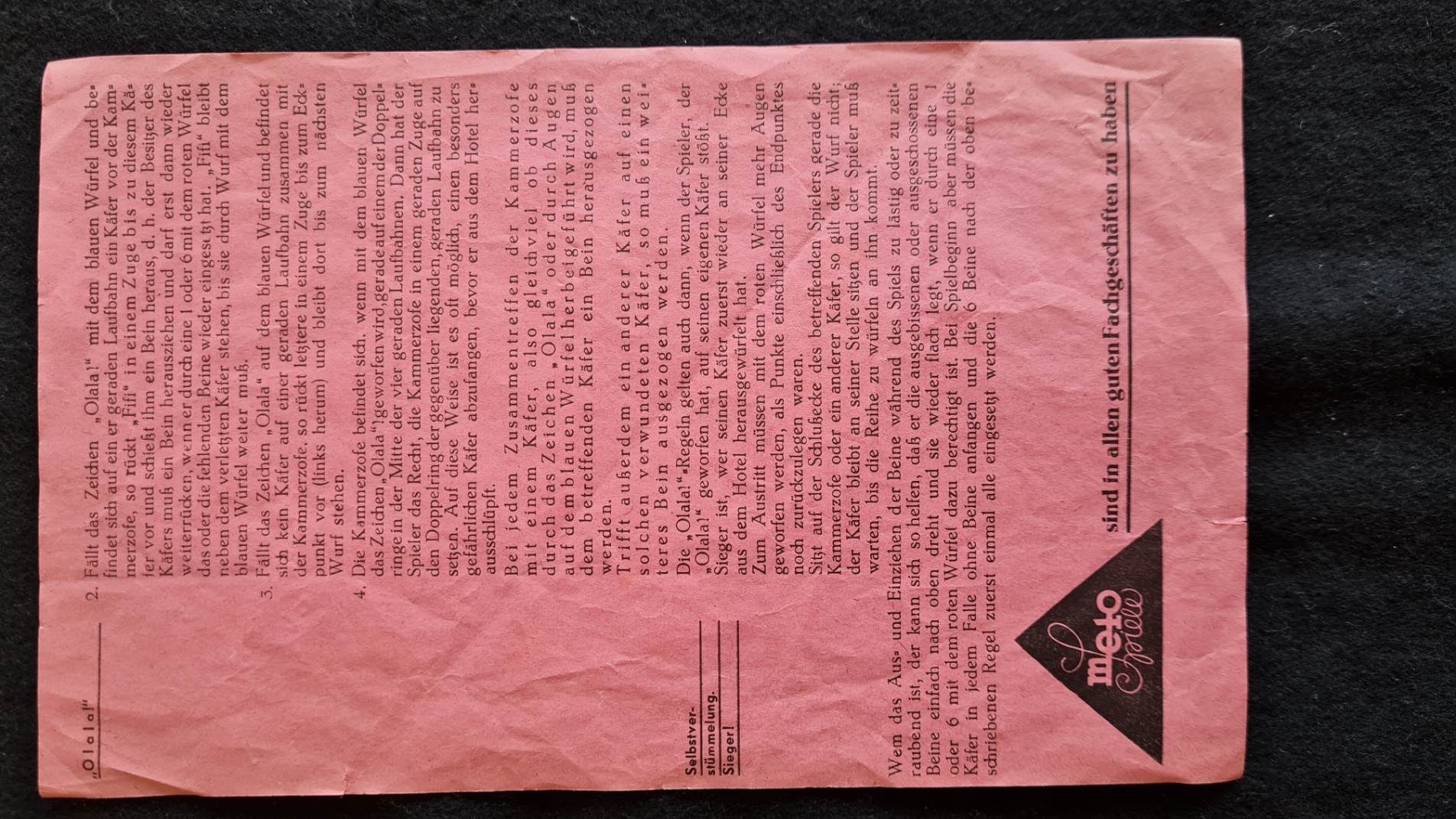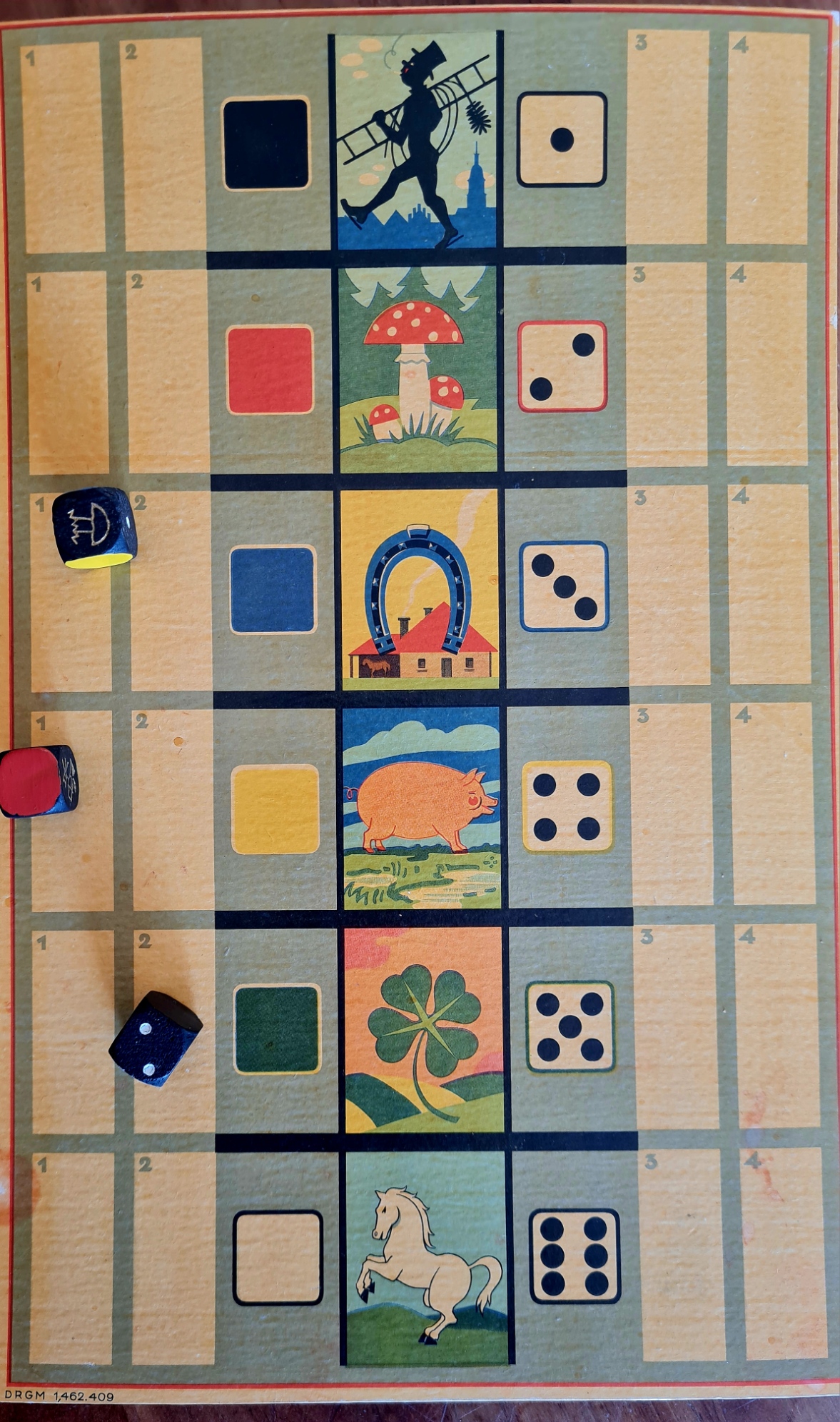 Das Sammlungsexemplar ist sehr gut erhalten, die sechs Seiten der drei Würfel stellen jeweils zwei unterschiedliche Zahlen, Symbole und Farben dar. Lediglich die Originalspielmünzen fehlen. Es handelt sich um ein reines Glücksspiel für maximal vier Spieler. Die auf der Deckelinnenseite aufgeklebte Spielanleitung ist mit der Angabe von Gewinnquoten sehr interessant. Bei genauere Analyse zeigt sich, dass