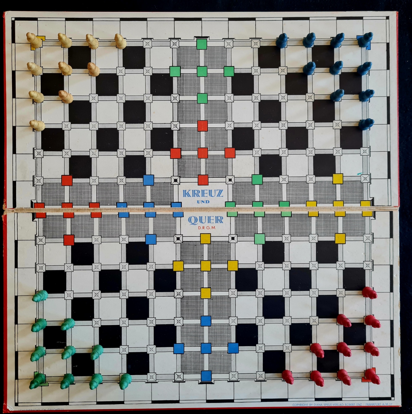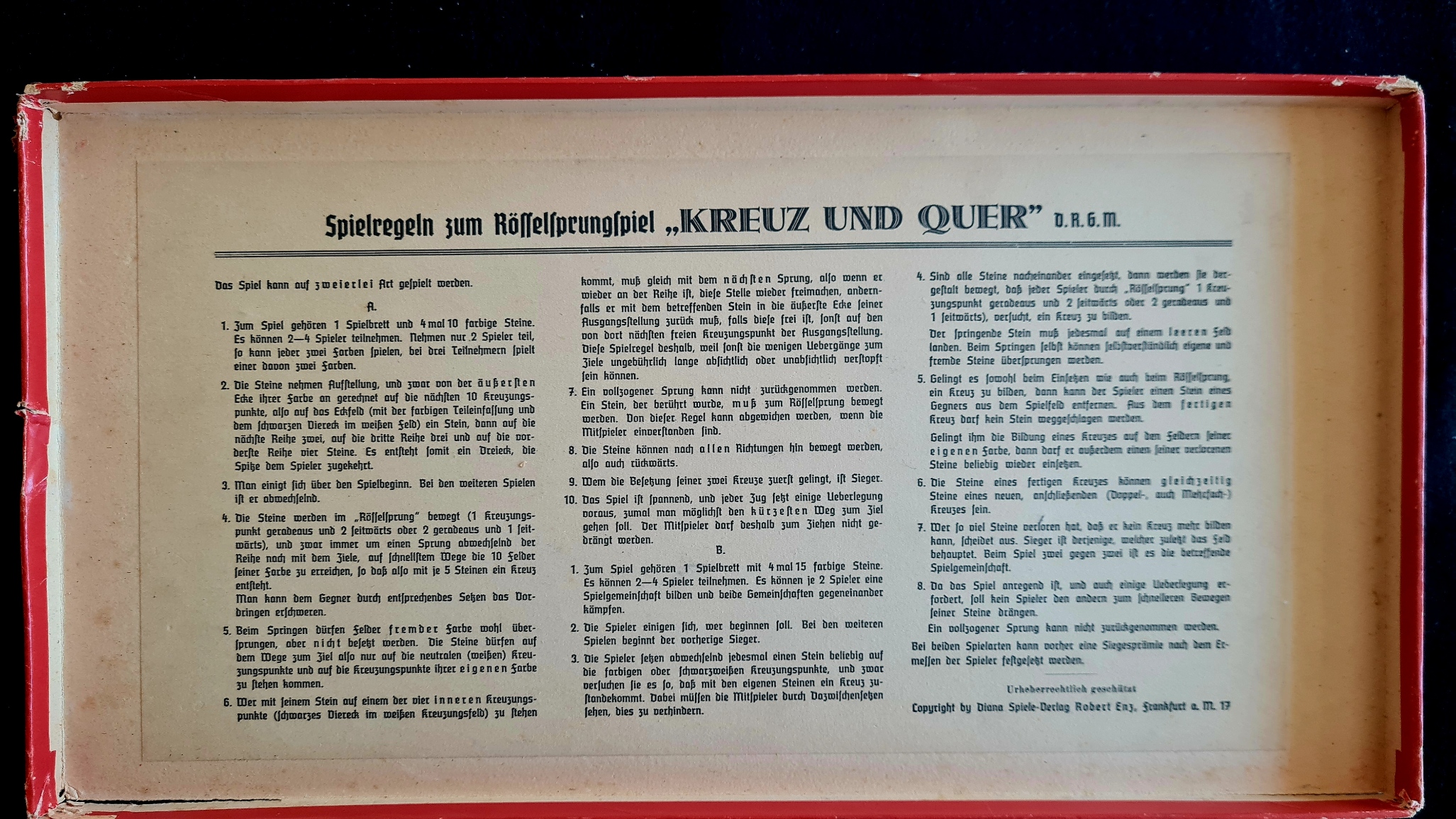 Für das Rösselsprungspiel Kreuz und Quer sind Spielregeln für zwei verschiedene Spielweisen A und B auf der Deckelinnenseite abgedruckt, jeweils für 2 - 4 Spieler. Spielplan und Spielfiguren des vorhandenen Exemplars sind gut erhalten; lediglich 2 grüne Steine fehlen (nur nötig für Spielvariante B mit vier Spielern).