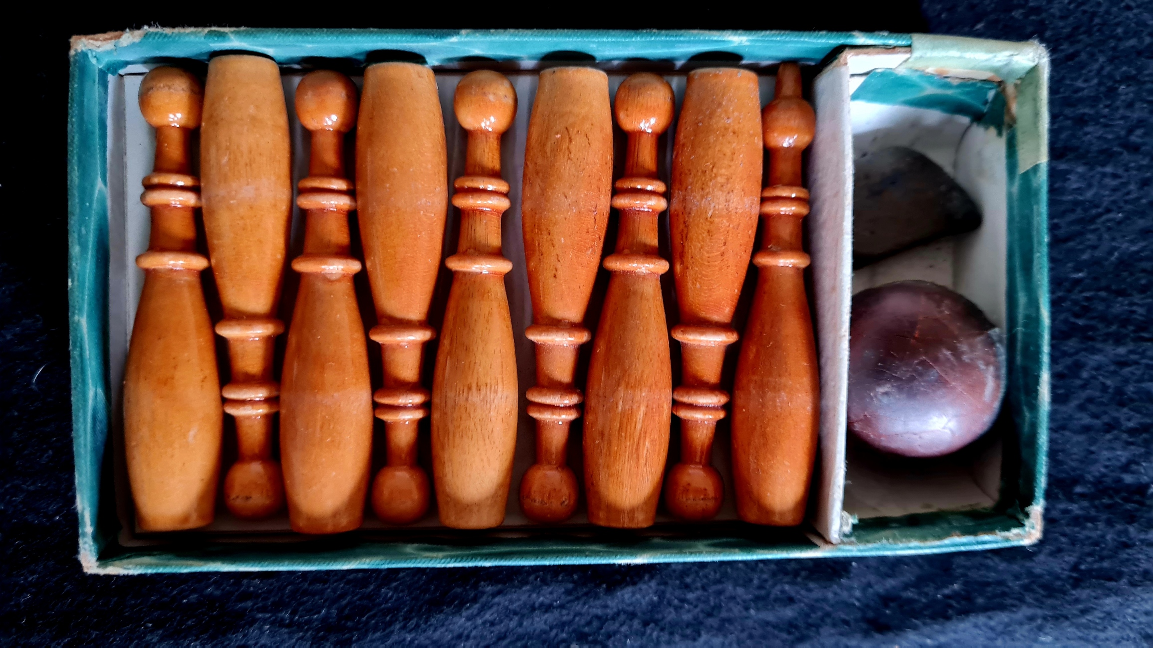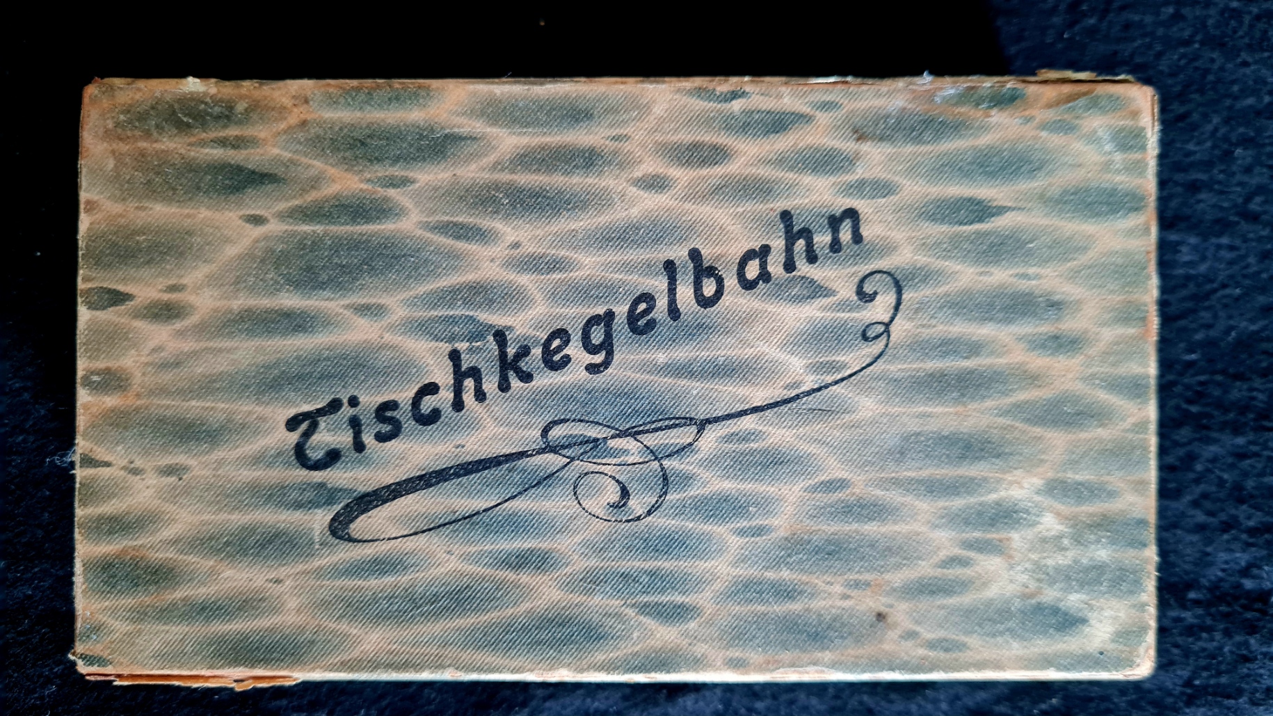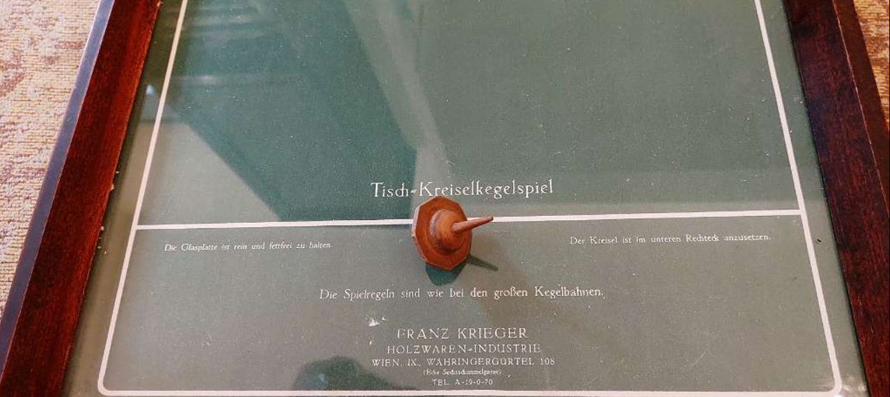 Kleine Tischkgelspiele wurden lange Zeit in vielen Varianten(einfach feiner Luxus) angeboten. Die beiden vorhandenen Exemplare sind vollständig, die Kugel der Tischkegelbahn ist defekt.