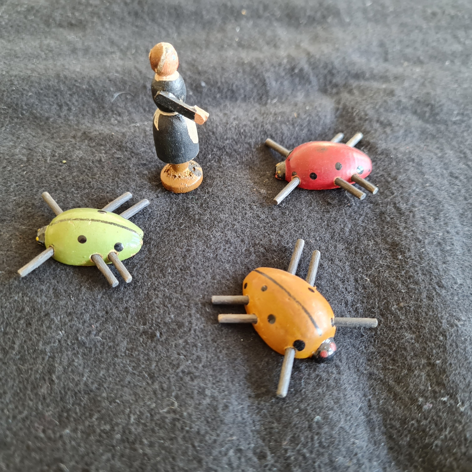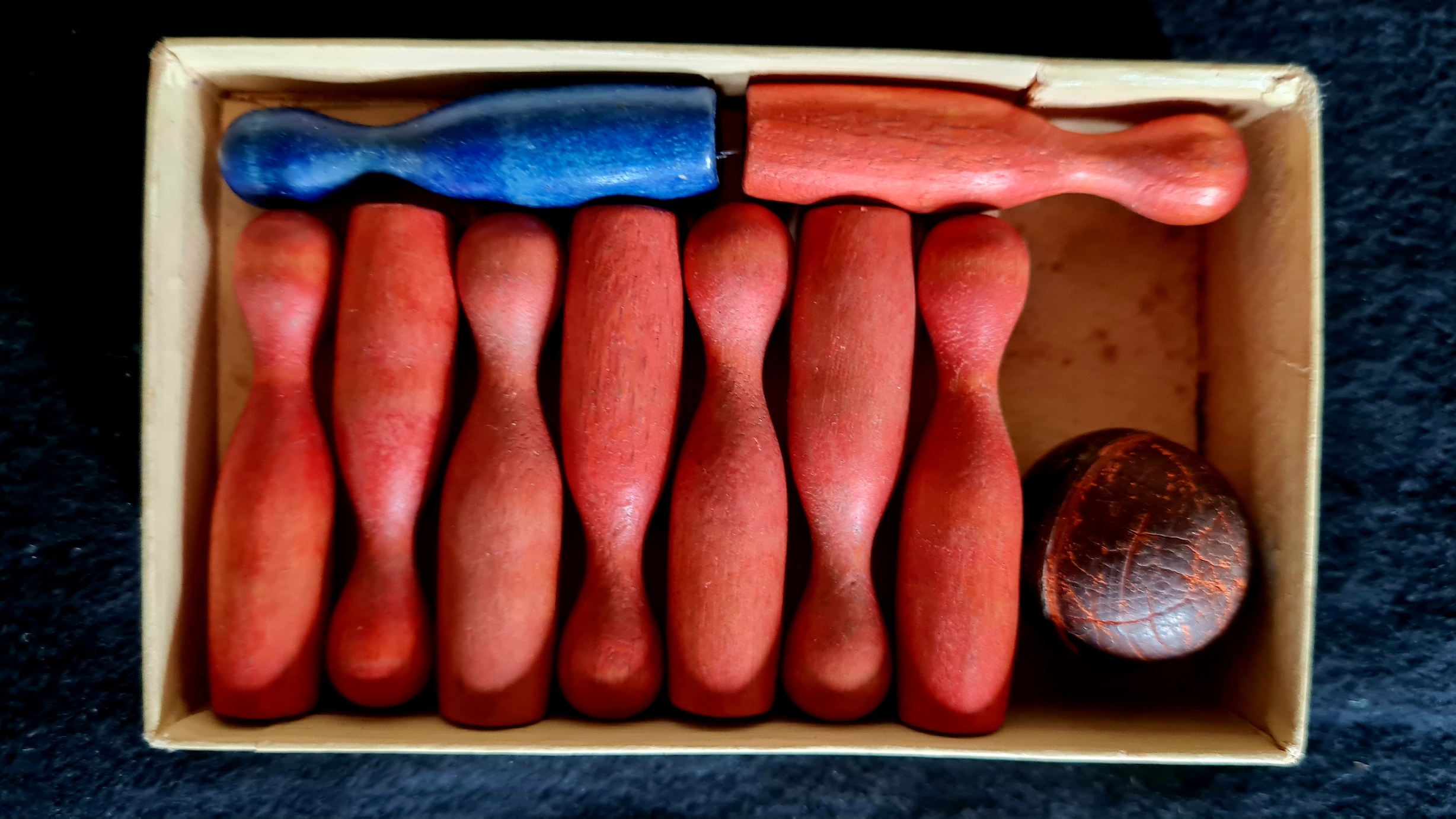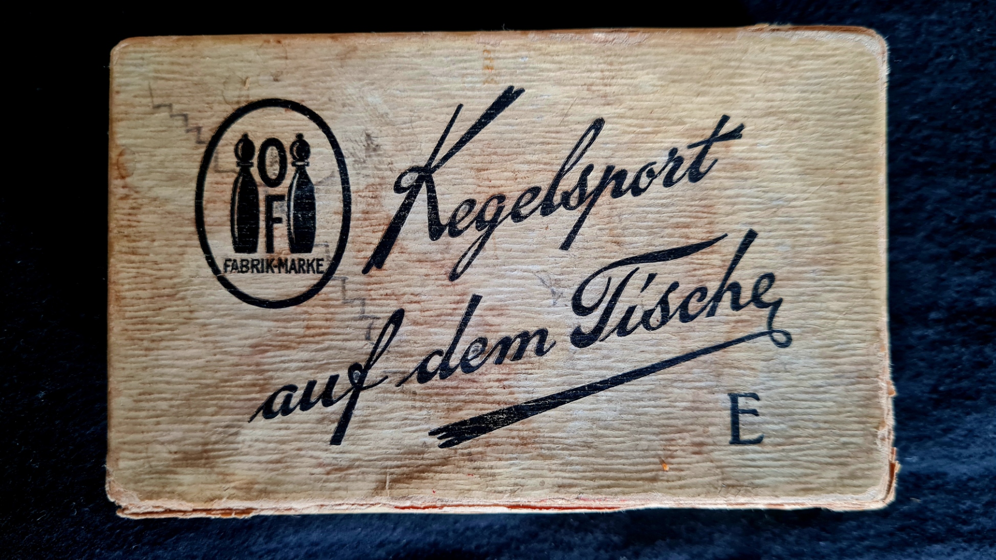 Kleine Tischkgelspiele wurden lange Zeit in vielen Varianten(einfach feiner Luxus) angeboten. Die beiden vorhandenen Exemplare sind vollständig, die Kugel der Tischkegelbahn ist defekt.