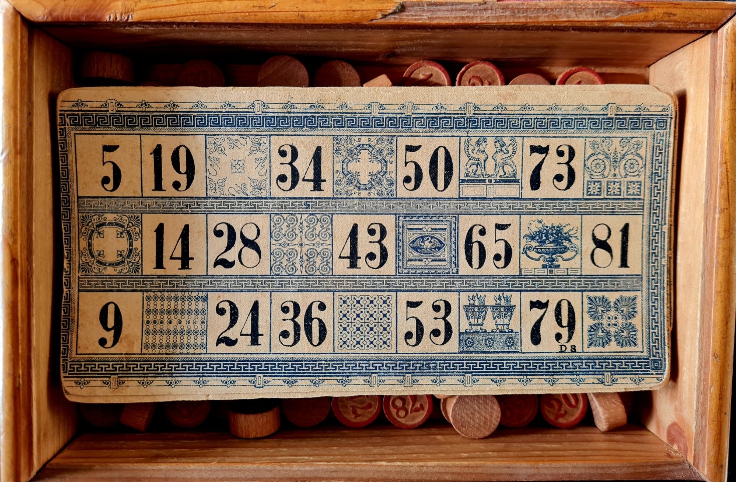 Die sehr schön gearbeitete Holzkiste enthält 18 gut erhaltene Lottotafeln (vollständig). Diese bestehen aus drei Serien von jeweils 6 Kartons mit drei Reihen von fünf Zahlen. Jede Serie ist so gestaltet, dass die Zahlen 1 bis 90 jeweils einmal auftreten (6 x 3 x 5).