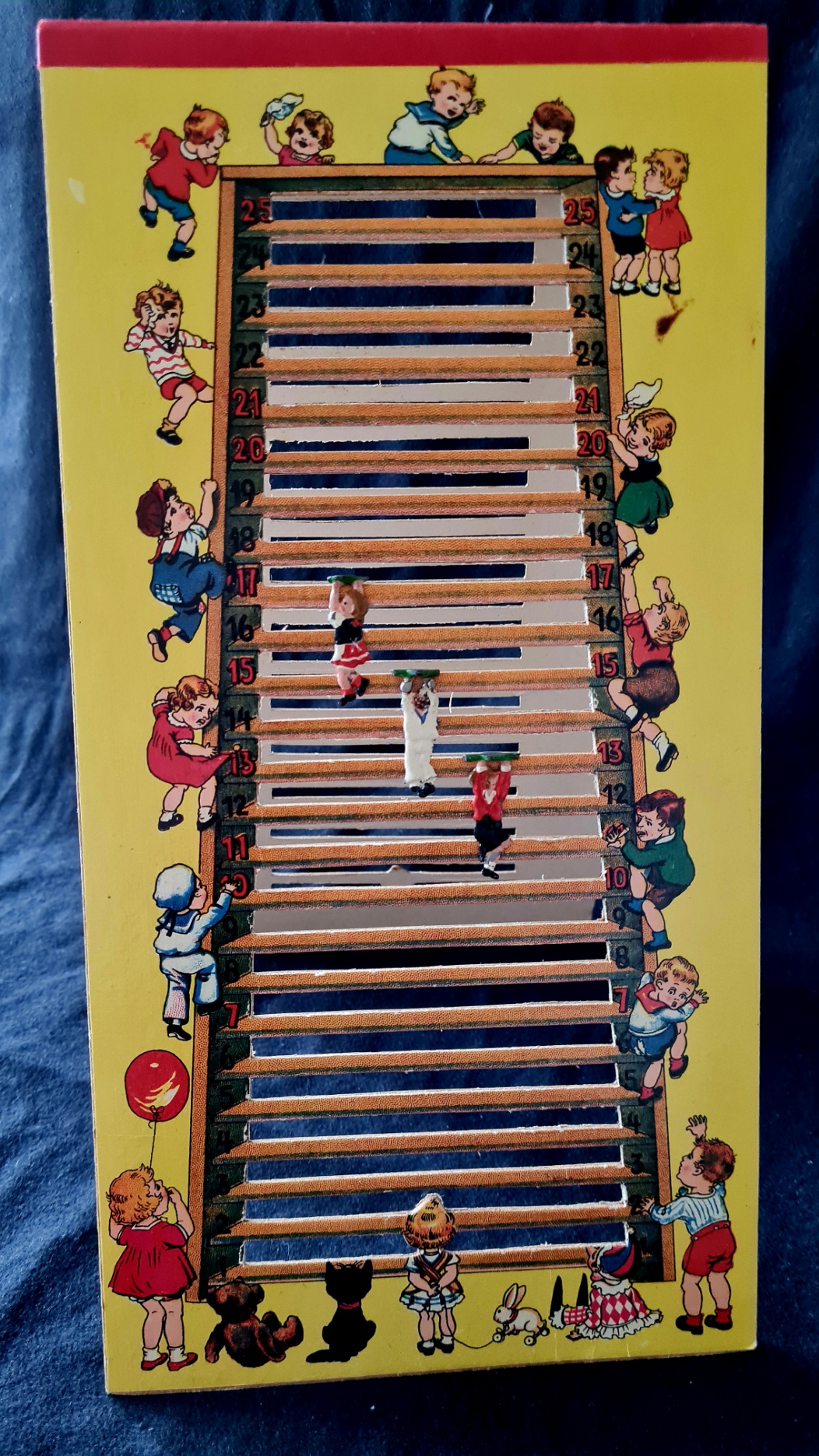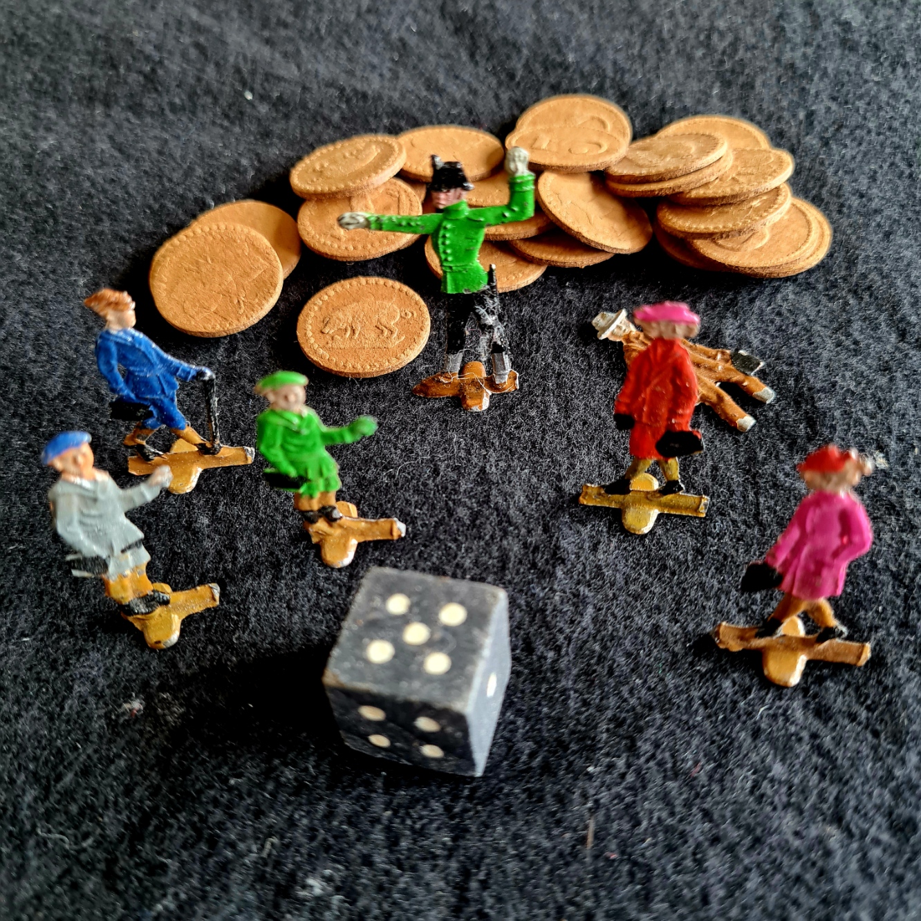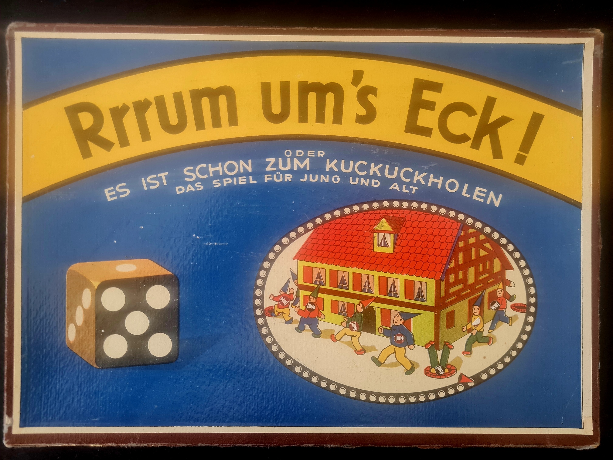 Dennoch wurde das vorliegende Exemplar einem kleinen Mädchen geschenkt und intensiv bespielt. Die Spuren des Gebrauchs sind deutlich erkennbar: die Würfel sind abgegriffen, die Münzen an den Stellen ankorrodiert, wo vieler Finger Abdruck ihre Spuren ließen. Doch ist die Schachtel gepflegt, die Spielanleitung ohne Knick, der Auktionshammer ruht auf Seidenpapier. Und so erzählt das Spiel noch eine Menge mehr: es wurde als wertvoll erachtet – und trotzdem benutzt.