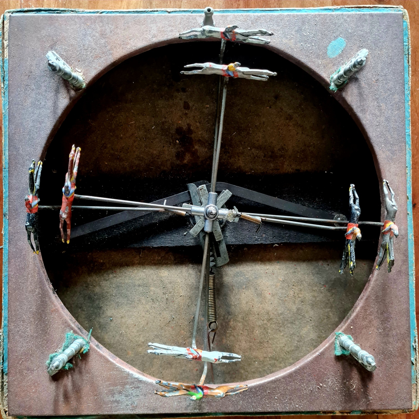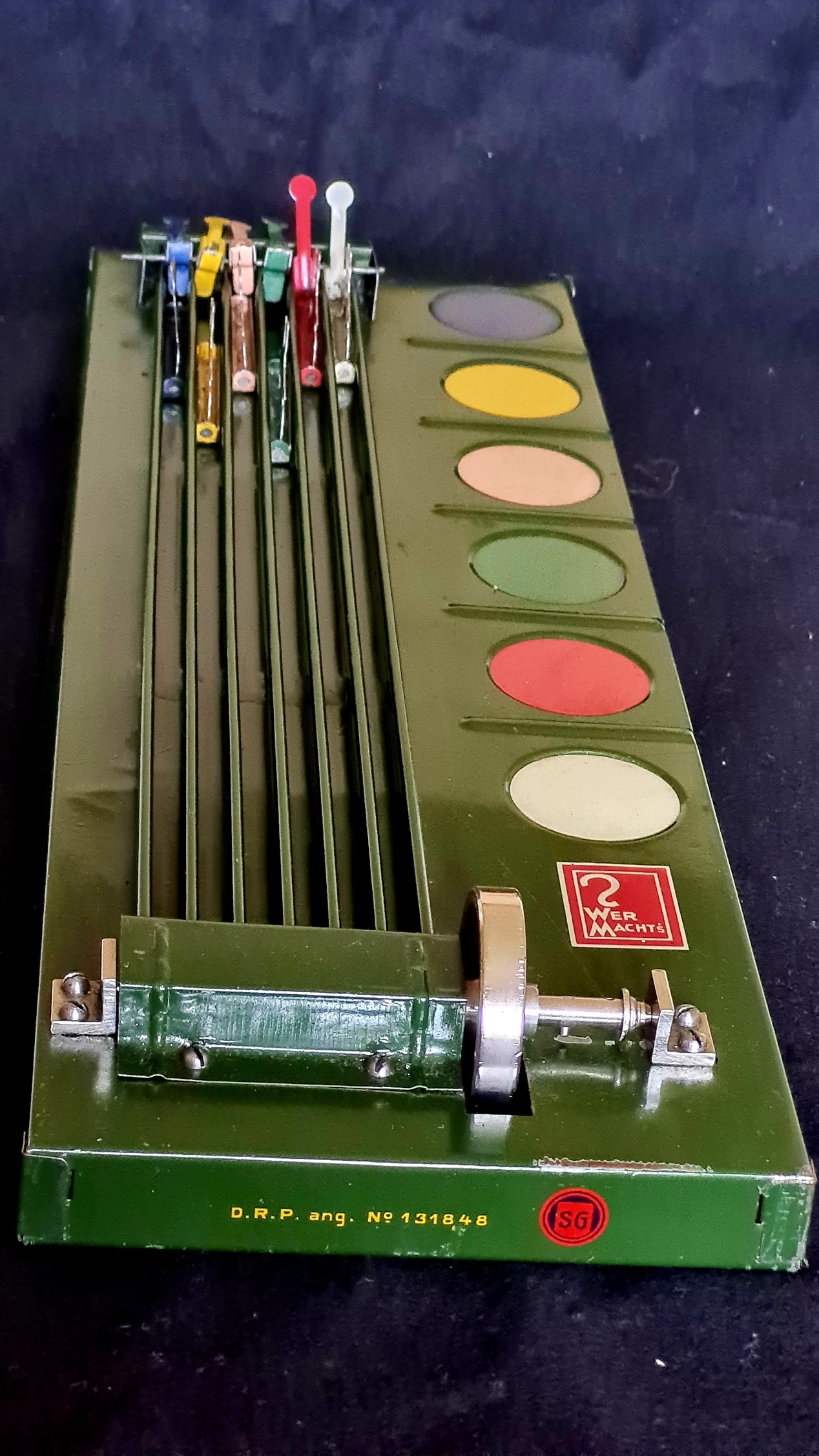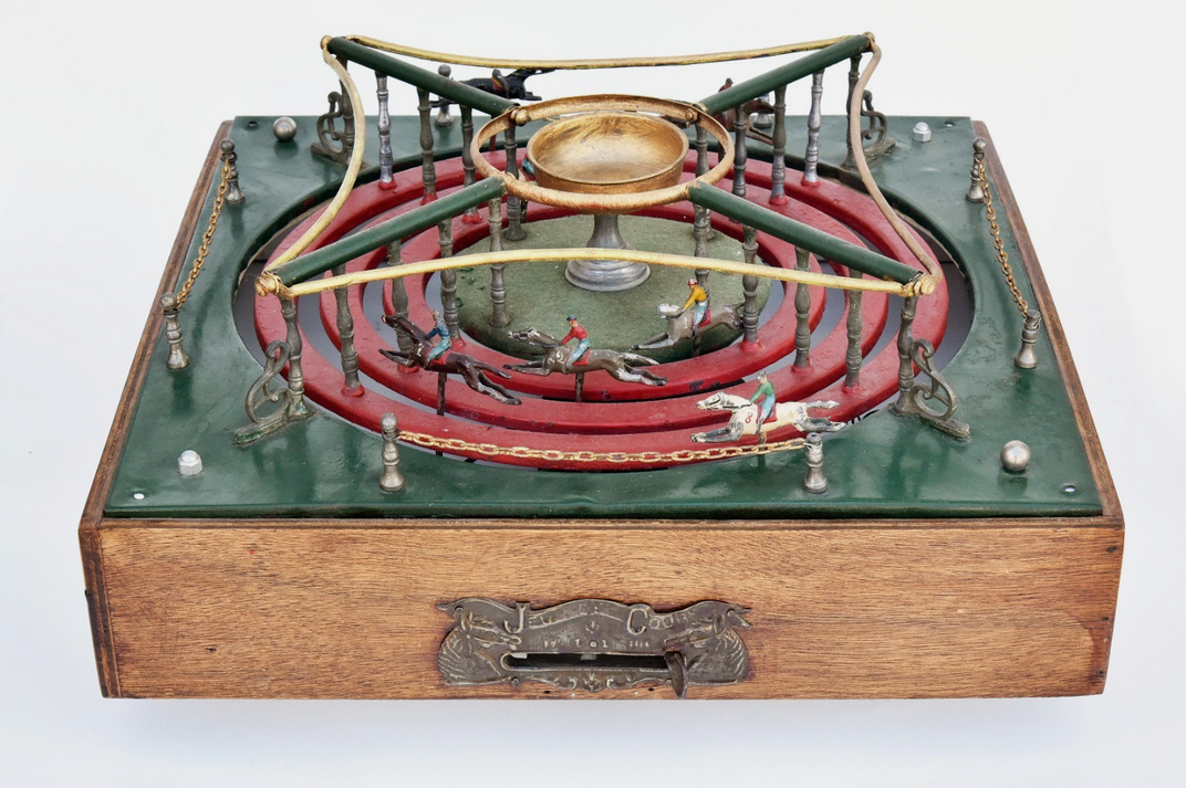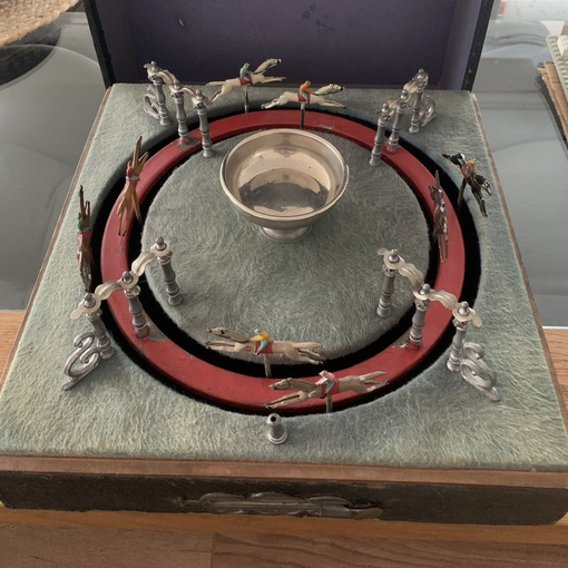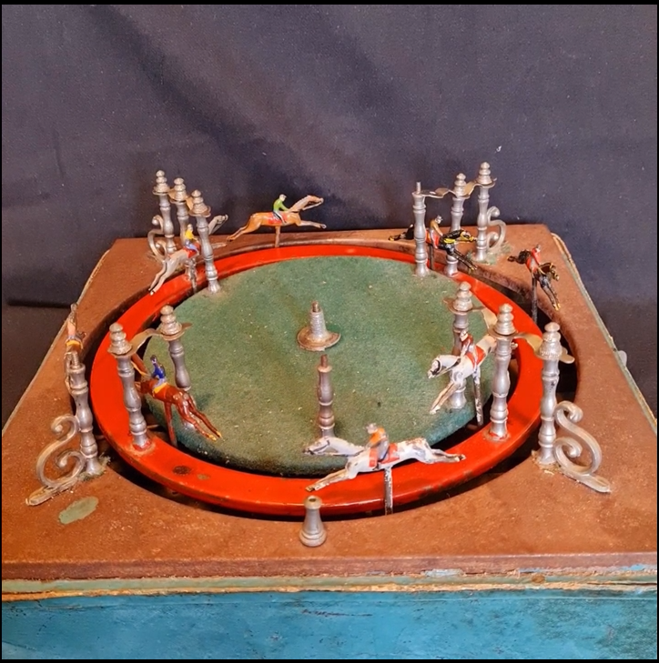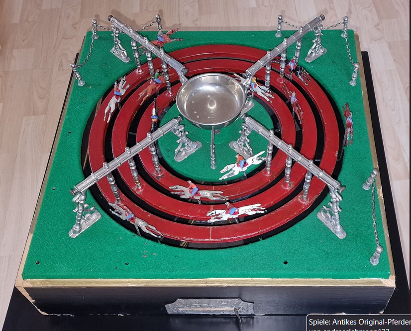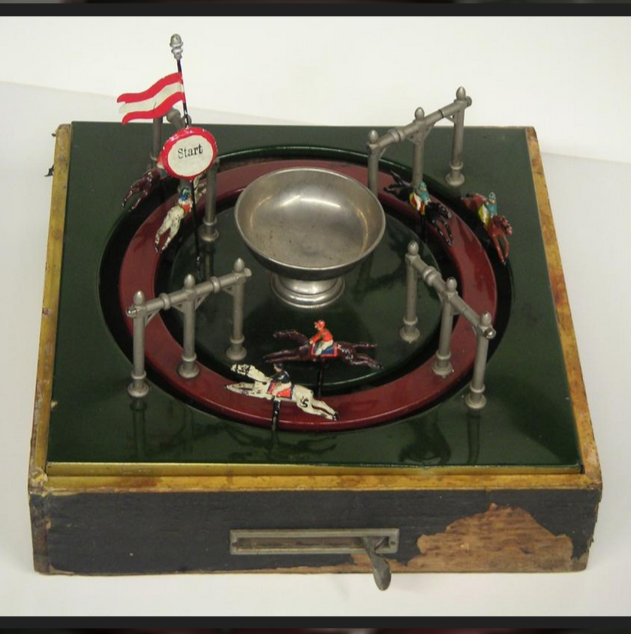 So ist es nicht verwunderlich, dass es mehrere Firmen gibt, die zu Beginn des 20. Jahrhunderts mechanische Pferdewettrenn-Spiele im Angebot hatten. Dabei sorgt ein aufwändig konstruiertes Räderwerk, das mit einem Kniehebel-Antrieb versehen ist für einen (fast) perfekten Zufallsgenerator.