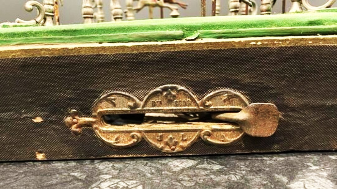 Die französischen Inschriften auf der Detailaufnahme lassen sich übersetzt als Patent ohne Garantie der Regierung (oberhalb des Hebels) und als J L (unterhalb des Hebels) interpretieren, wobei die beiden Buchstaben ein Hinweis auf den Hersteller sein dürften.