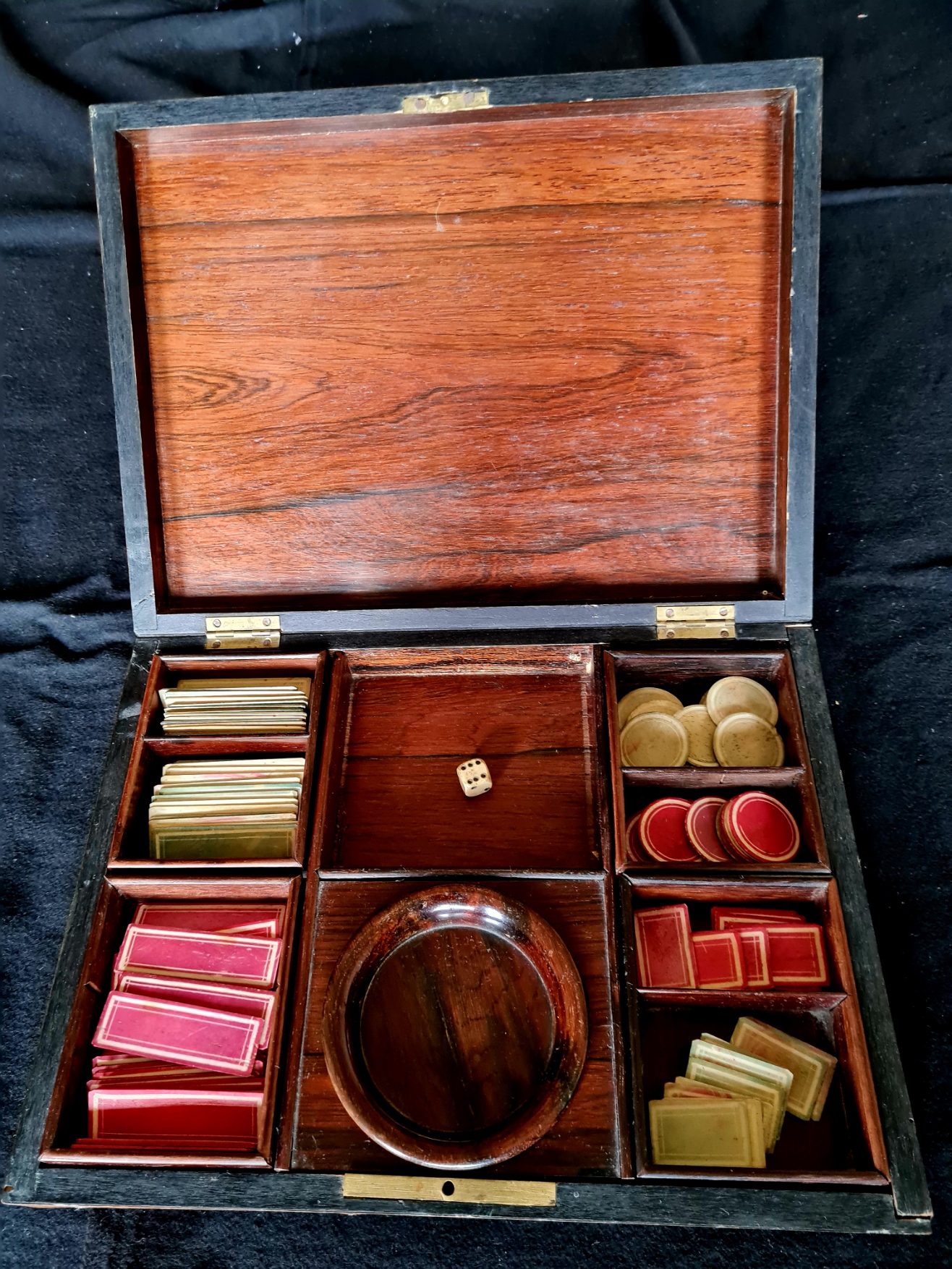 Die Pokerspielbox eines unbekannten Herstellers enthält vier kleinere Holzkistchen mit farbigen Rinderknochen-Spielsteinen in drei verschiedenen Formen (rechteckig länglich, rechteckig und rund) und den Farben rot und grün. Die grünen Plättchen sind teilweise etwas abgeschabt, sodass die rote (Grund-) Farbe durchscheint. Außerdem ist eine runde Holzschale sowie ein Würfel (Bein (Rind)?) enthalten. Das Kartenspiel fehlt.