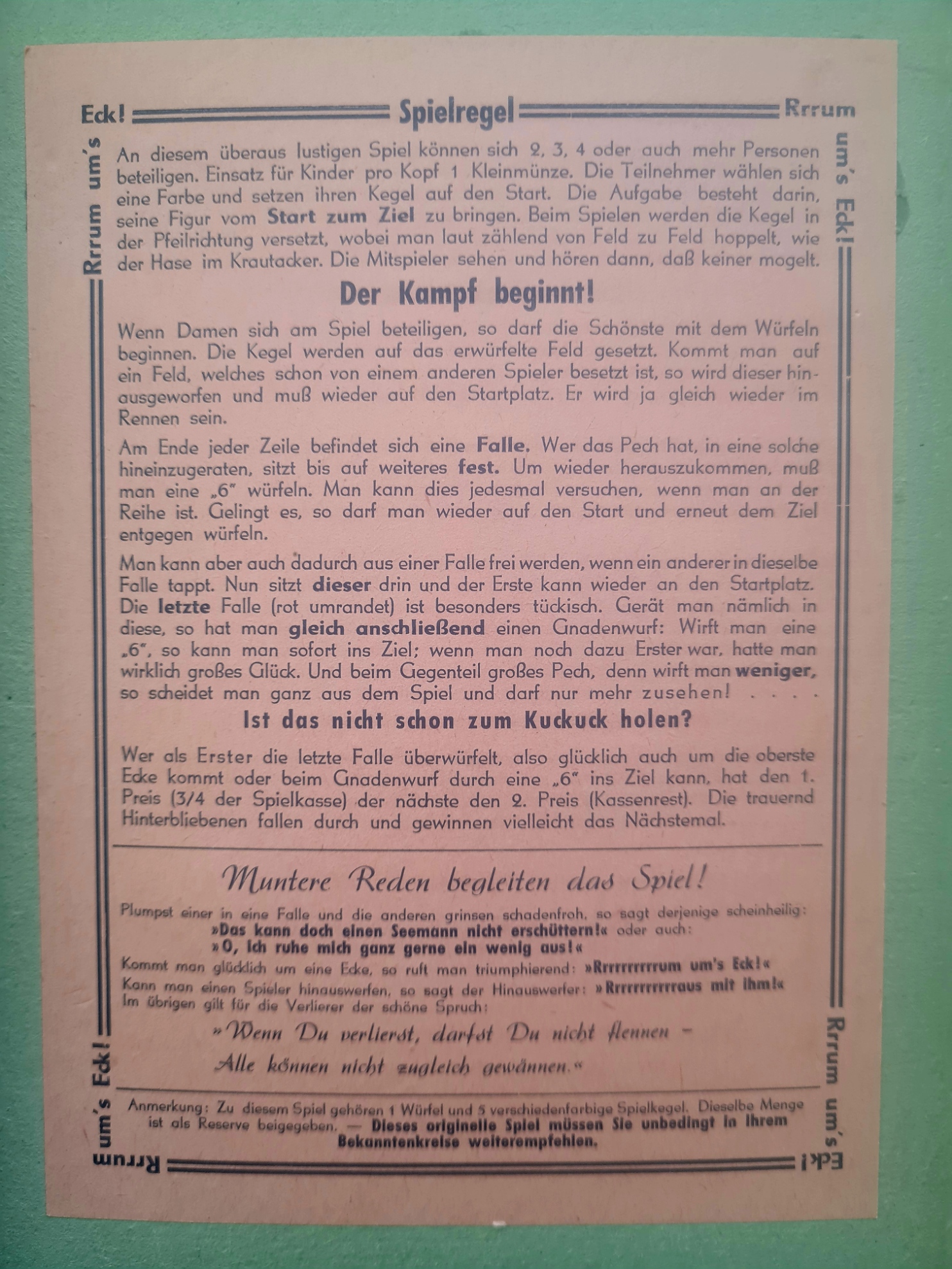 Taktische Möglichkeiten ergeben sich daher nur durch die Begrenzung der Spieleinsätze (60 Pfennig pro Spieler) und der Kasse (?), sowie der Möglichkeit, sich Geld von der Kasse zu leihen.