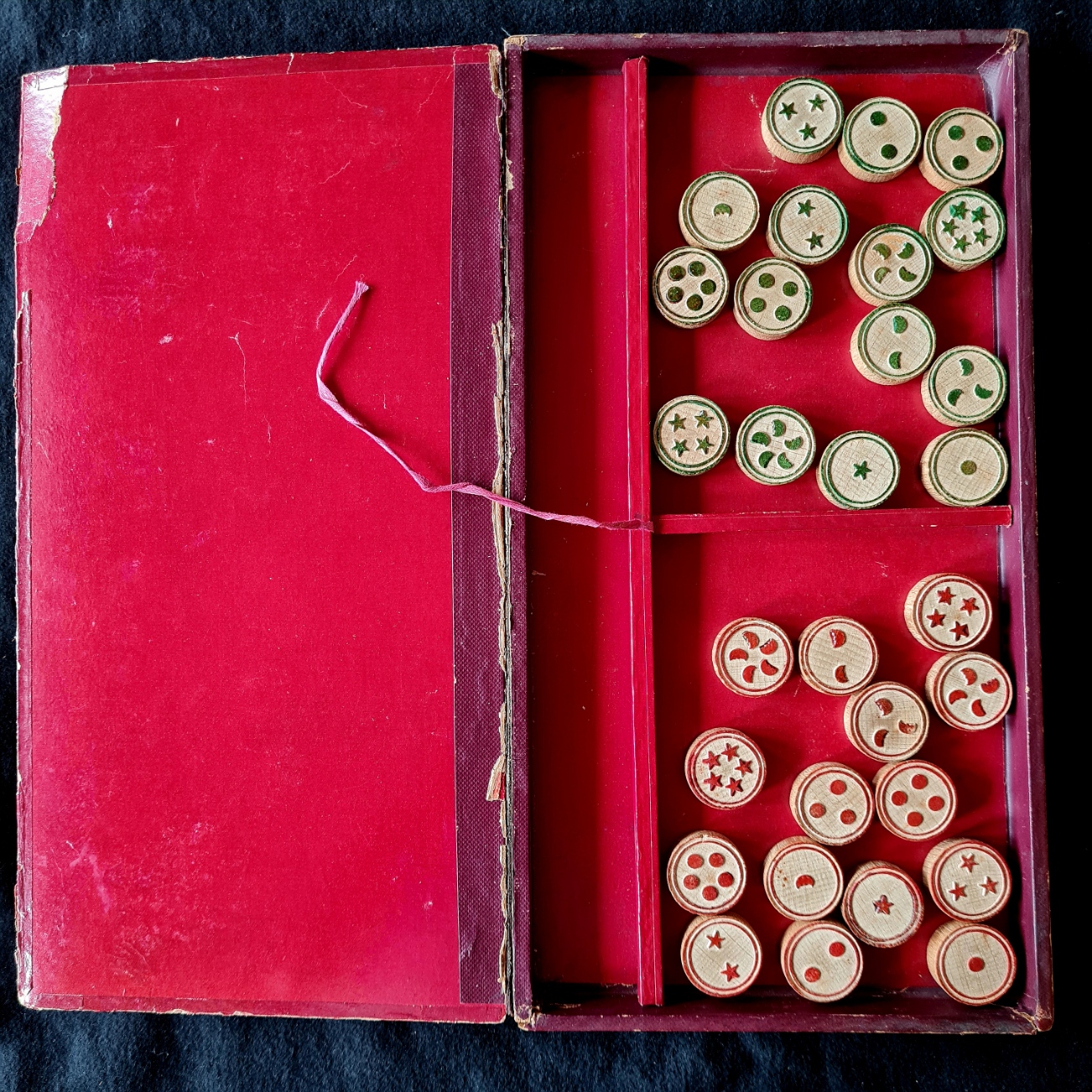 Außerdem enthält sie 90 nummerierte Holzchips (ebenfalls vollständig!). Abdeckplättchen sind keine vorhanden.