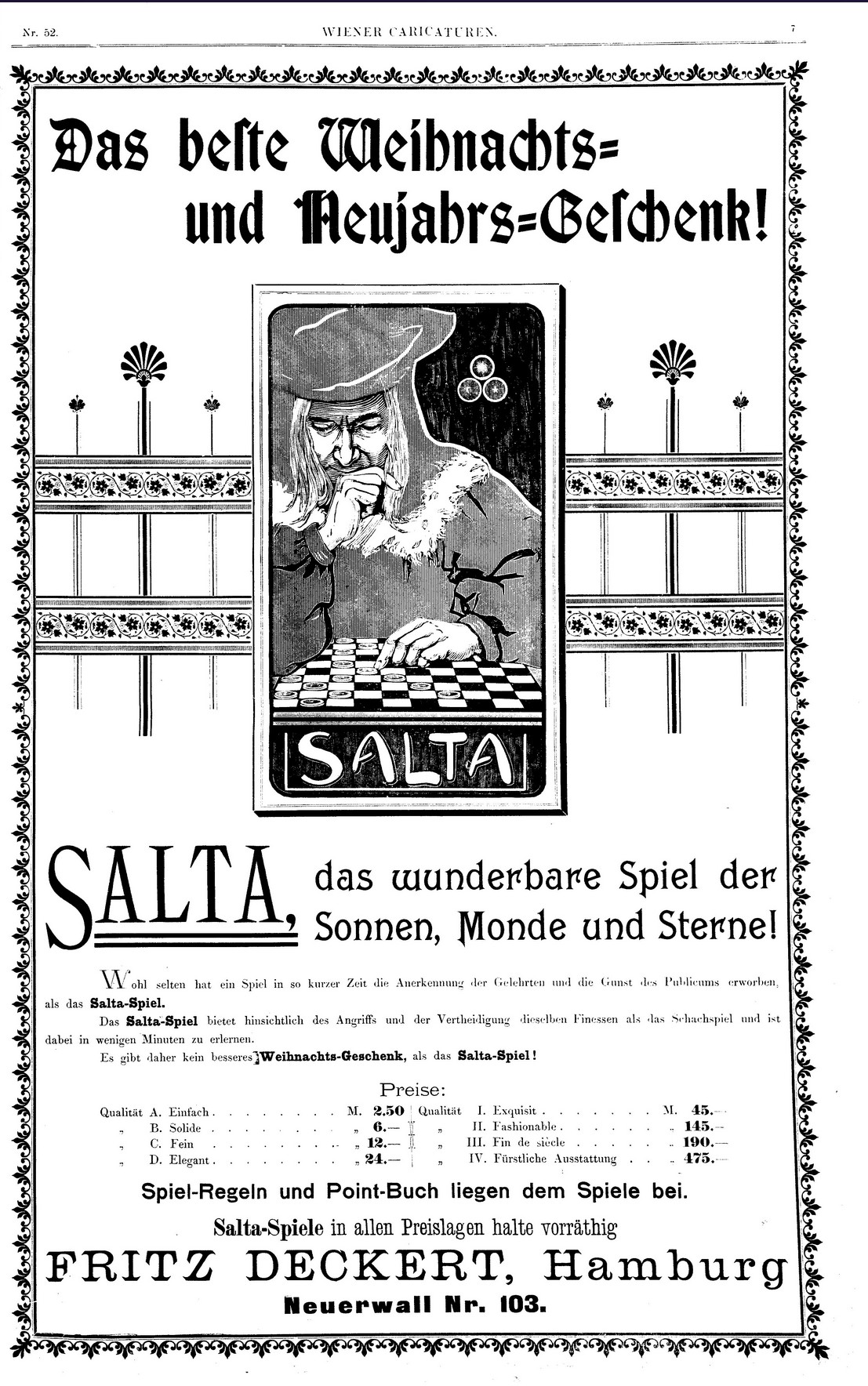 Anzeige vom 24.12.1899 in Wiener Caricaturen Fritz Deckert, Hamburg