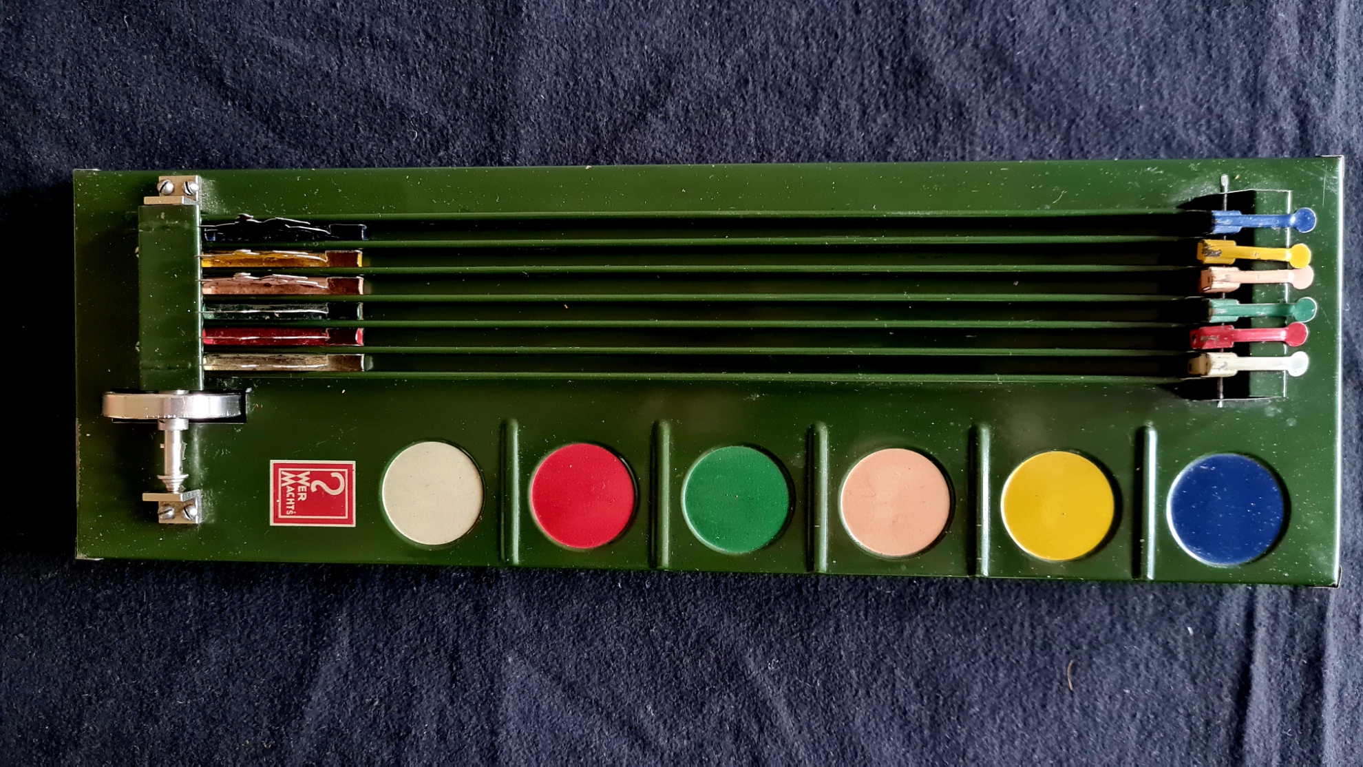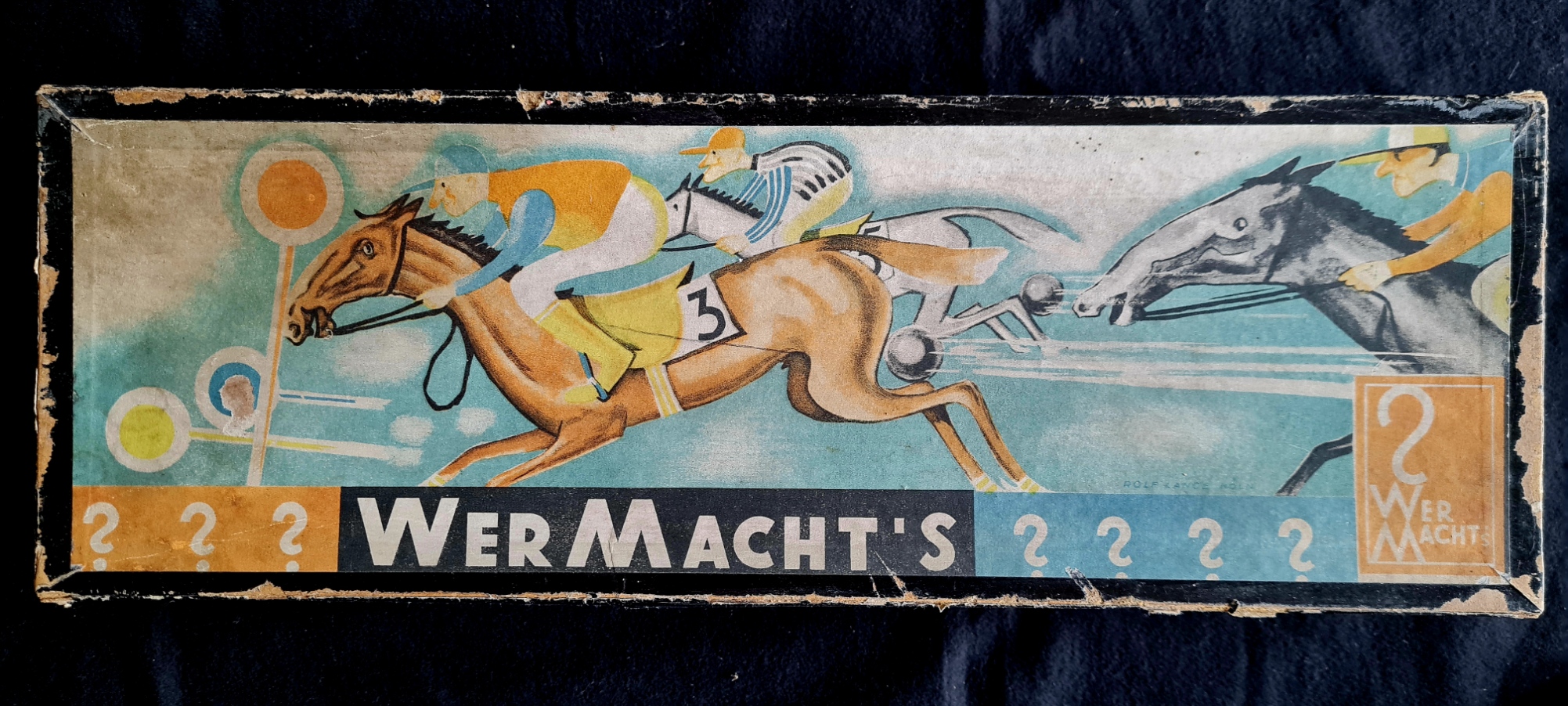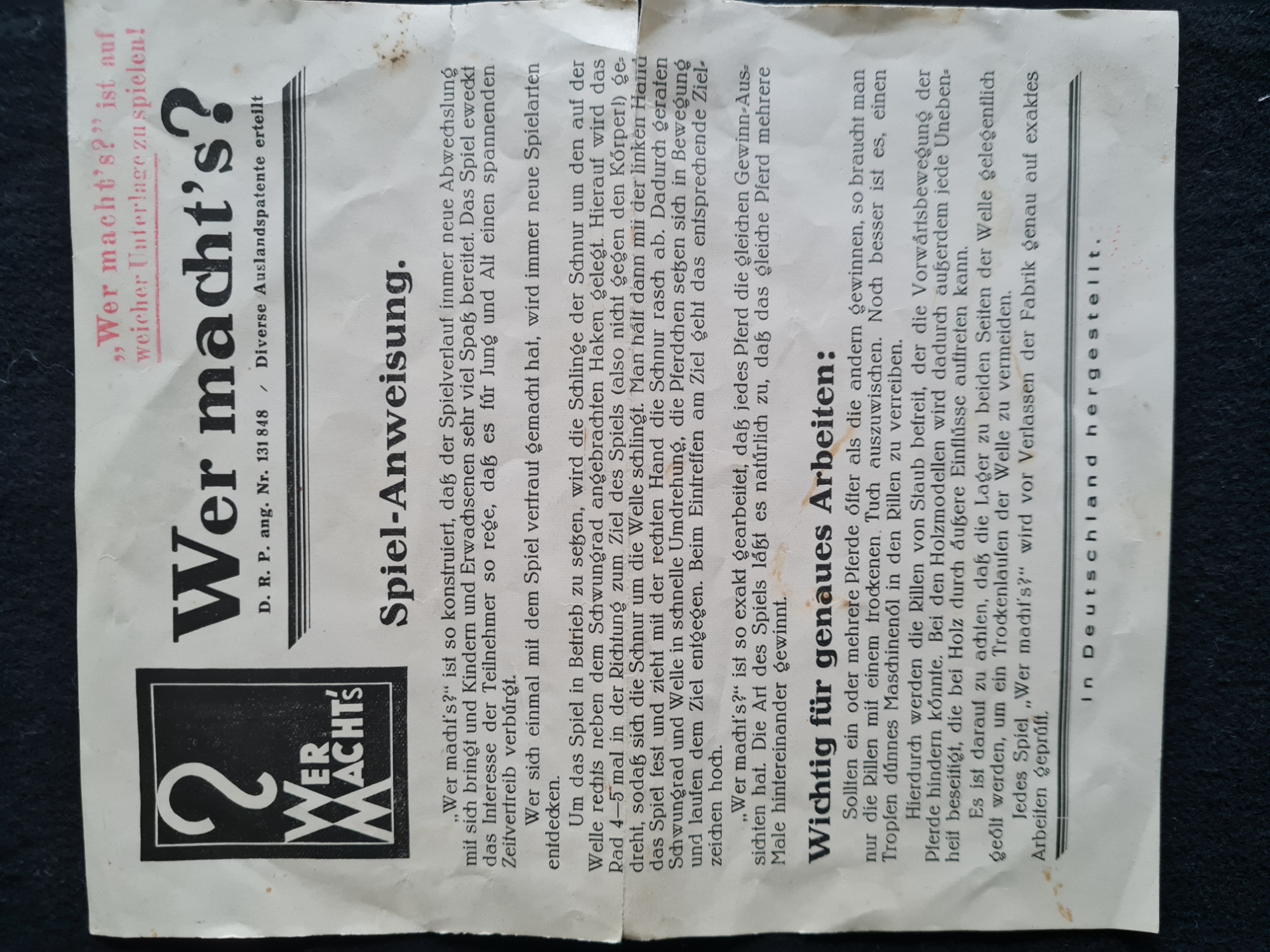 Das Pferderennspiel „Wer macht’s“ kommt aus der Nürnberger Blechspielzeugfabrik Siegfried Günthermann. Auf einer schrägen Ebene stehen sechs farbige Blechpferdchen mit Jockeys in ihren Bahnen und warten auf den Startschuss. Mit einem seilzug wird ein Schwungrad in schnelle Rotation versetzt. Die sich drehende Achse des Schwungrads ist mit sechs Noppen versehen. Diese katapultieren kleine Stahlkugeln in den Bahnen immer wieder nach oben und stoßen so die Pferde voran. Das Pferd das als erstes die Zielfahne am Ende der Bahn hochklappt, hat gewonnen. Natürlich können die Mitspieler vor dem Start ihre Wetten abgeben. Die Einsätze werden dazu in den farbigen Näpfchen neben den Rennbahnen deponiert. Das ausgestellte Spiel ist sehr gut erhalten. Es wurde in den 1920er-Jahren für 20 Schilling bei Anton c. Niessner in Wien gekauft, einer Firma, die noch heute als Haus- und Küchengerätegeschäft existiert.