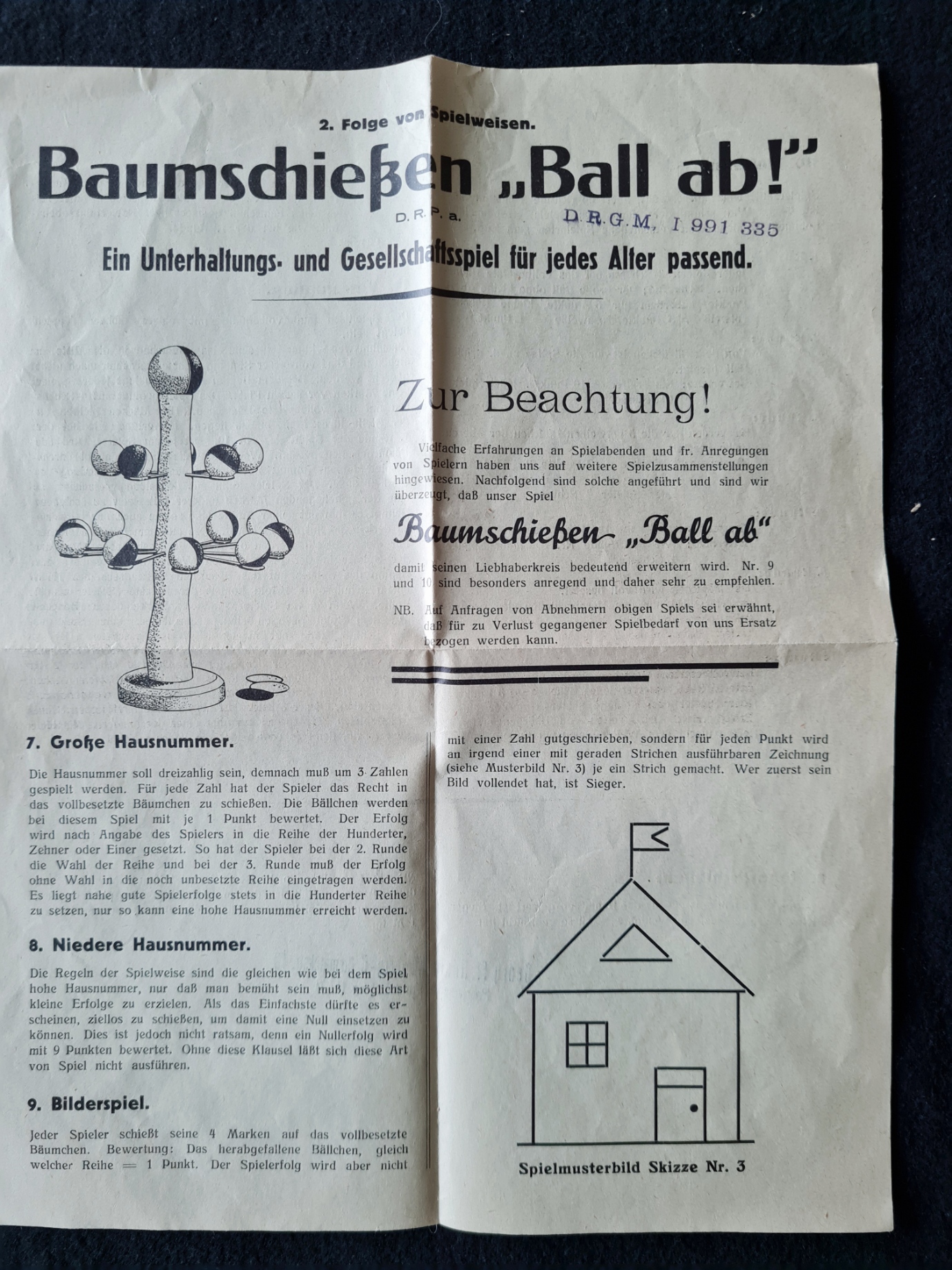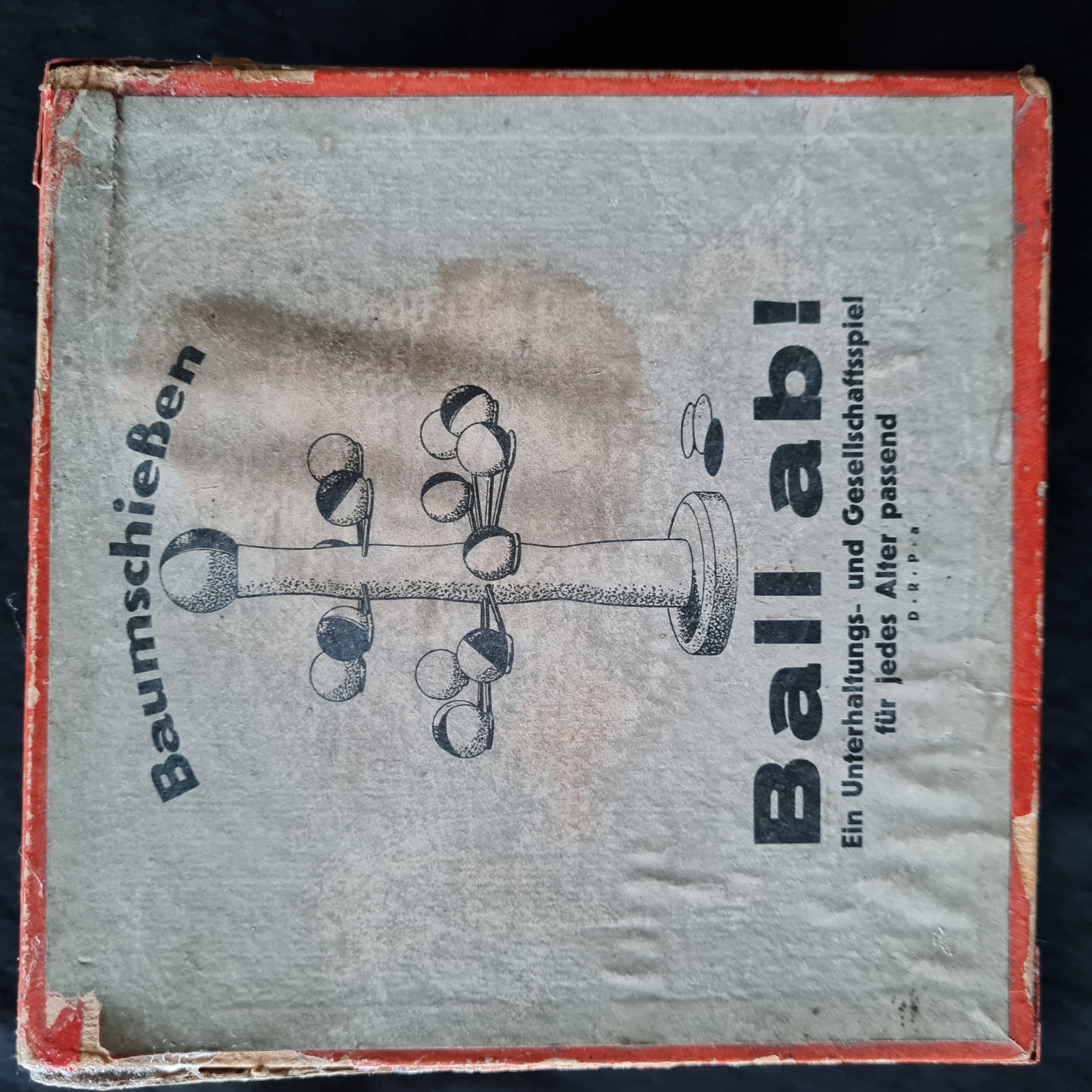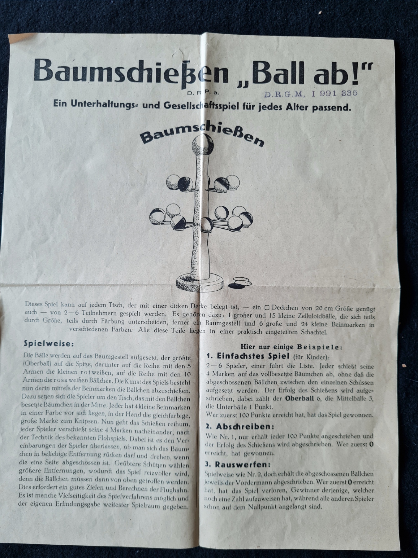Zu dem Unterhaltungs- und Gesellschaftsspiel für jedes Alter passend mit dem Titel Baumschießen „Ball ab! sind keine weiteren Informationen verfügbar. Das gilt auch für die angegebene Bezugsquelle. Das Exemplar in der Spielesammlung ist recht gut erhalten. Das für 2-6 Teilnehmer gedachte Spiel enthält 1 großen und 15 kleine Zelluloidbälle sowie 6 große und 24 kleine Beinmarken in sechs verschieden Farben (Flohspiel) und ist damit vollständig. Lediglich der große Zelluloidball weist eine Verformung auf.