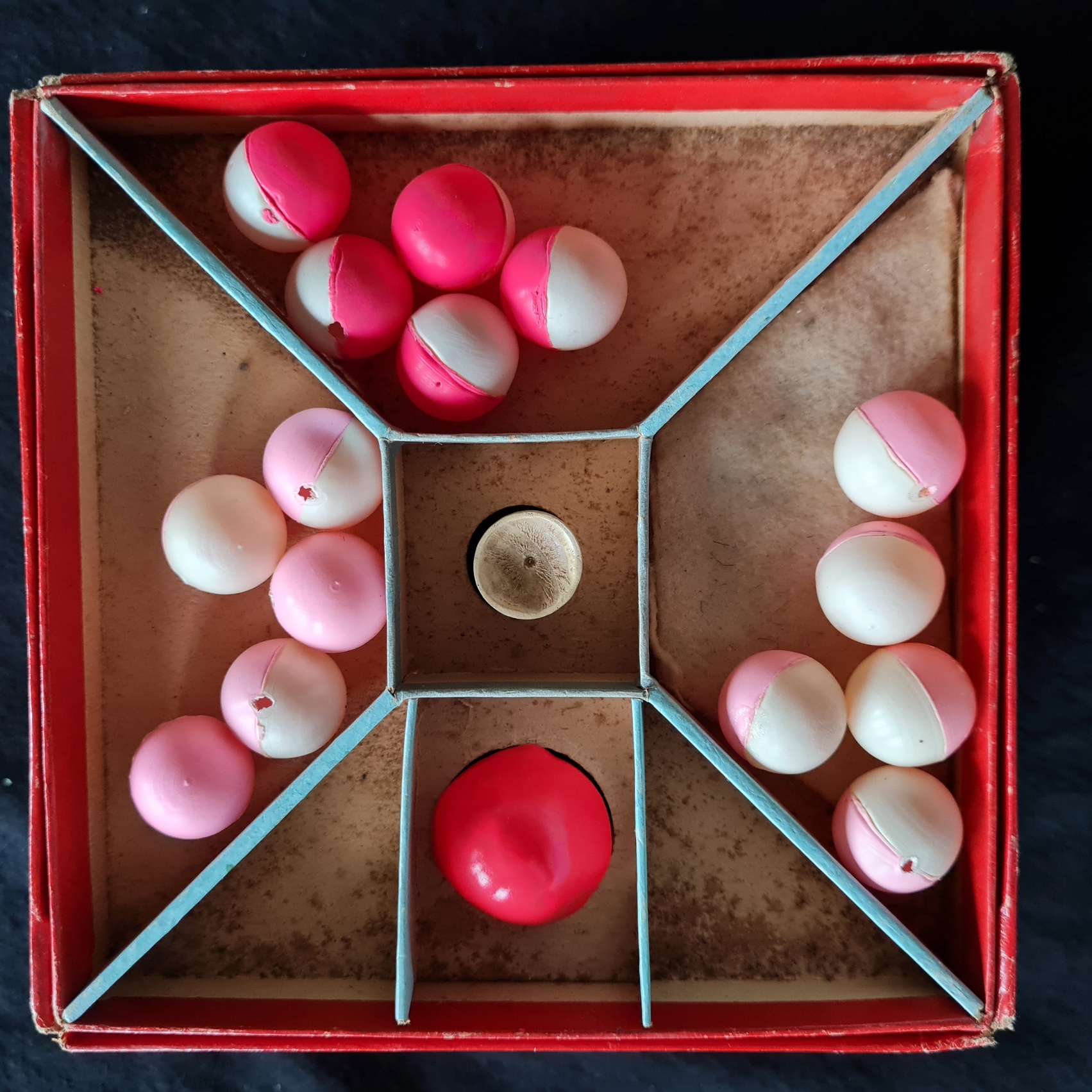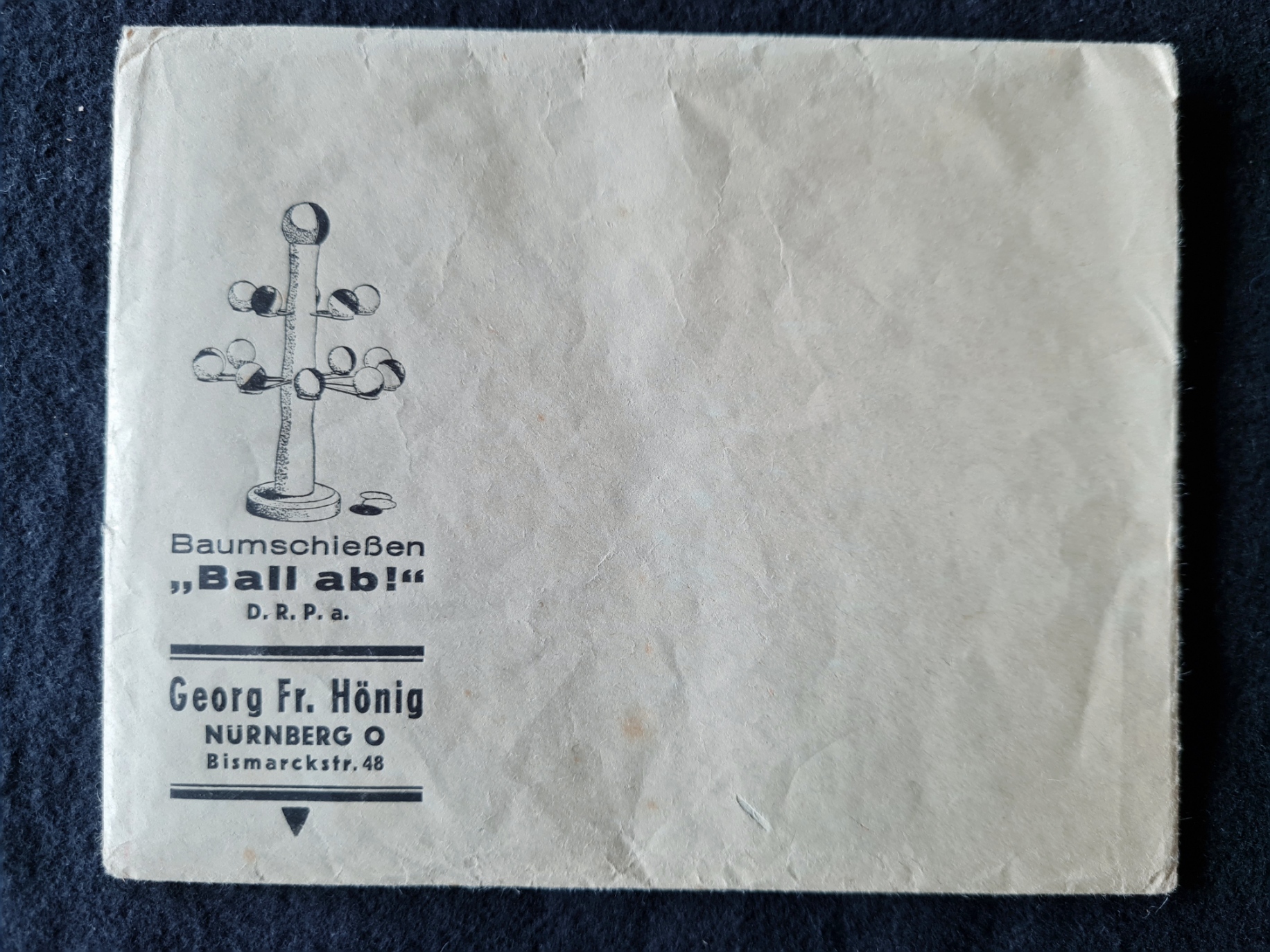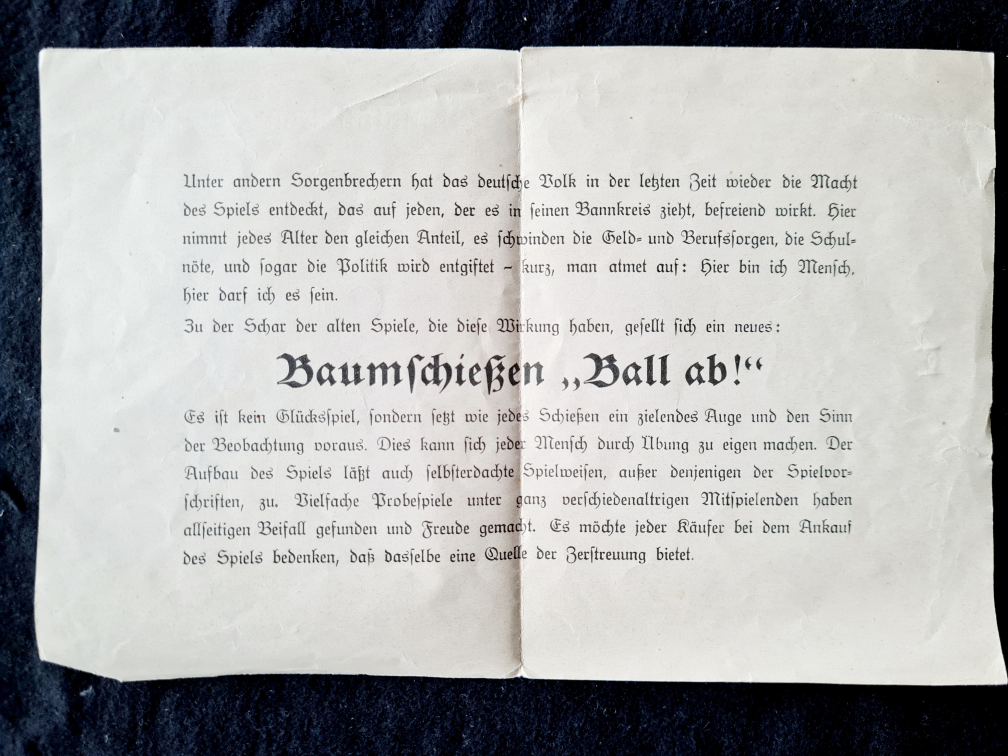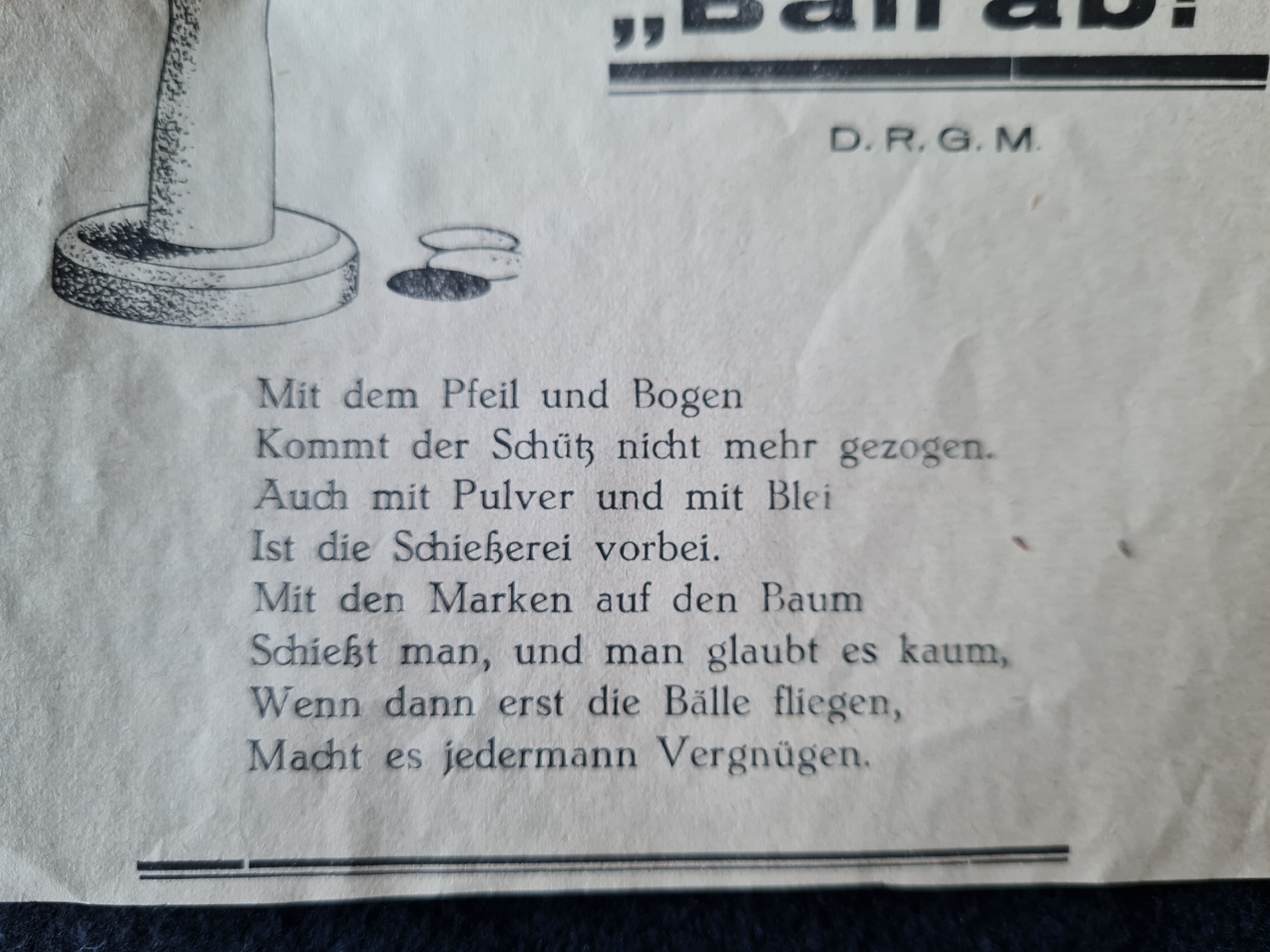 Zu dem Unterhaltungs- und Gesellschaftsspiel für jedes Alter passend mit dem Titel Baumschießen „Ball ab! sind keine weiteren Informationen verfügbar. Das gilt auch für die angegebene Bezugsquelle. Das Exemplar in der Spielesammlung ist recht gut erhalten. Das für 2-6 Teilnehmer gedachte Spiel enthält 1 großen und 15 kleine Zelluloidbälle sowie 6 große und 24 kleine Beinmarken in sechs verschieden Farben (Flohspiel) und ist damit vollständig. Lediglich der große Zelluloidball weist eine Verformung auf.