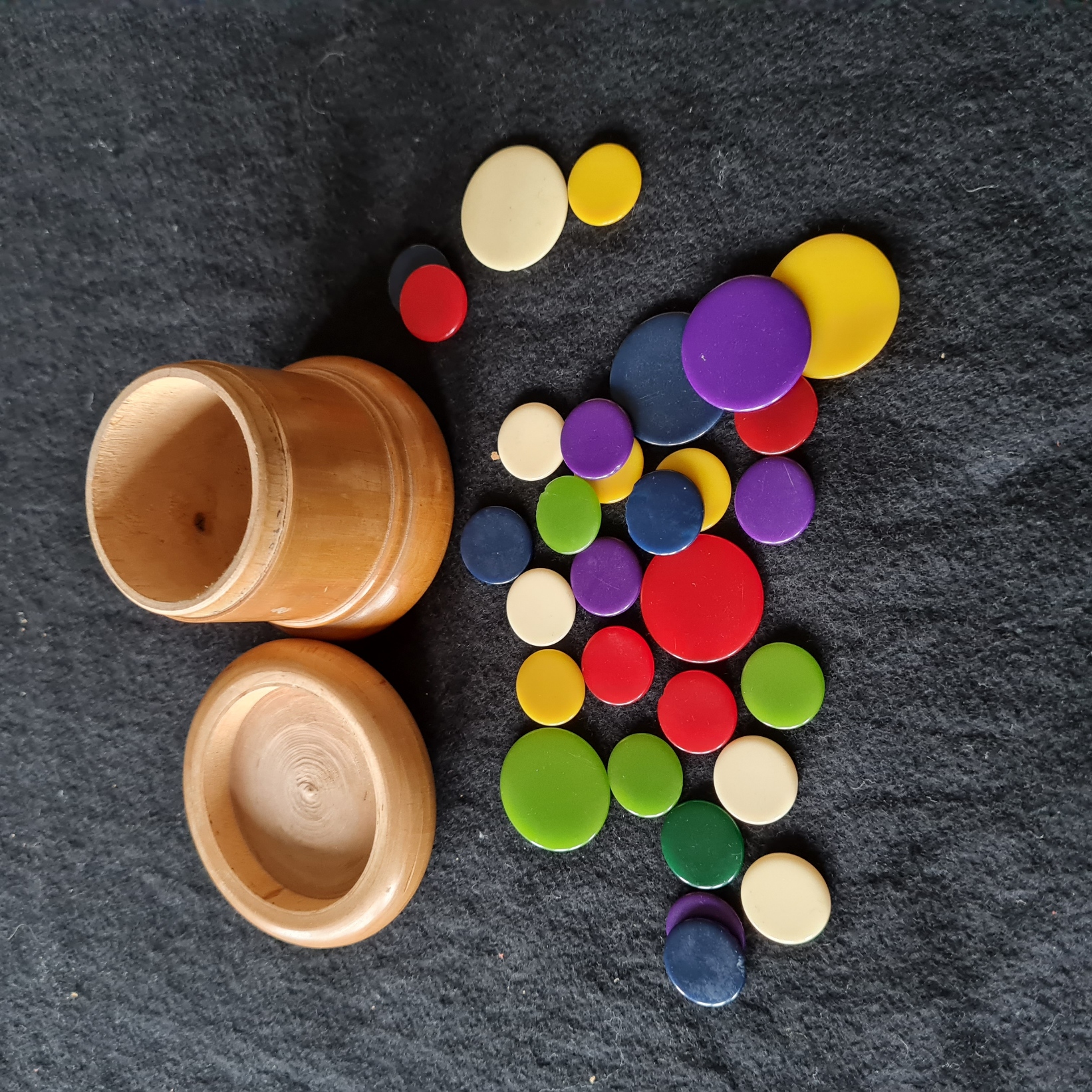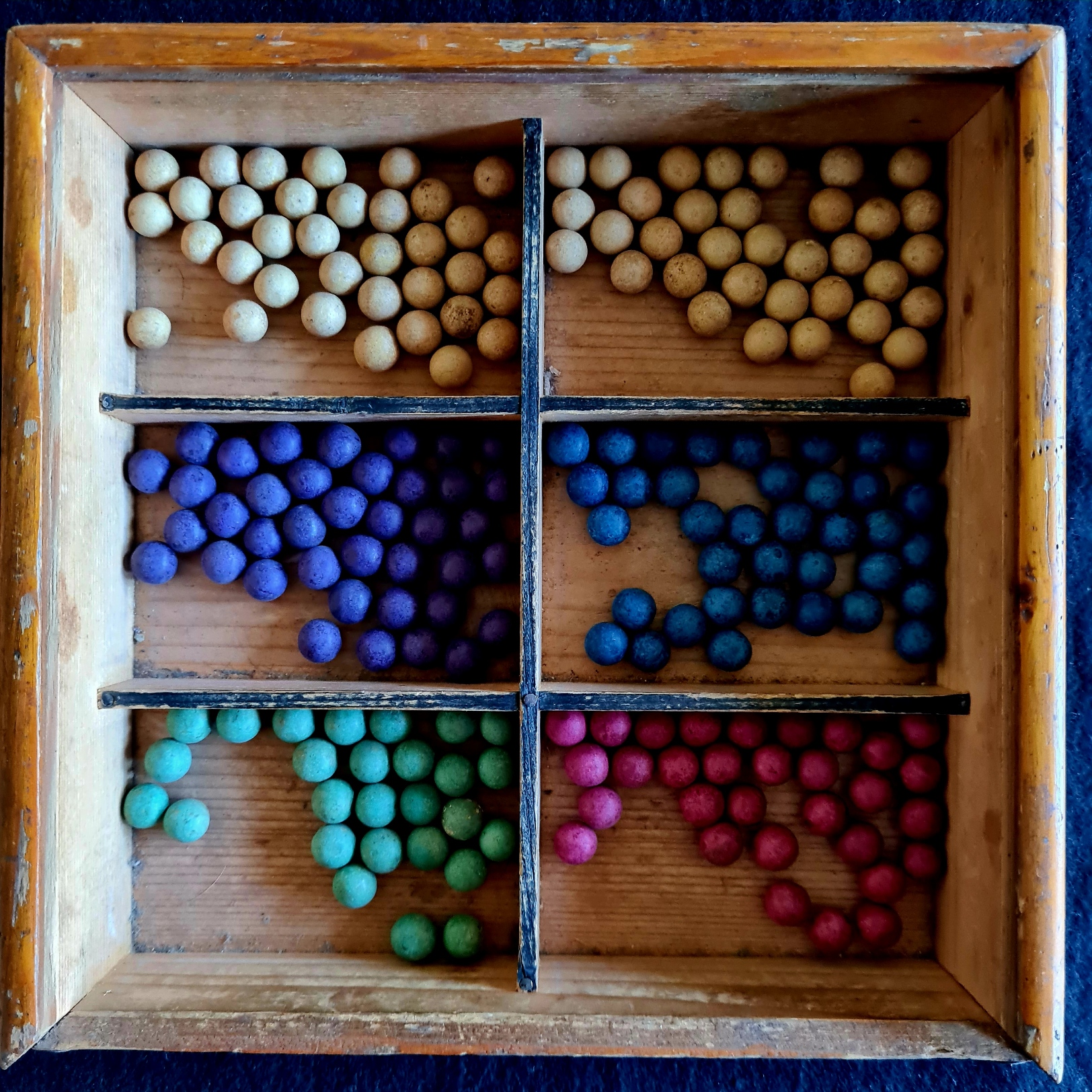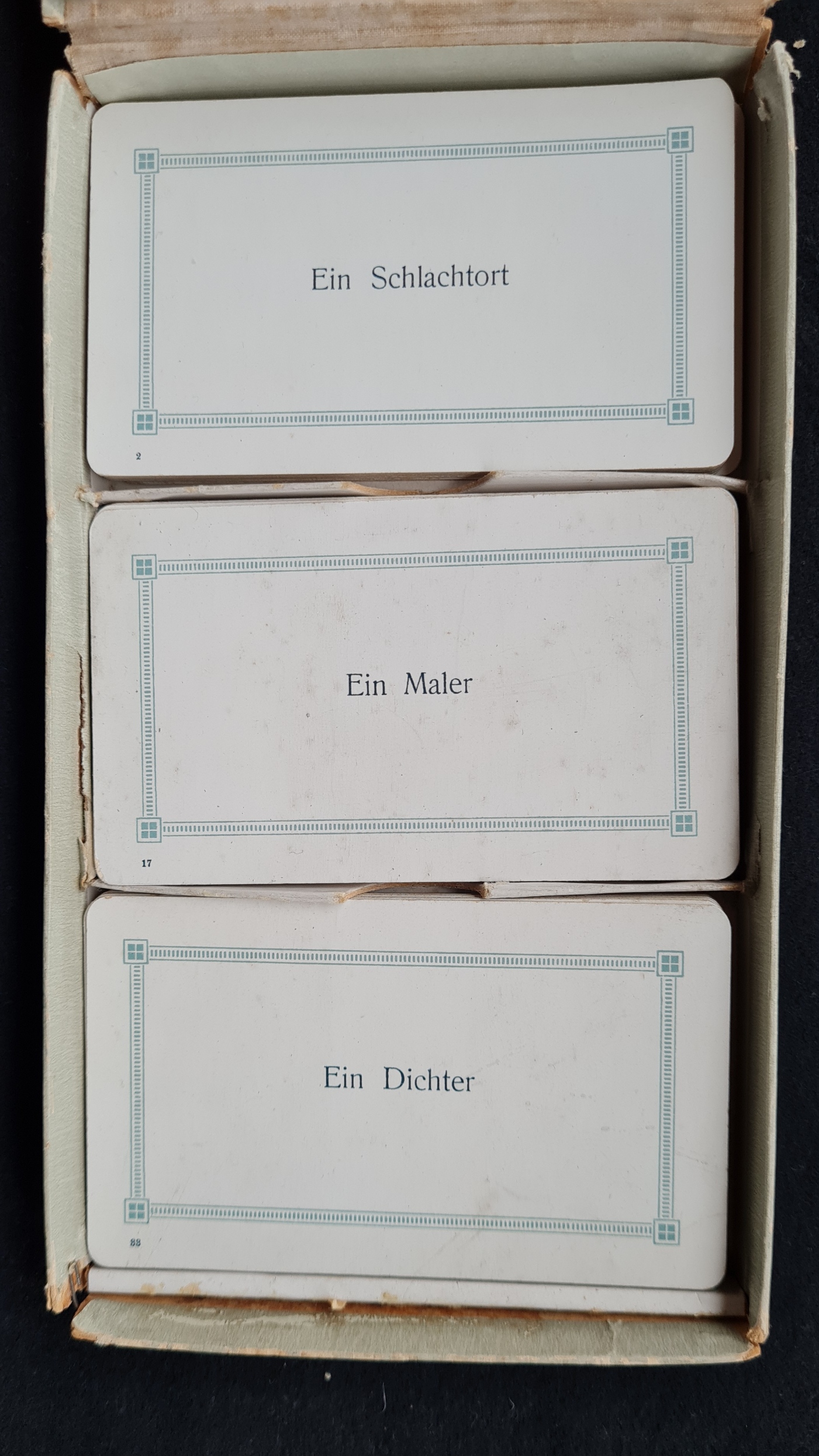 Erhaltung: ein Stein leicht beschädigt, Ecken und Kanten des Schachteldeckels etwas aufgeschabt, Deckel leicht fleckig, ansonsten gut.