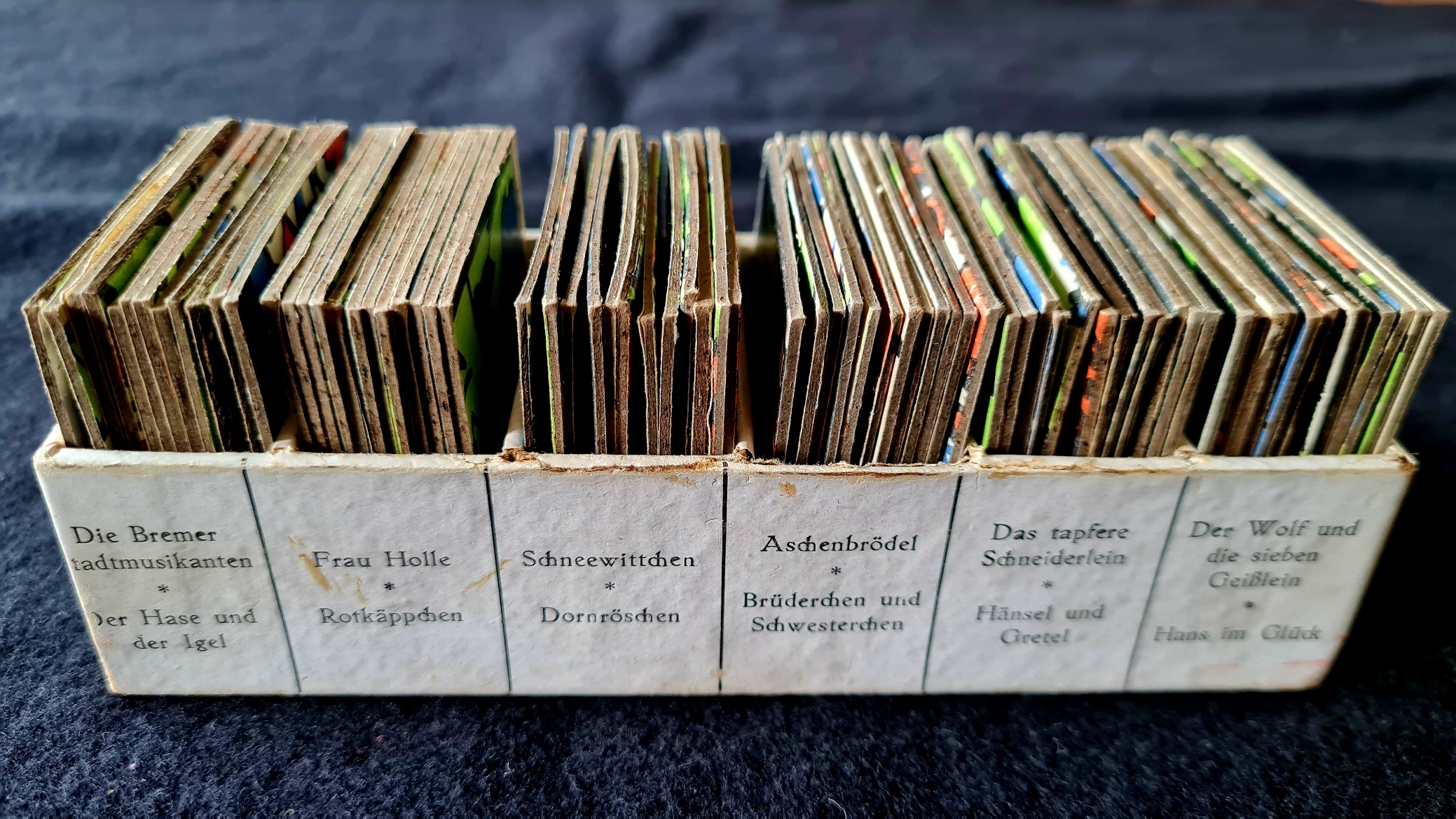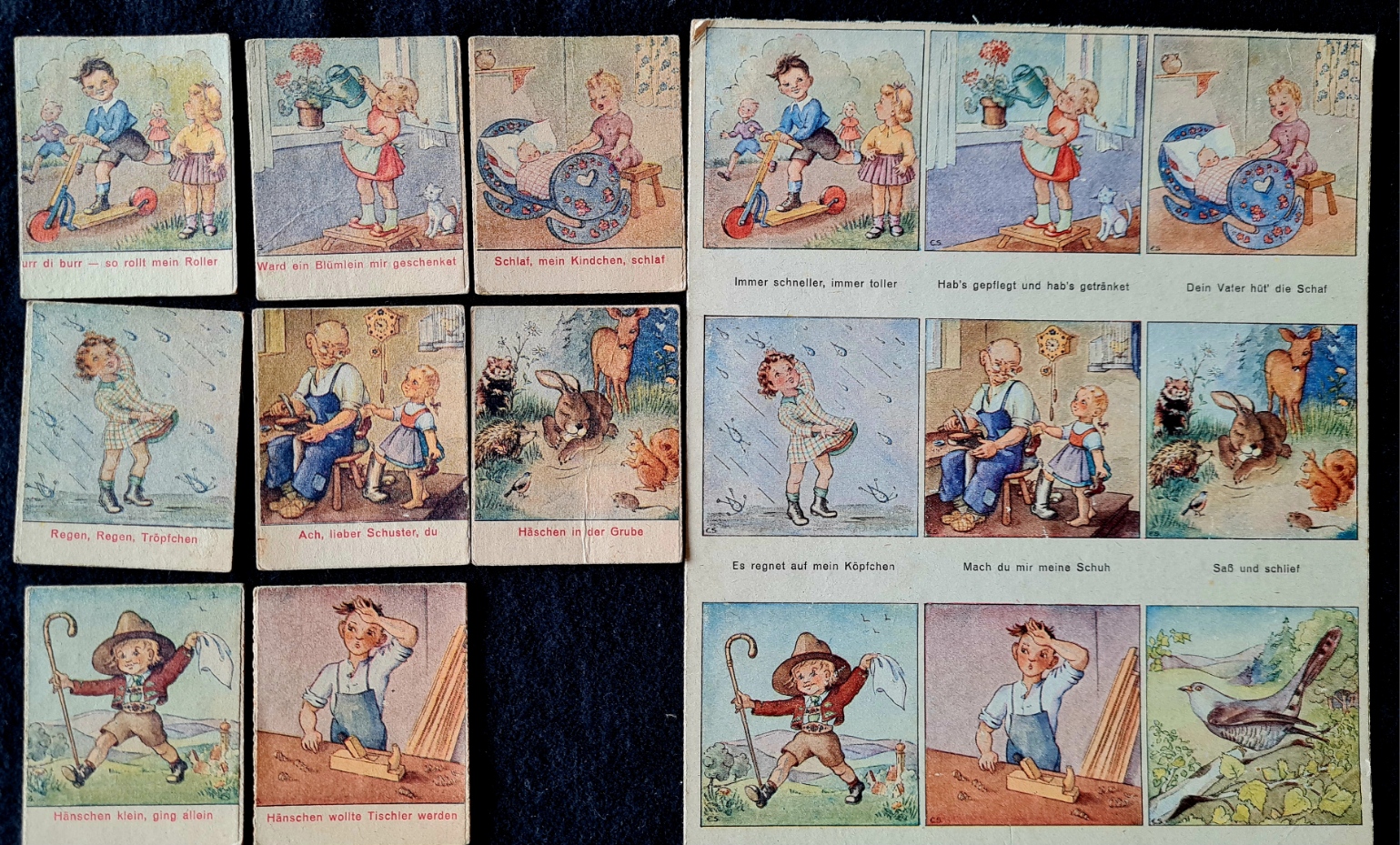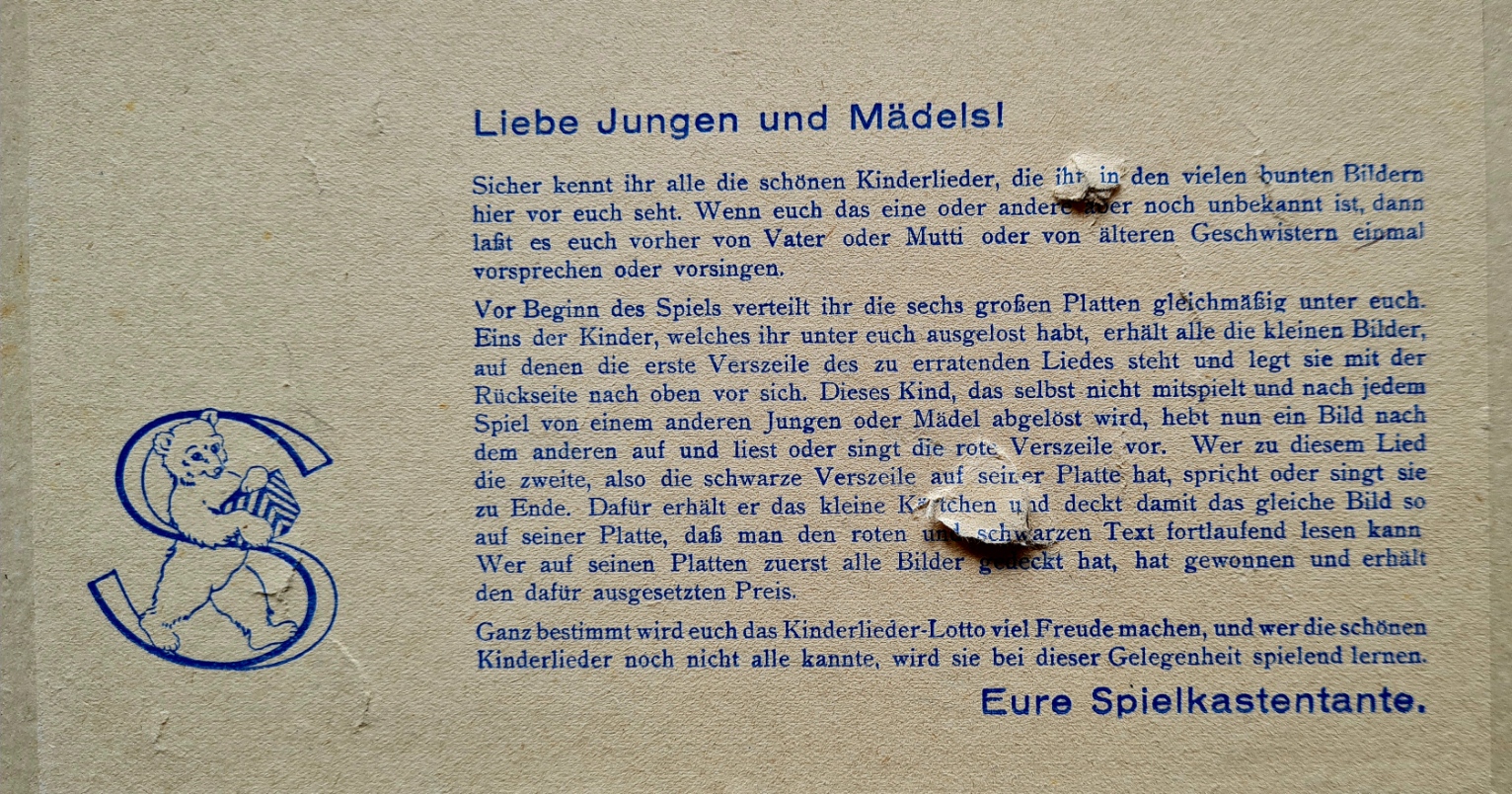 Thema dieses Bilder-Lotto Spiels sind Kinderlieder. Während auf den sechs großen Platten (vollständig) jeweils passende Bilder und die zweite Verszeile (schwarz) von 9 Kinderliedern aufgedruckt ist, gibt es 54 kleine Bilder mir der jeweiligen ersten Verszeile (rot). Die Schachtel des Exemplars der Spielesammlung ist stark beschädigt. Während die großen Platten vollständig vorhanden sind, fehlen leider 13 der ursprünglich 54 Kärtchen mit der ersten Verszeile.