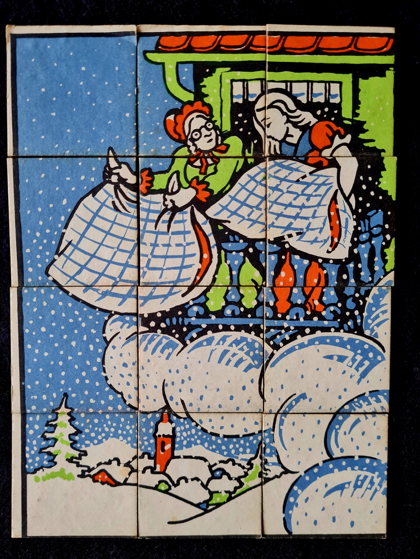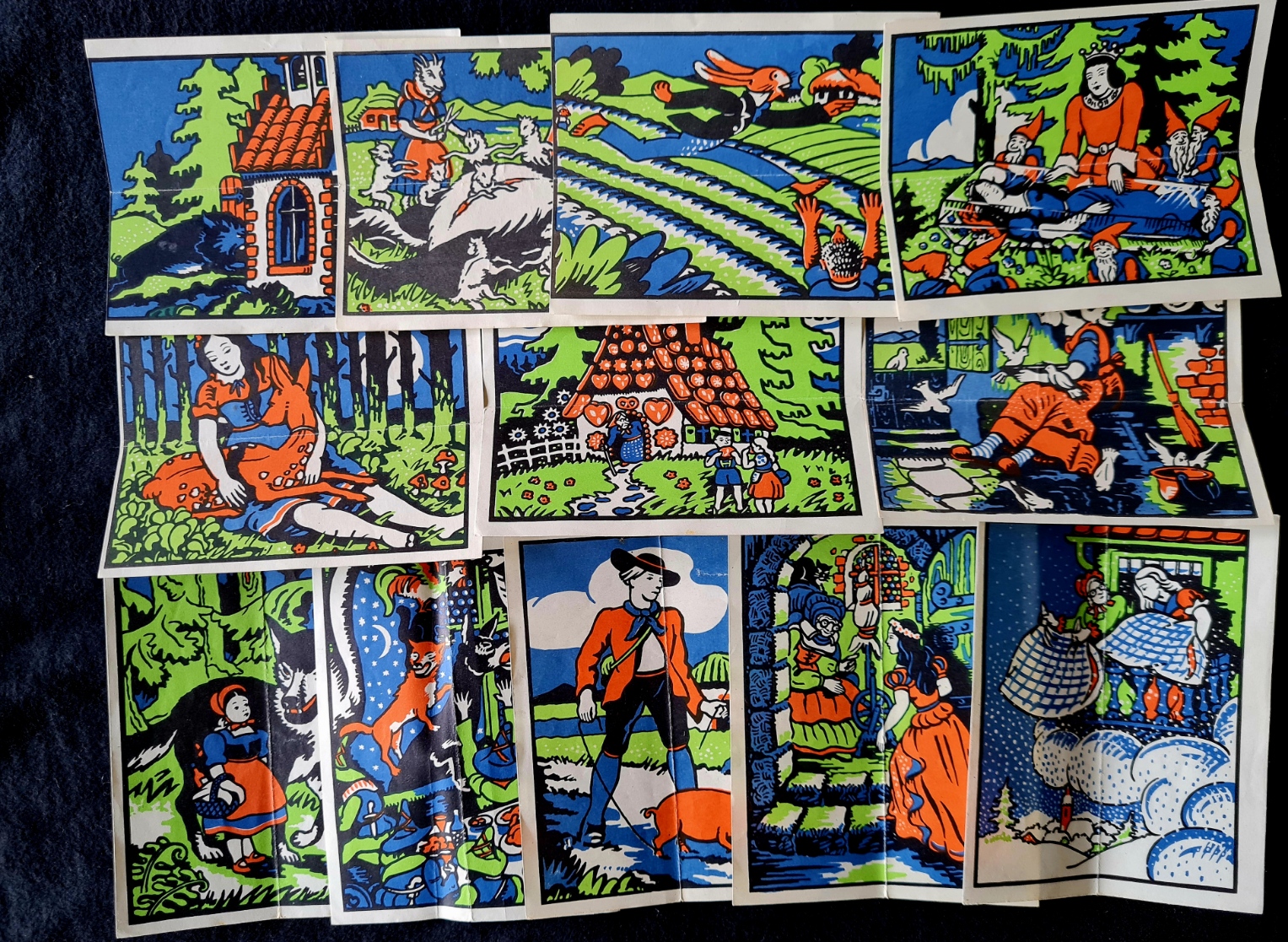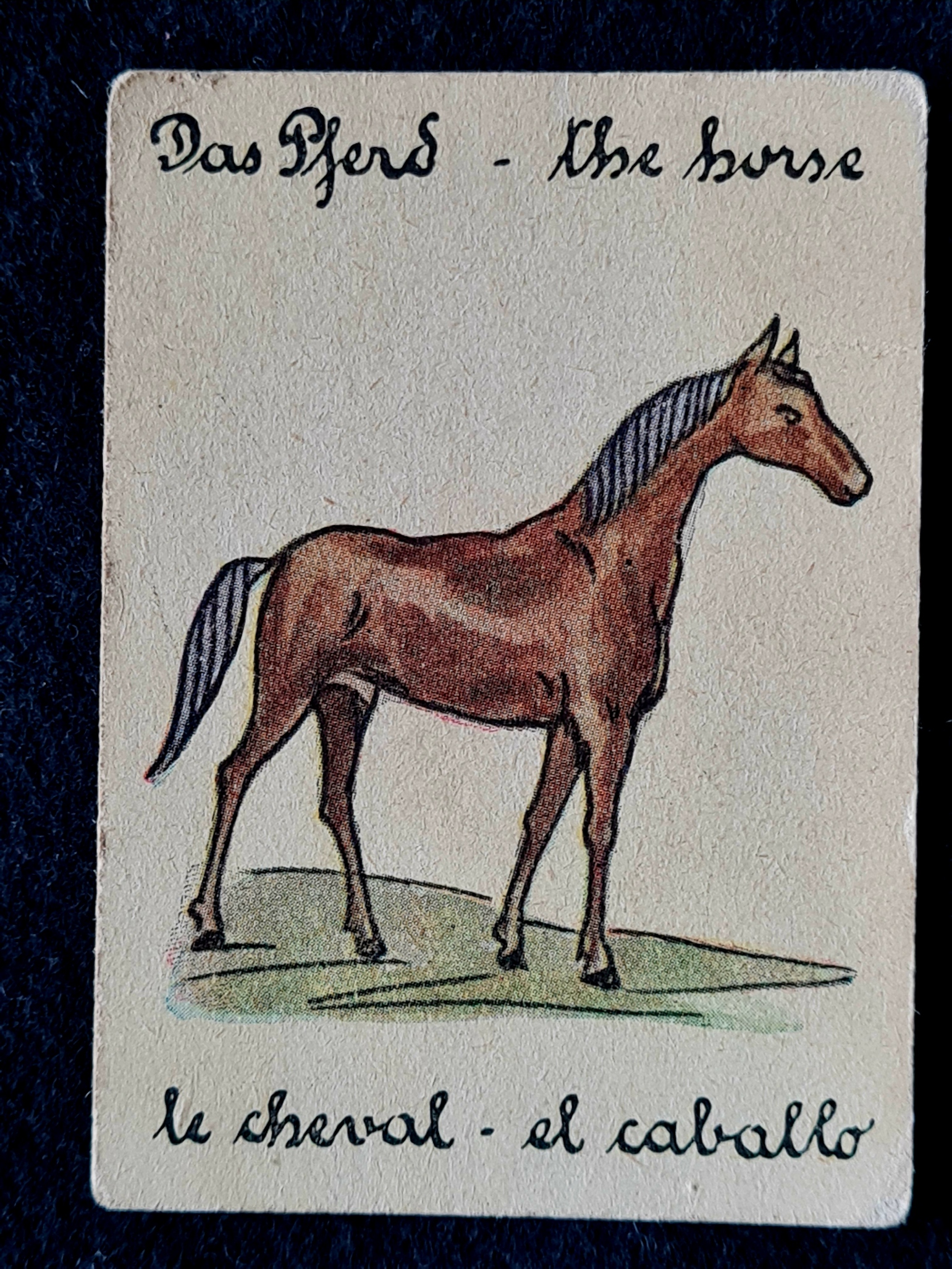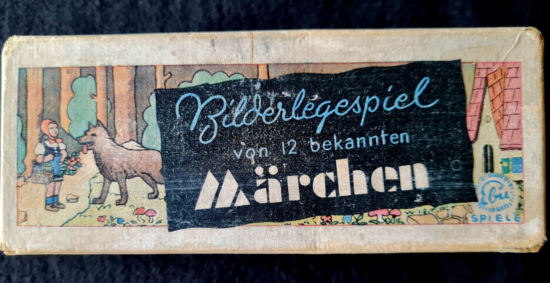 Thema dieses Bilder-Lotto Spiels sind Kinderlieder. Während auf den sechs großen Platten (vollständig) jeweils passende Bilder und die zweite Verszeile (schwarz) von 9 Kinderliedern aufgedruckt ist, gibt es 54 kleine Bilder mir der jeweiligen ersten Verszeile (rot). Die Schachtel des Exemplars der Spielesammlung ist stark beschädigt. Während die großen Platten vollständig vorhanden sind, fehlen leider 13 der ursprünglich 54 Kärtchen mit der ersten Verszeile.