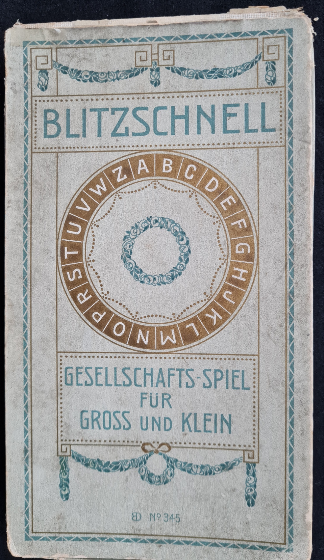 Beim Gesellschafts-Spiel für Gross und Klein wird durch ein Rad zufällig ein Buchstabe bestimmt, zu dem ein zu der aufgedeckten Karte (z.B. Ein Maler) passendes Wort gefunden werden soll. Das Spiel ist gut erhalten, alle 48 Karten sind vorhanden.