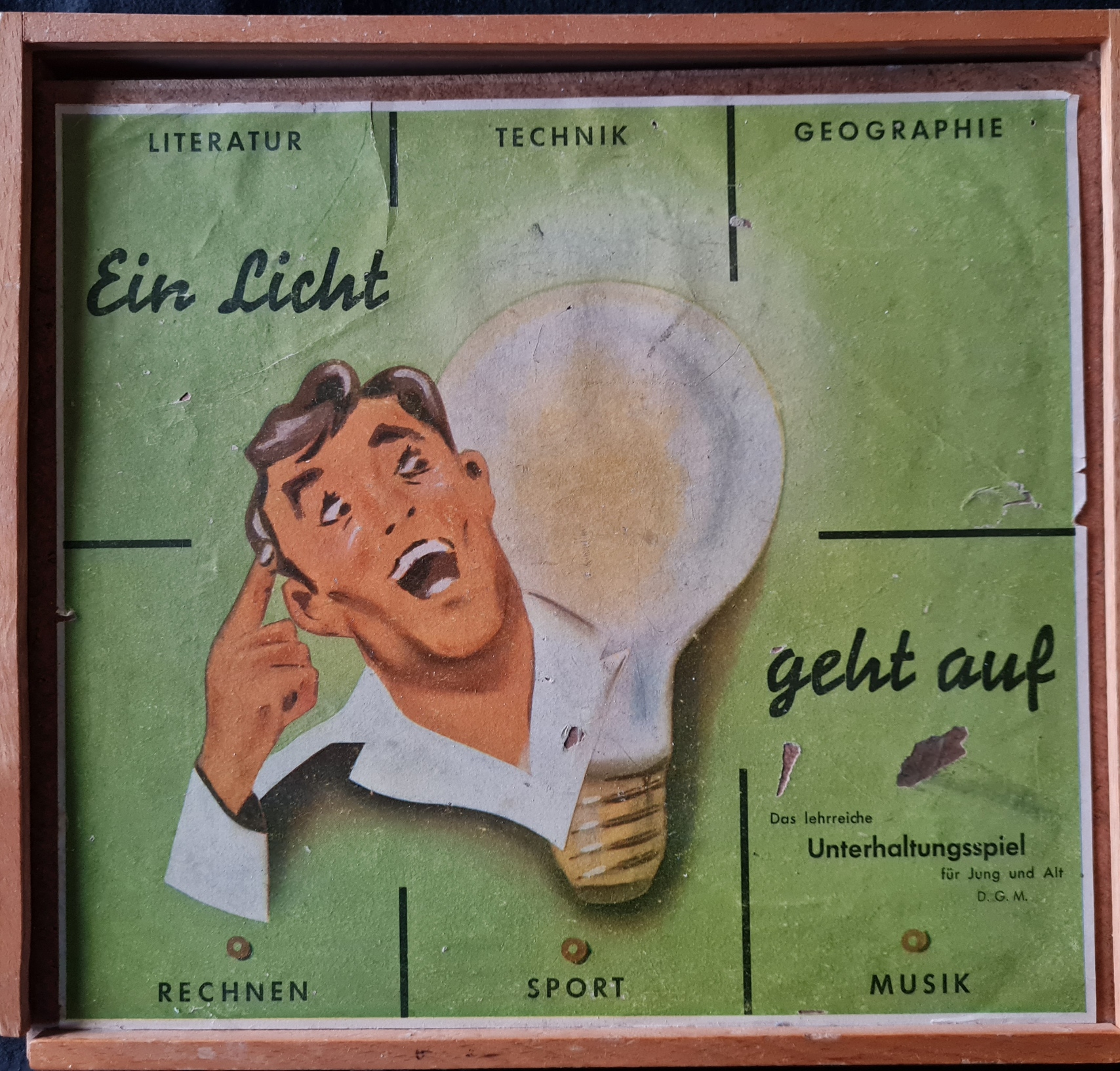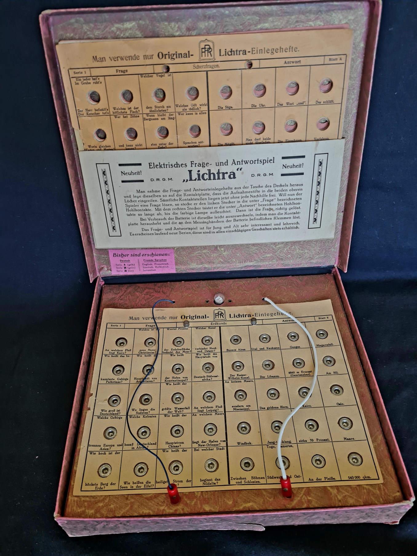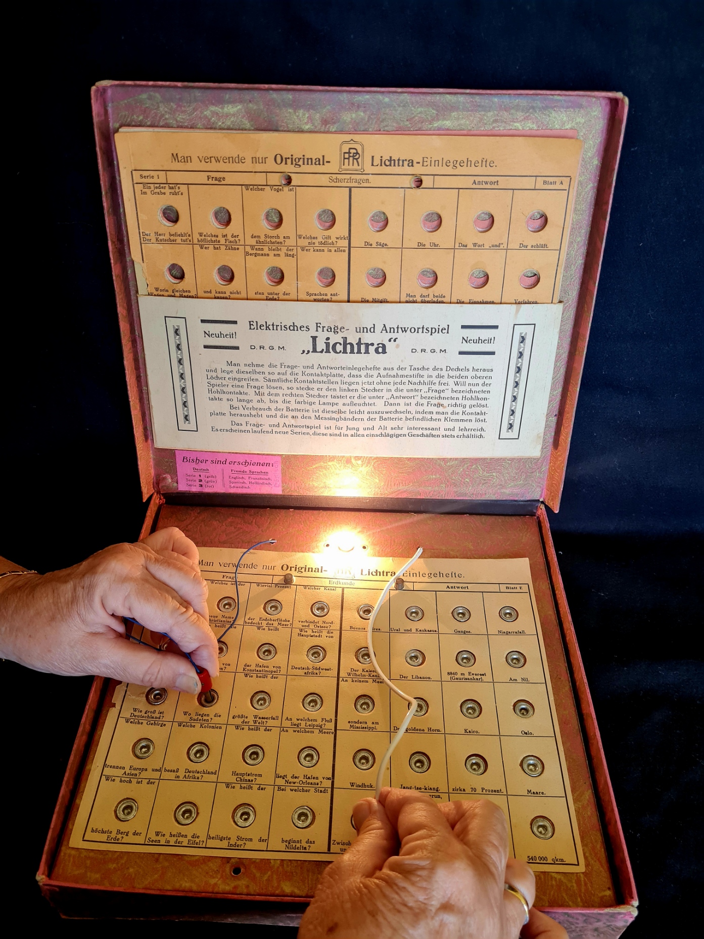 Frage- und Antwortspiele - nicht mehr mit Karten sondern mit Elekrizität. Eine frühes Beispiel (ca 1930) für diese Art von Unterhaltung ist Lichtra. Das Exemplar ist gut erhalten und funktionsfähig (Batterie erneuert). Zwei Serien von Einlegeheften (jeweils 7 Blätter) sind vollständig vorhanden.