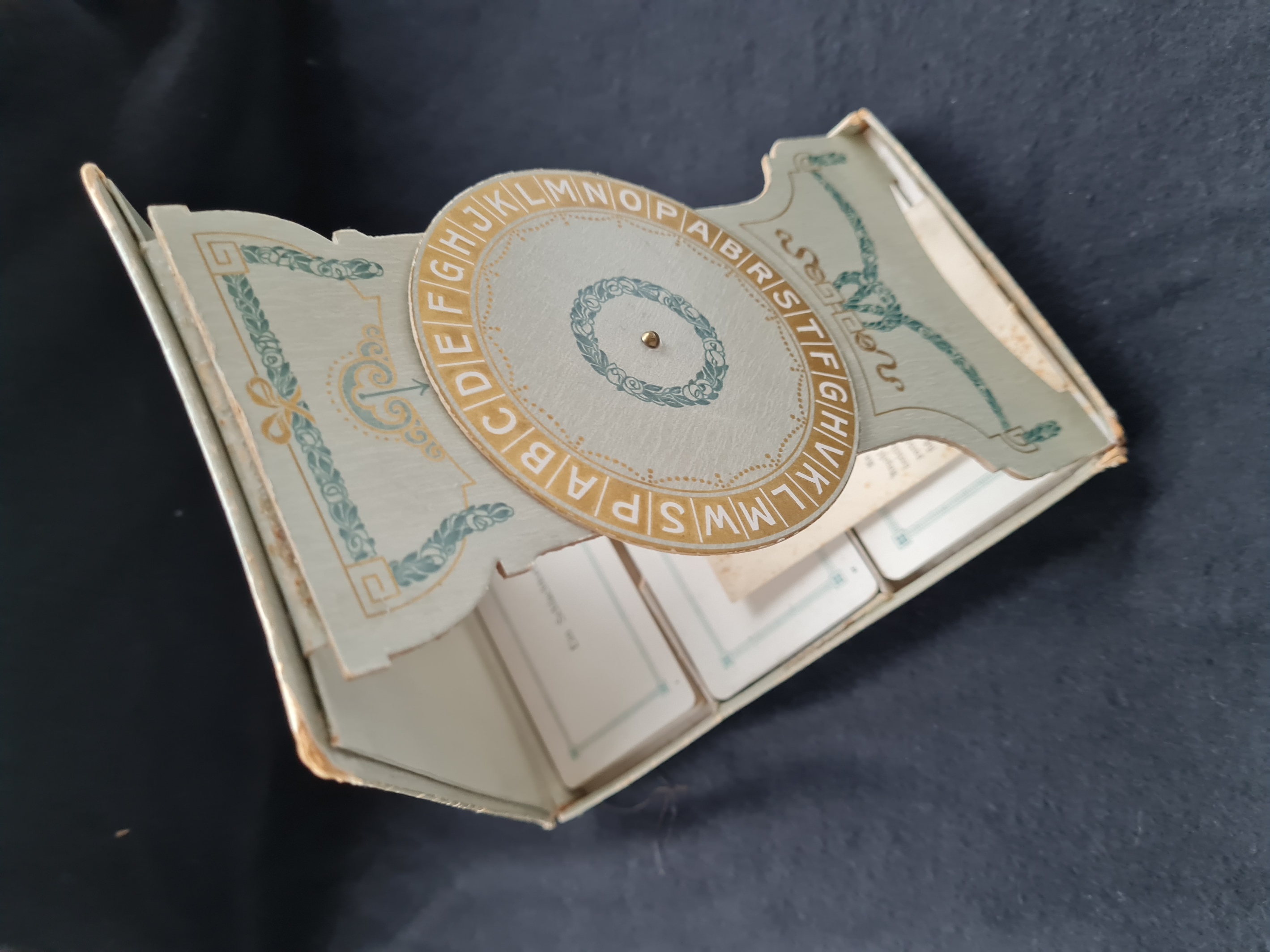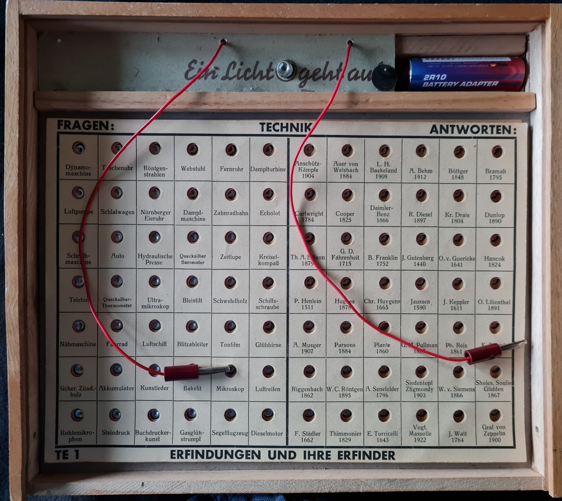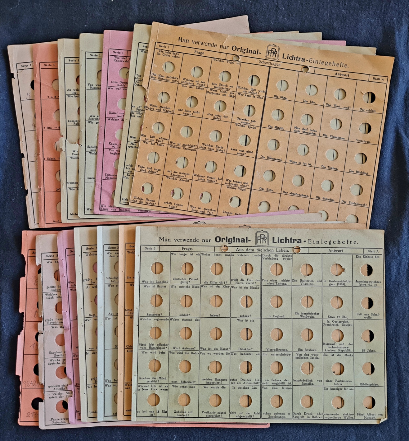 Frage- und Antwortspiele - nicht mehr mit Karten sondern mit Elekrizität. Eine frühes Beispiel (ca 1930) für diese Art von Unterhaltung ist Lichtra. Das Exemplar ist gut erhalten und funktionsfähig (Batterie erneuert). Zwei Serien von Einlegeheften (jeweils 7 Blätter) sind vollständig vorhanden.