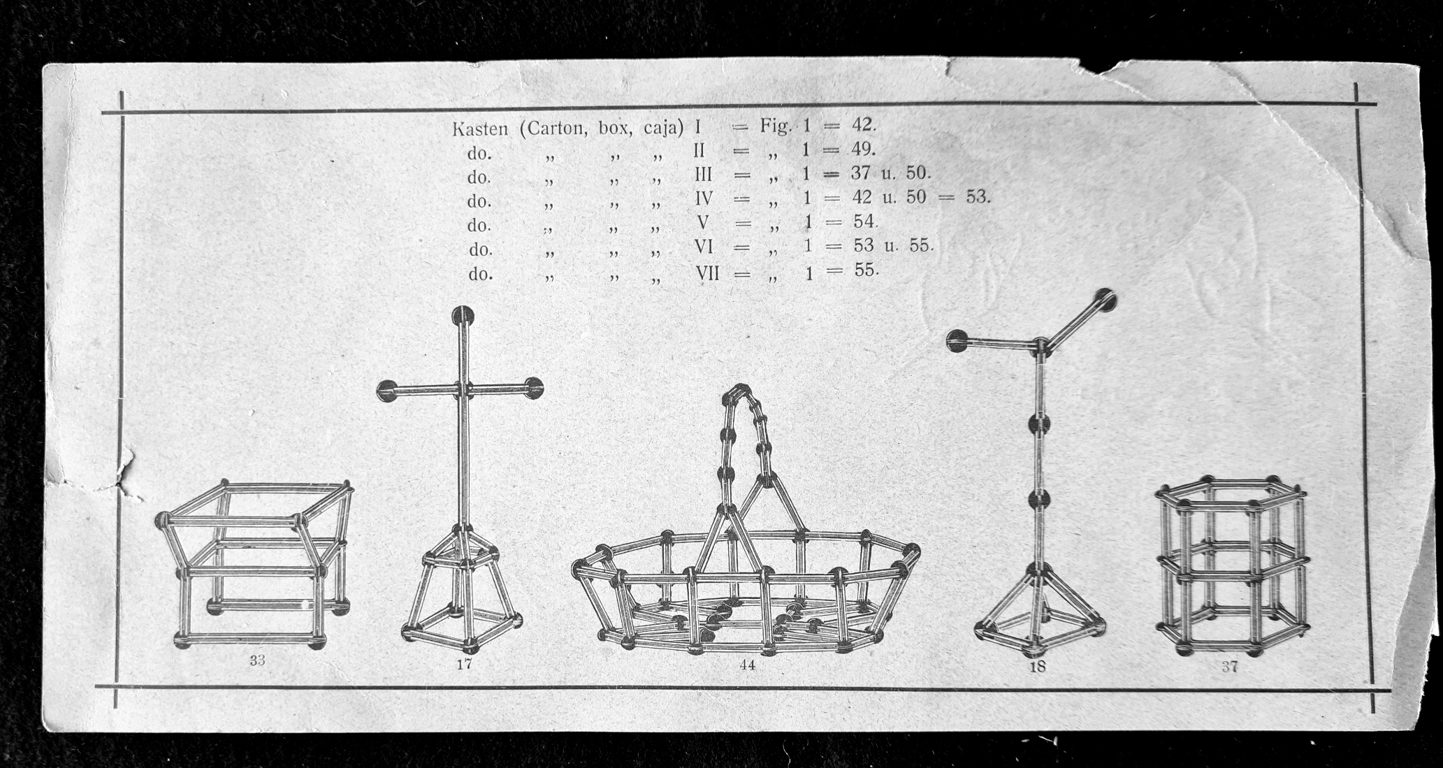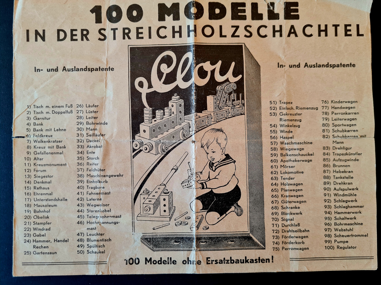 Baukästchen aus vier Lochbändern, diversen Blechkästchen, Holzstäbchen und Pappscheiben in Gestalt einer Streichholzschachtel. Die Schachtel soll als ‘Der kleinste Metallbaukasten der Welt’ vermarktet worden sein. Dabei dürfte er mehr Holz- und Pappteile als Metallteile beinhalten. Auf der Rückseite der Schachtel befindet sich Werbung für schwedische Sicherheitszündhölzer, die offenbar auch in einer deutschen Niederlassung hergestellt wurden. Möglicherweise wurde der Baukasten also nur als Werbegeschenk der Zündholzfabrik hergestellt. Echte Reibeflächen hat die Papphülle übrigens nicht.