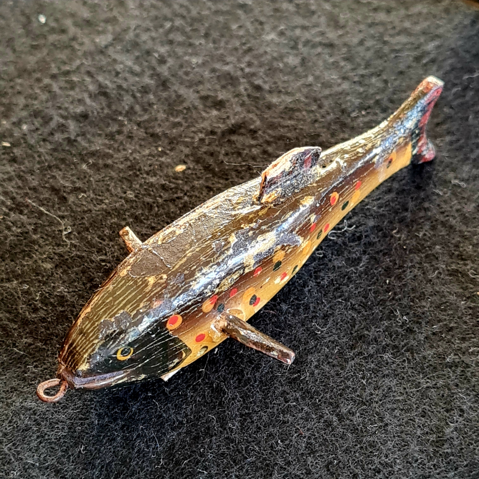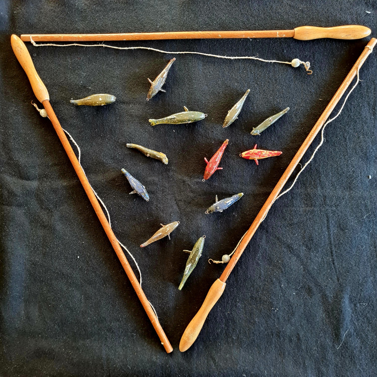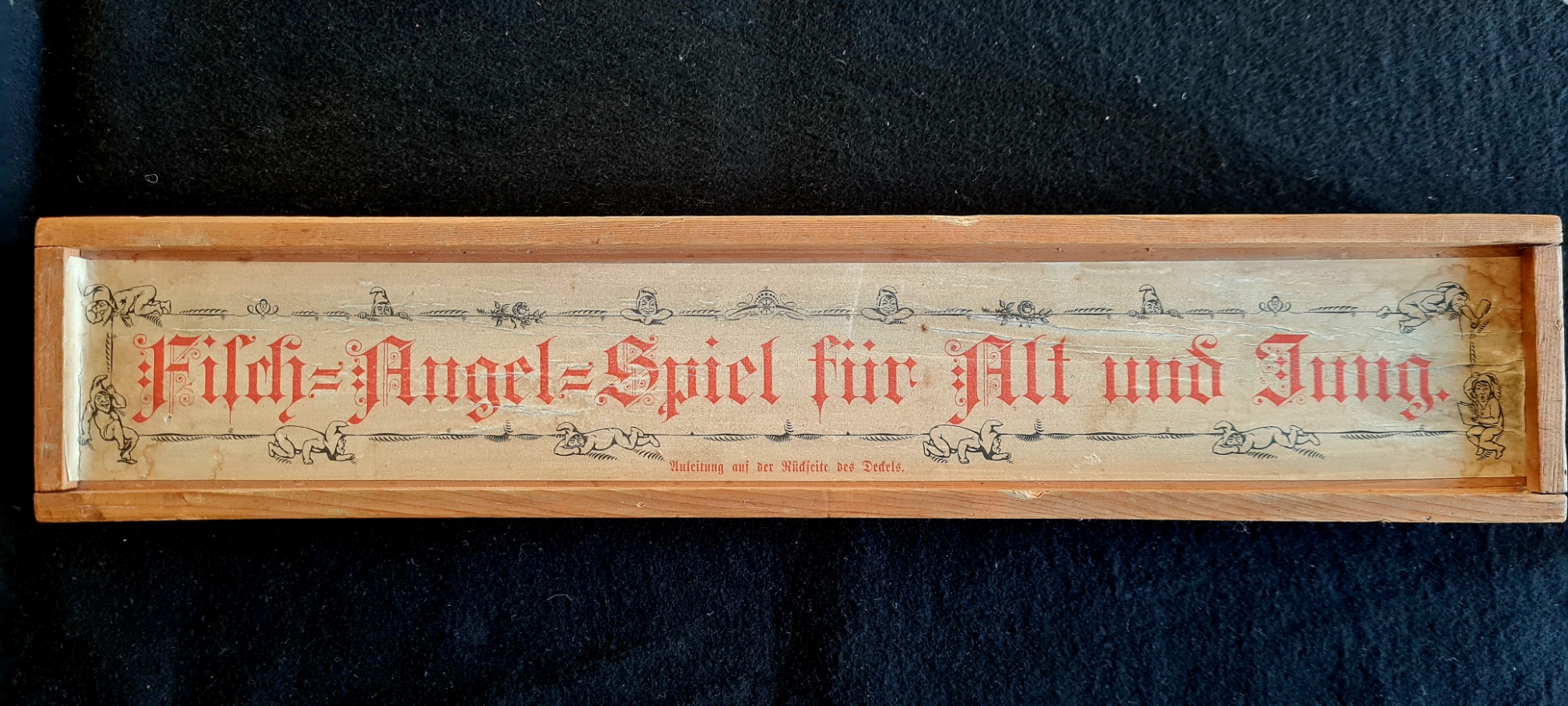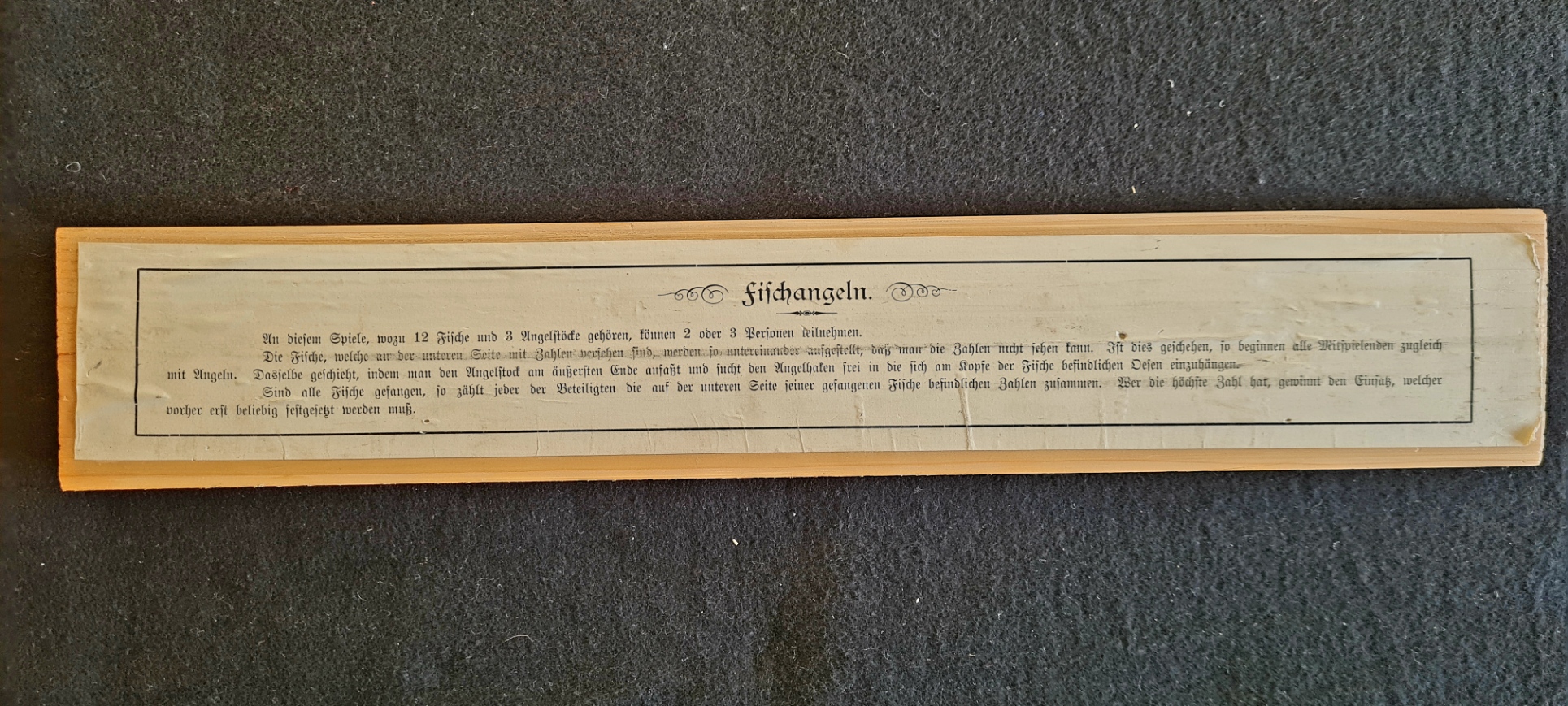 Im Internet wurde ein Angelspiel “Für Alt und Jung”, 49x10 cm, Holz, um 1900, komplett angeboten. Das vorhandene Exemplar ist mit 12 Fischen und drei Angeln vollständig. Einige Fische weisen leichte Beschädigungen (fehlende Flossen auf). Das Spiel ist jedoch voll funktionsfähig und setzt eine ruhige Hand voraus.