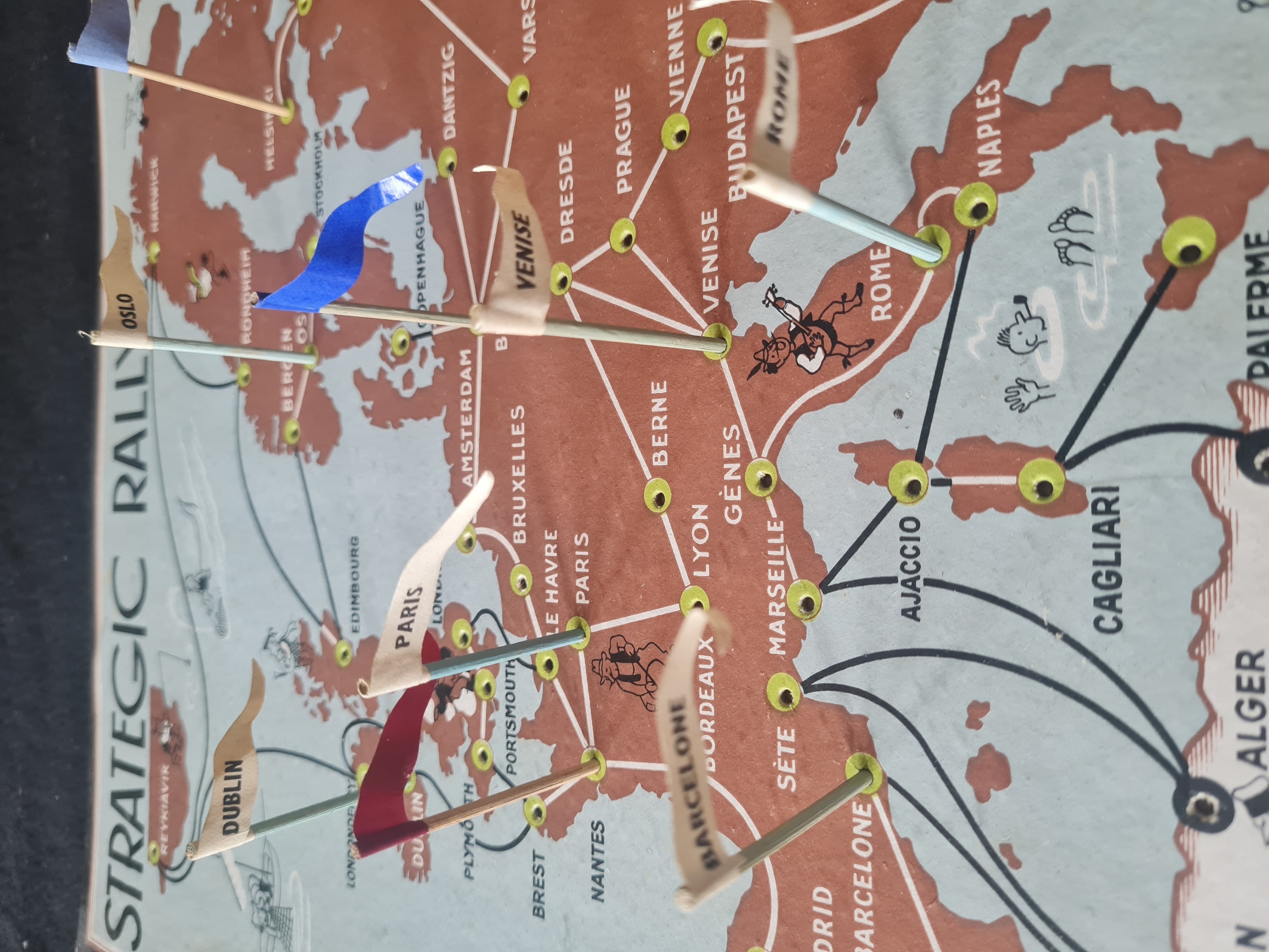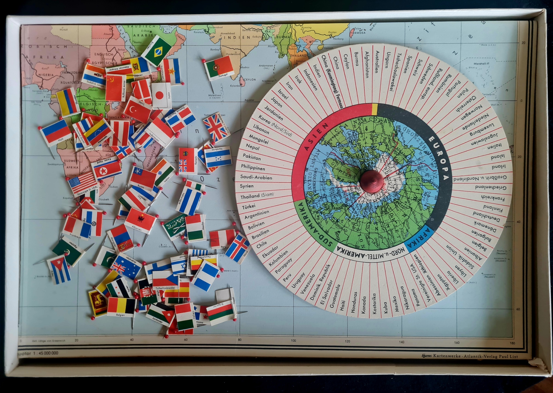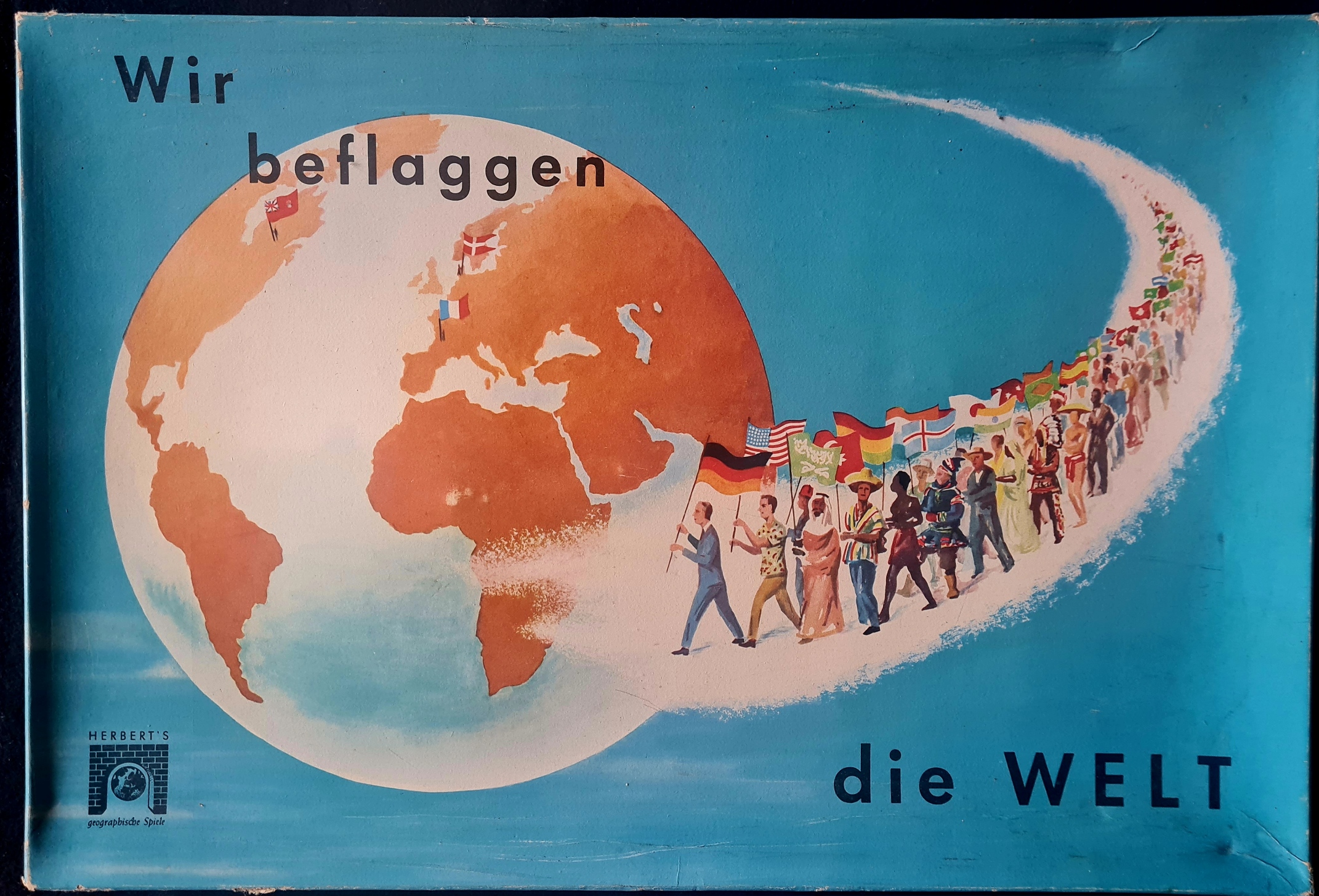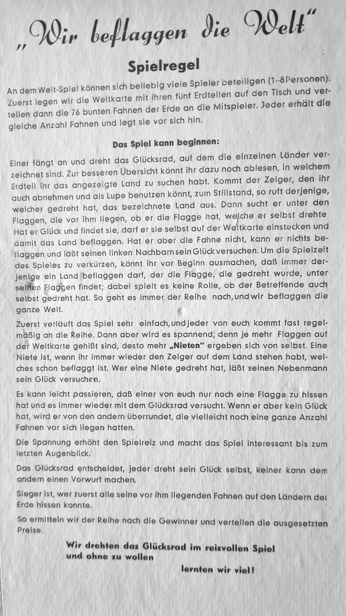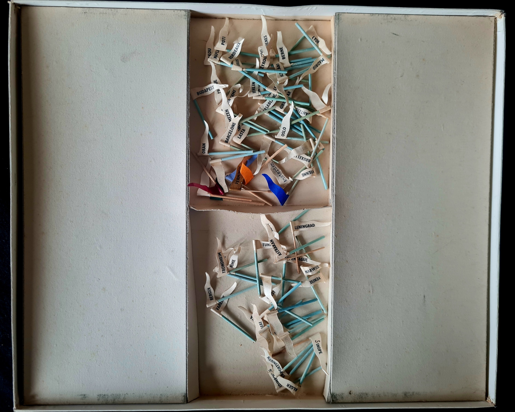 Die recht gut erhaltene Spielschachtel enthält den Spielplan (Weltkarte mit 67 Städten) sowie ein Fähnchen für jede Stadt, sechs farbige für die Mitspieler sowie ein Ziel-Fähnchen. Leider sind keinerlei Informationen über den Spielablauf enthalten in auch im Internet sind nur sehr wenige z.T. widersprüchliche Angaben zu finden.