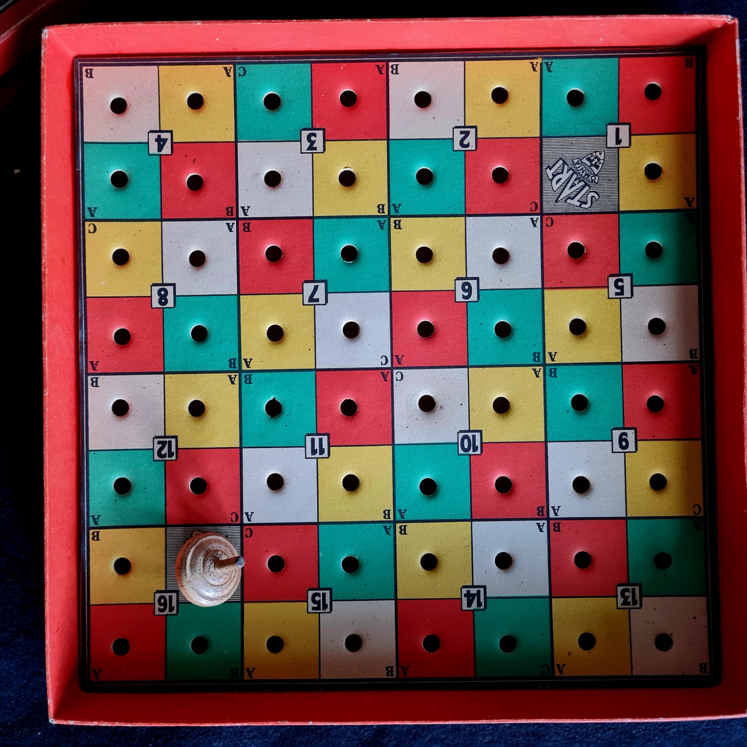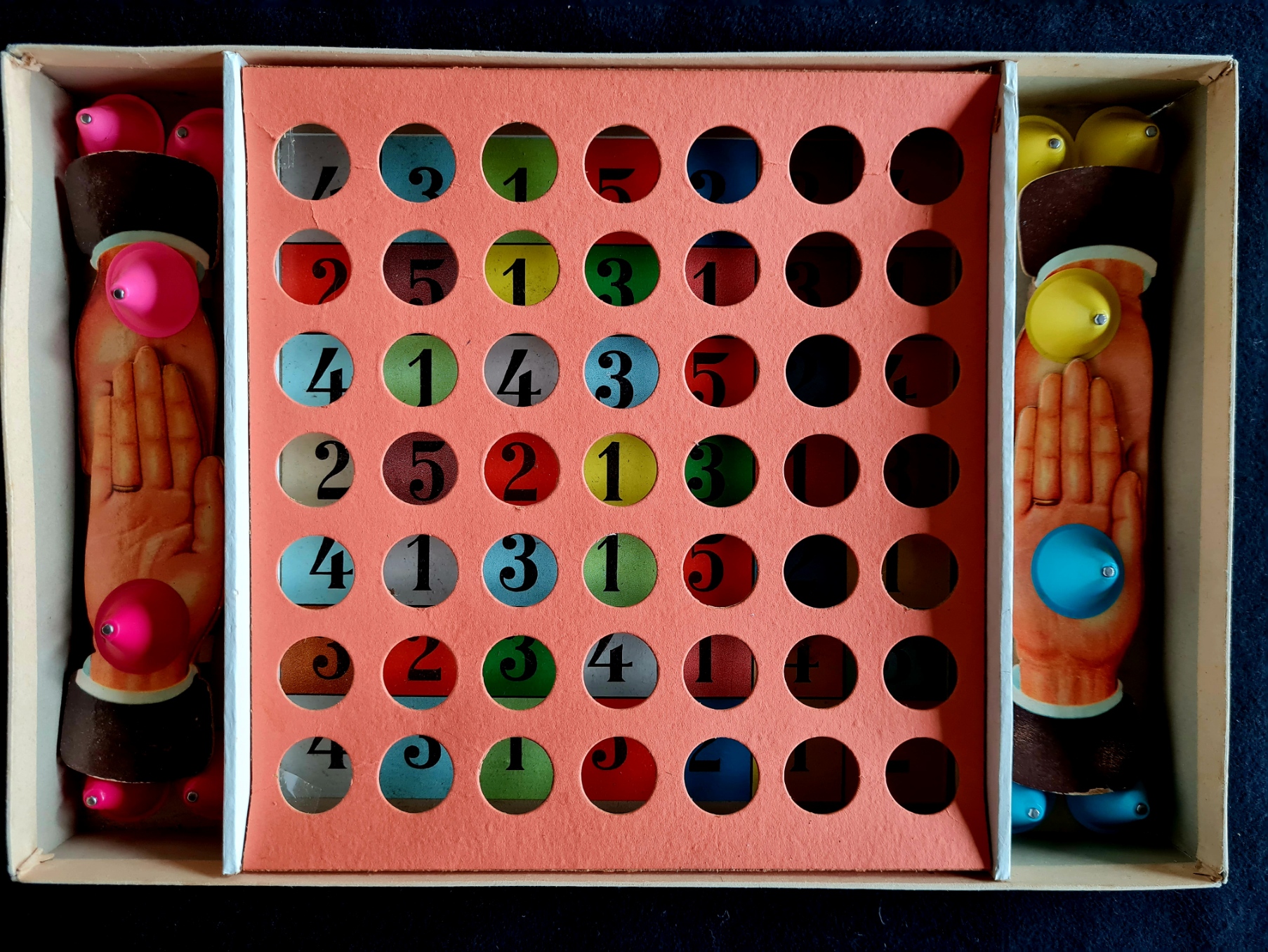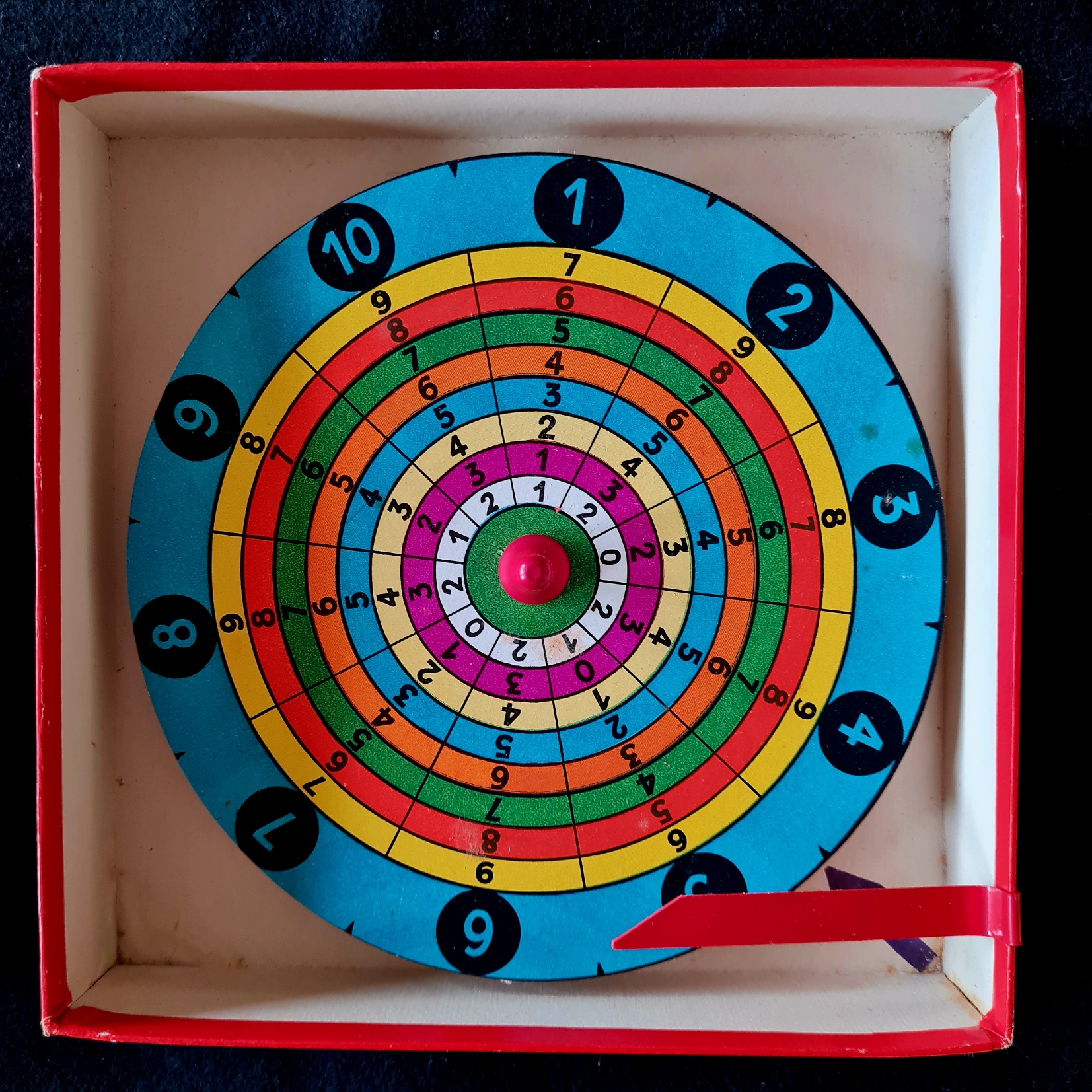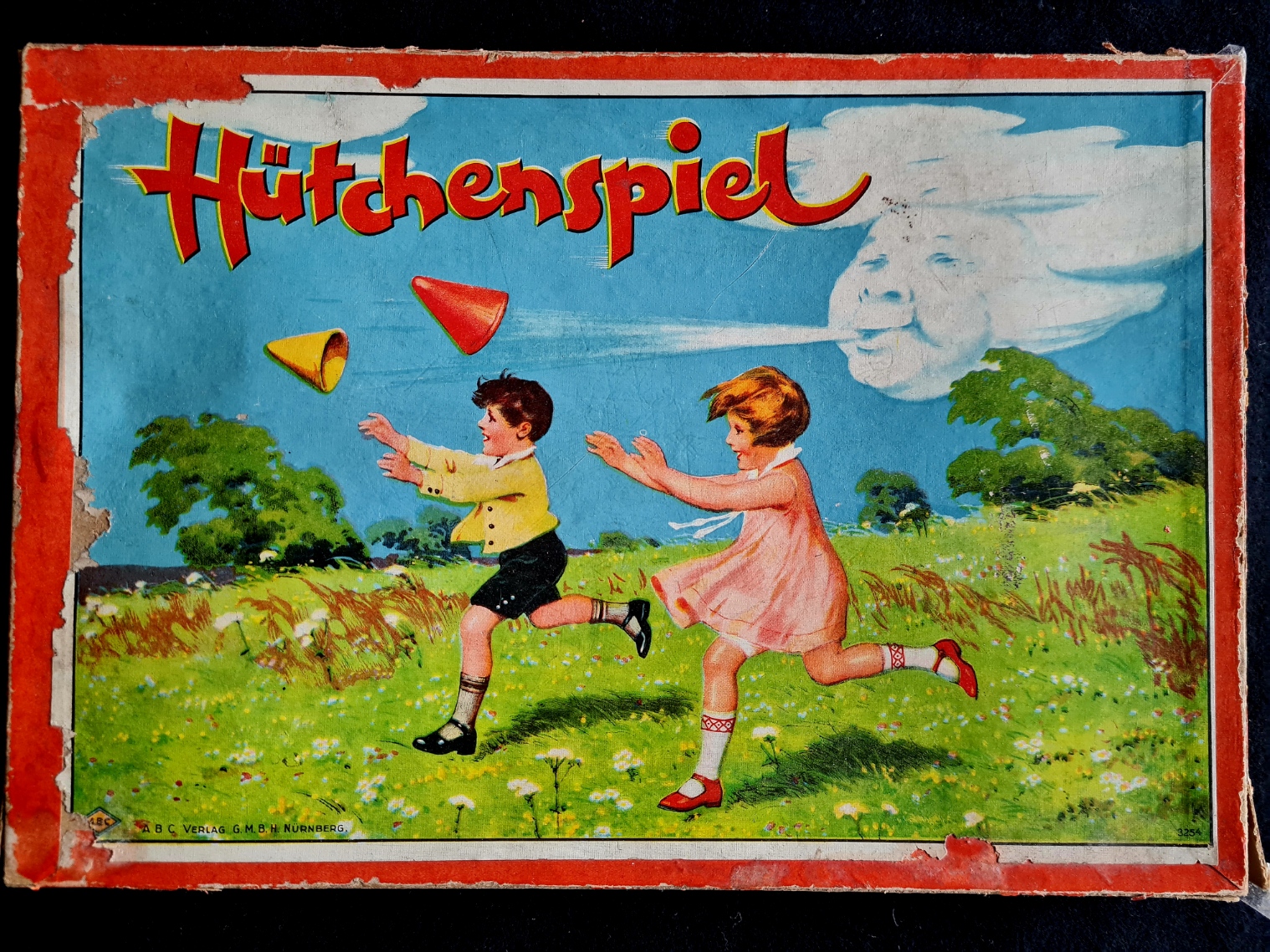 Auch vom ABC-Verlag wurde ein Spiel verlegt, bei dem nit Hilfe von Wurfbrettchen(Hände) Hütchen auf iine durchlochte Platte geschleudert werden. Das ist - bis auf die üblichenSchäden am Schachteldeckel - gut erhalten und vollständig.