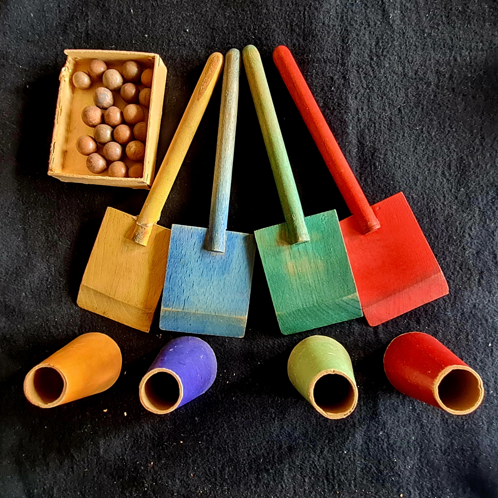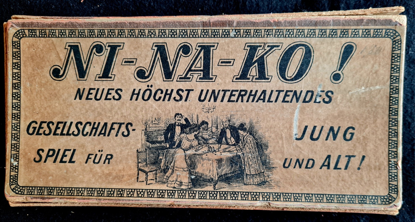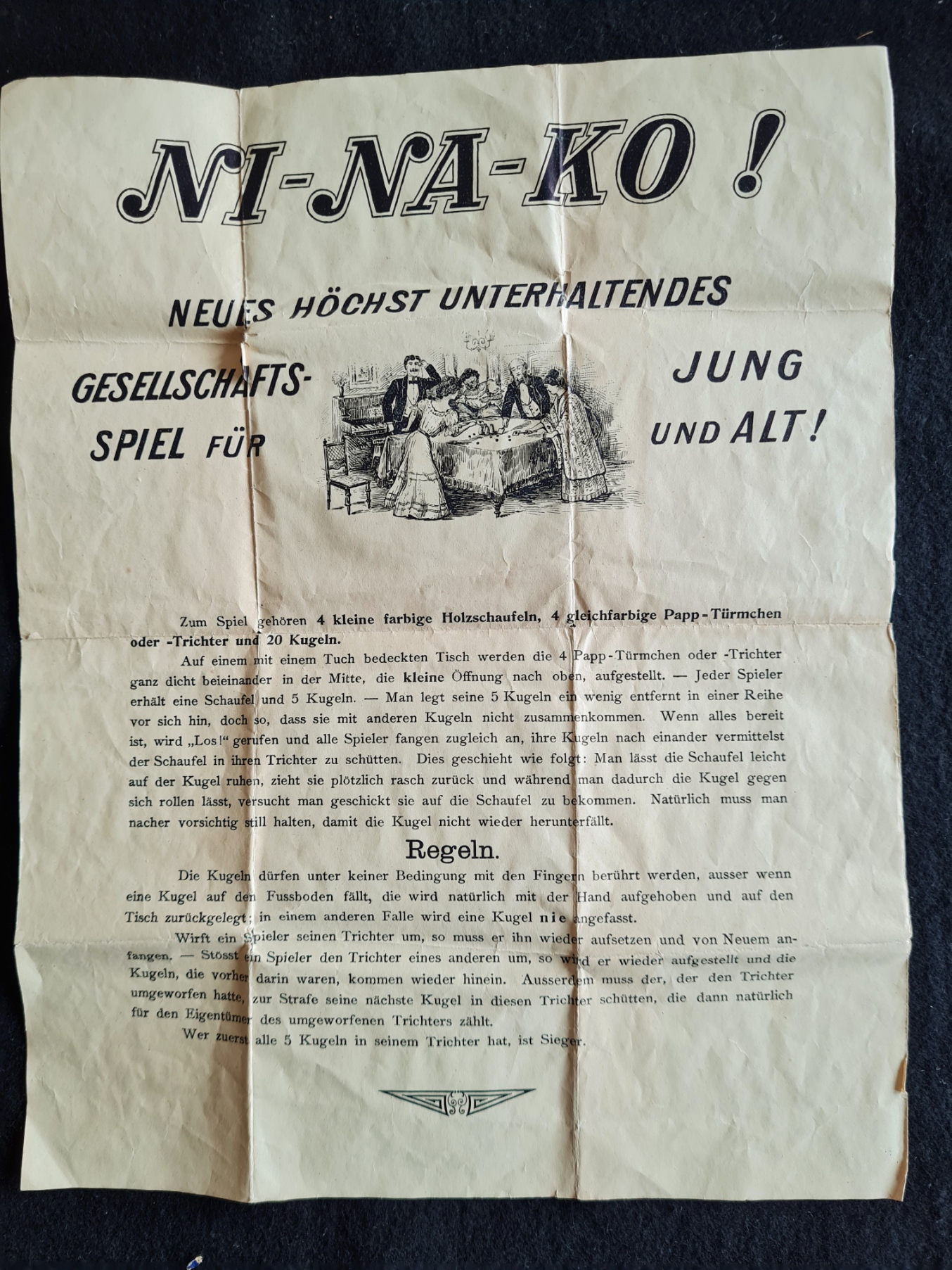 Für NI-NA-KO ! Neues höchst unterhaltendes Gesellschafts-Spiel für Jung und Alt sind keinerlei Informationen Autor, Verlag oder Herstellungsjahr betreffend zu finden. Das Spiel ist vollständig erhalten mit größeren Schäden an der Spieleschachtel. Die Spielgeräte - Schaufeln, Becher und Kugeln - sind in gutem Zustand.