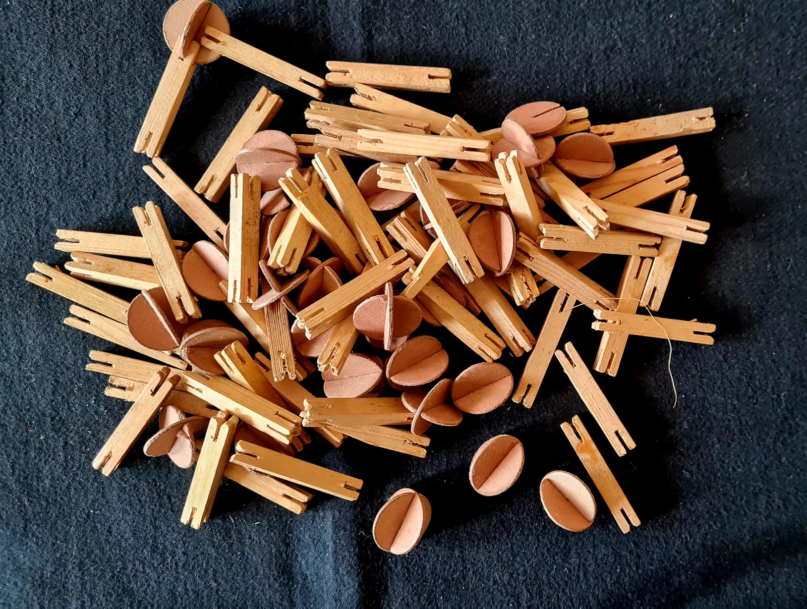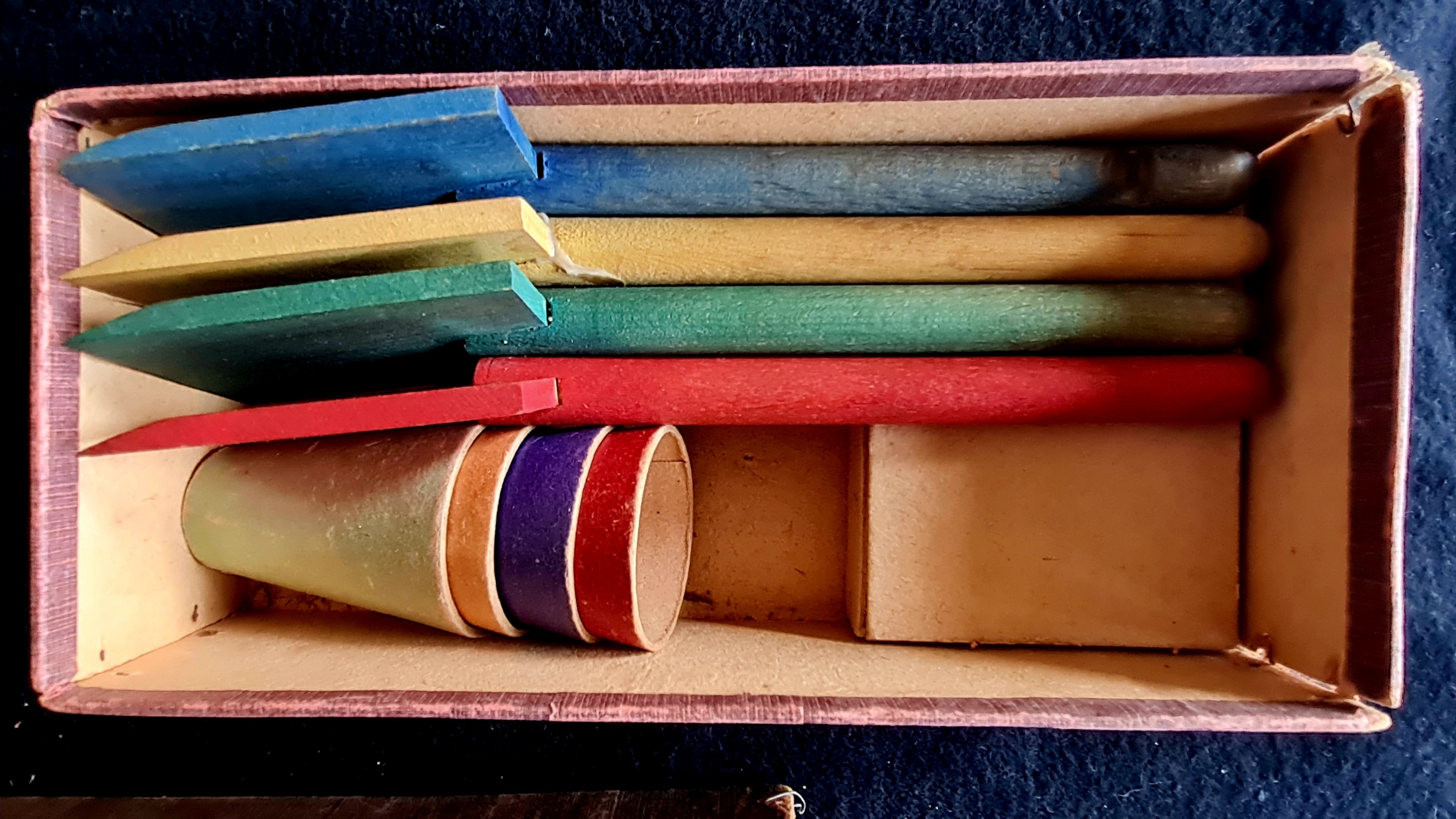 Die kleine Zündholzschachtel mit dem dem kleinste Metallbaukasten der Welt befand sich im Innern des oben beschriebenen Matador-Baukasten. Auch hier dürften die Metallteile vollständig sein; einige Holzstäbchen sind gebrochen und müssten ersetzt werden.