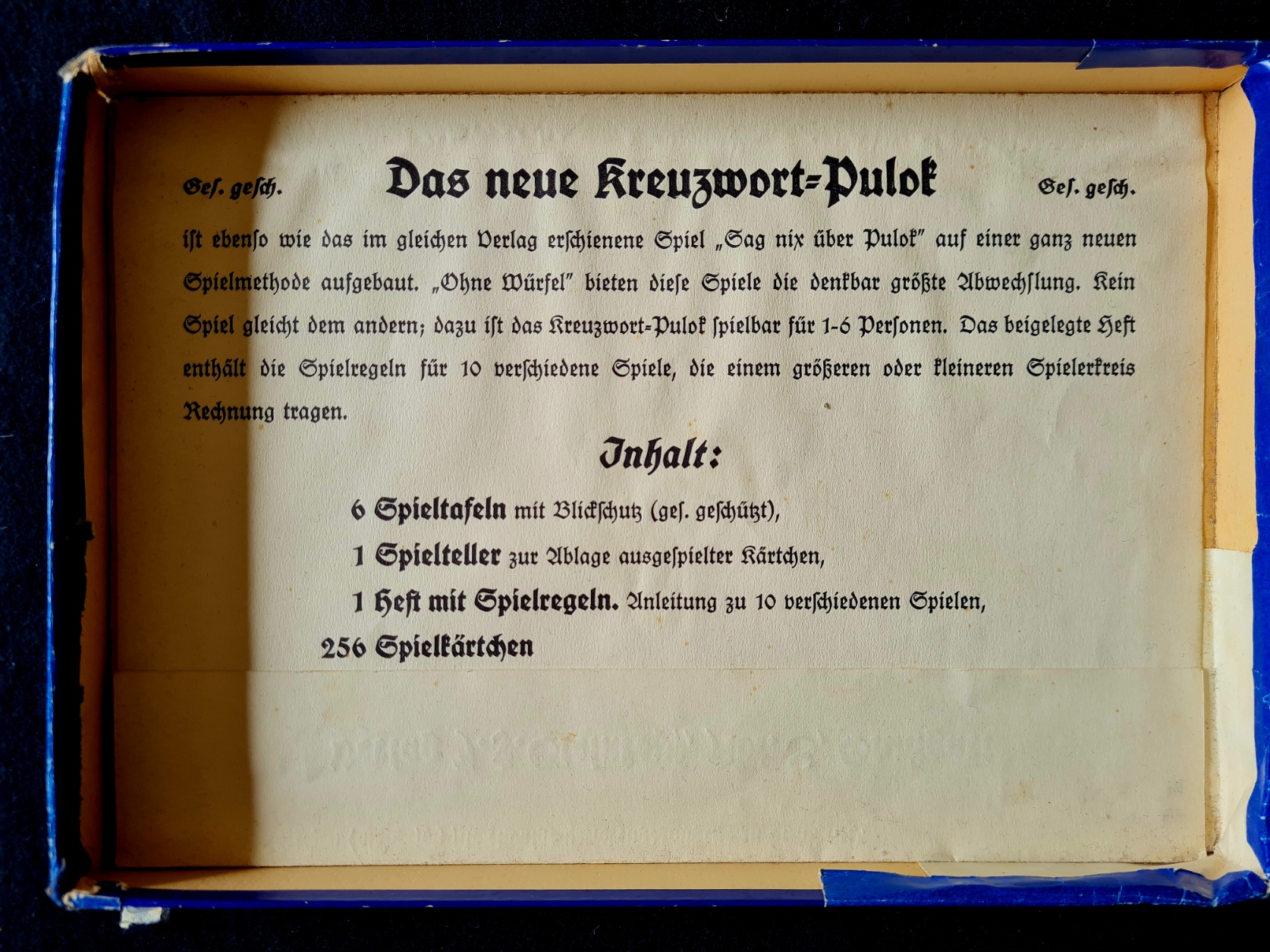 Das in der Spielesammlung vorhandene Kreuzwort-Pulok ist gut erhalten - bis auf die üblichen Beschädigungen der Spielschachtel. Es ist weitgehend vollständig. Während die 15 Jokerkärtchen alle vorhanden sind fehlen von den 256 Wörterkärtchen einige wenige - trotz Hinweis in der Spielanleitung: