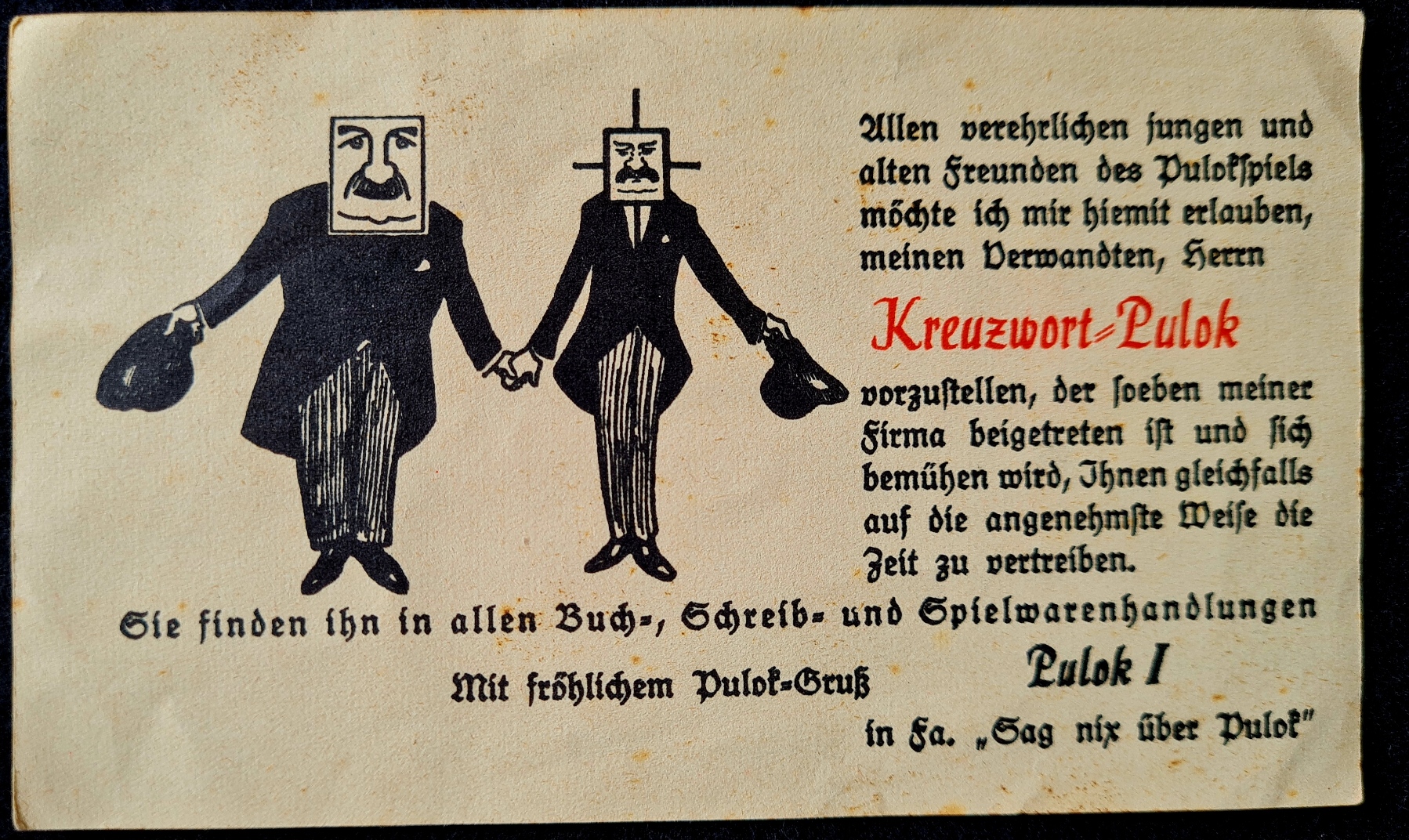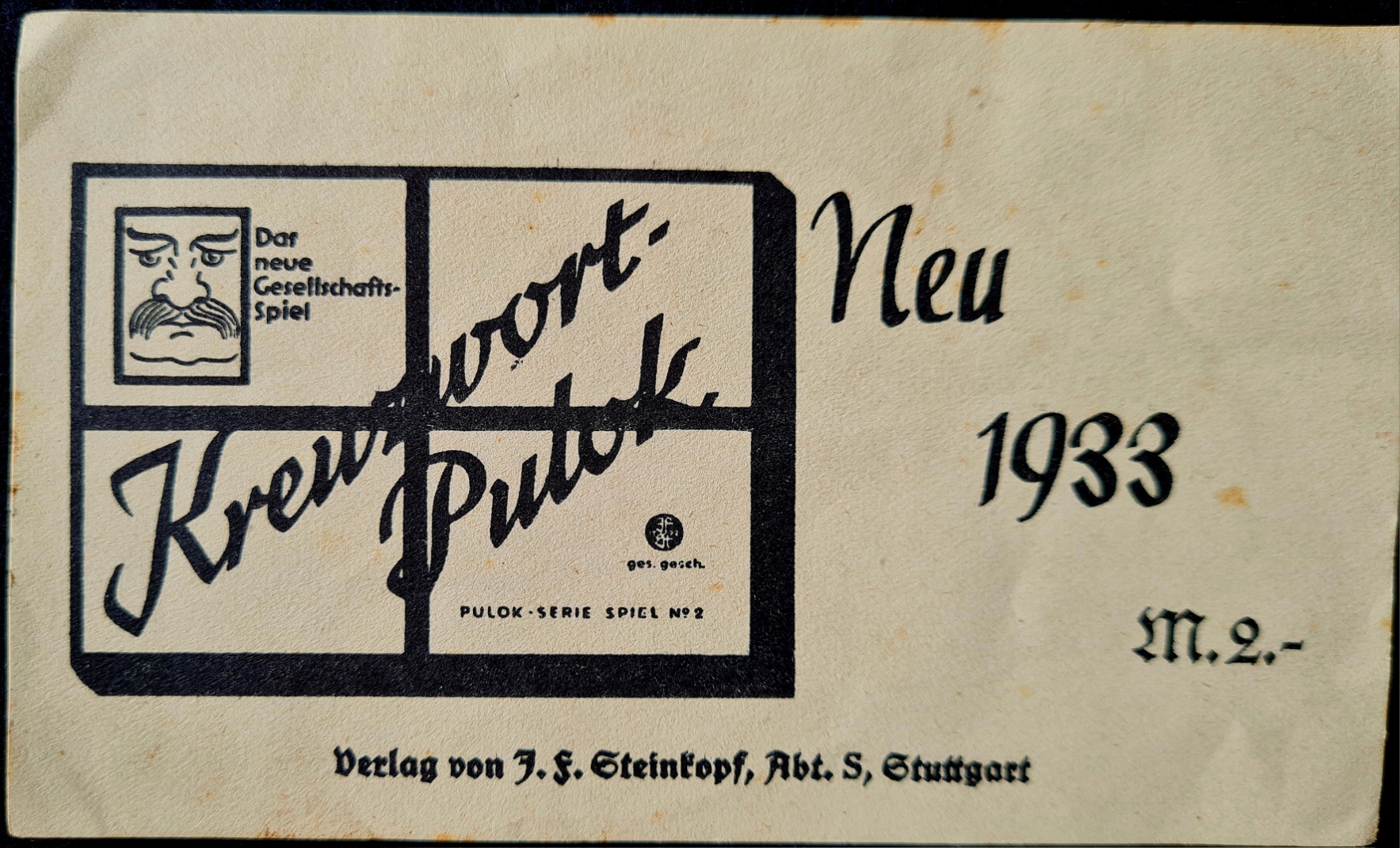 Im Jahr 1928 erschien im Verlag J.F. Steinkopf, Stuttgart, eine Serie von Buchstaben- und Bilder- Legespielen, die in Deutschland rasch ungewöhnlich beliebt wurde. Ihr Autor war Hans Mack, damals Prokurist der Druckerei J.F. Steinkopf. Für die Spiele der Pulok-Serie wurden Insgesamt 17 + 10 verschiedene Spielregeln angeboten. [@glonn1988]