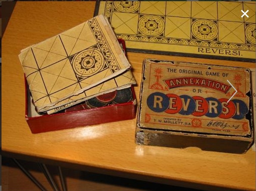 Whilst the Waterman release of Reversi was not sold with a board – the box stated that you had to play it on a chess board – the Mollett version was sold with a cheap paper 8×8 board and carried the Annex, or Annexation name. https://tametheboardgame.com/tag/the-game-of-annexation/