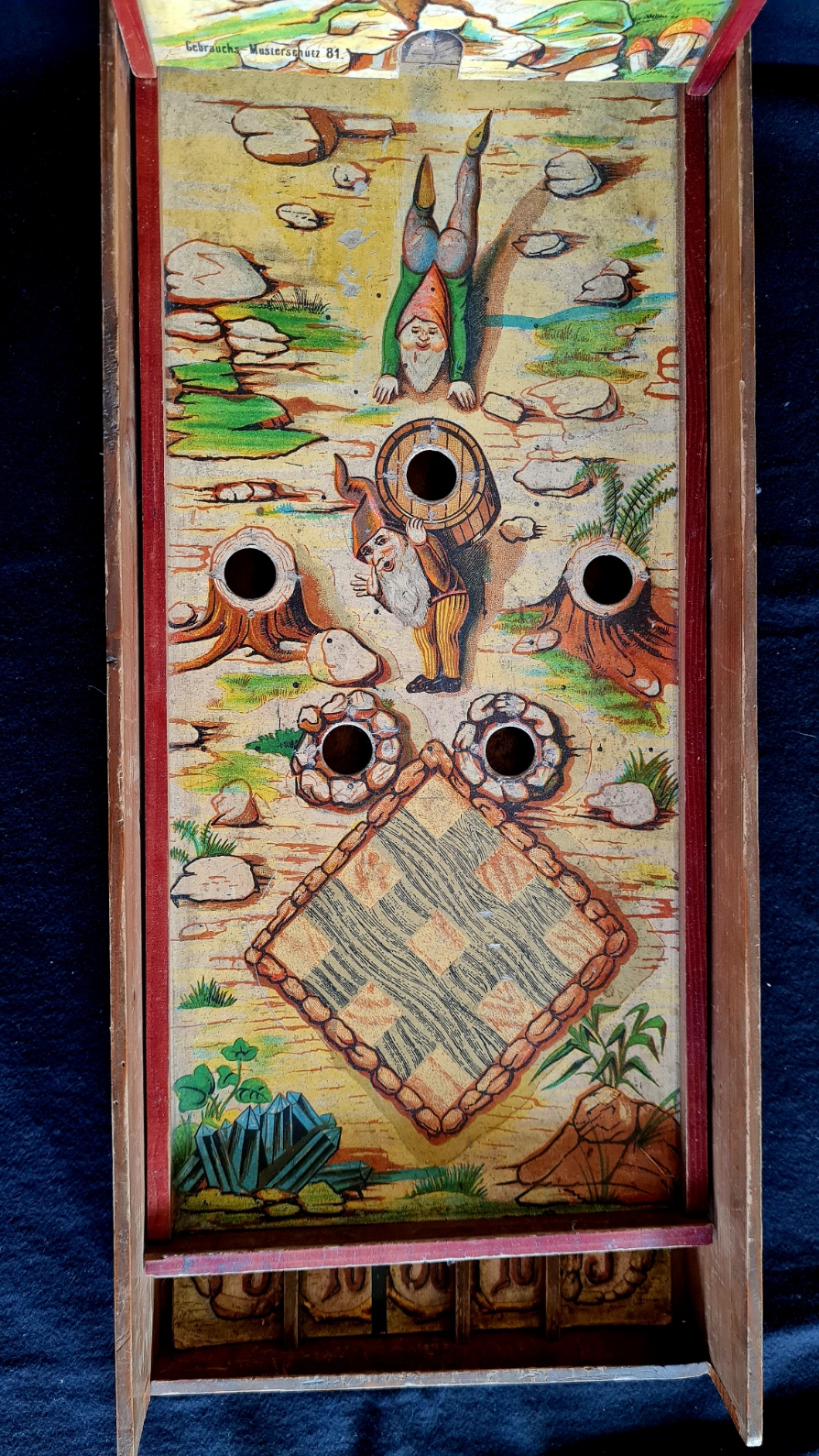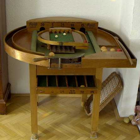 Gesellschafts und Kneipenspiel, 1920er Jahre. Die Kugel wird mittels Federmechanismus in die Spielfläche geschossen. Mit dem Hebel unten kann man die Richtung der Kugel beeinflussen und diese durch die Tore oder Löcher des Spielfeldes befördern und so Punkte sammeln.
