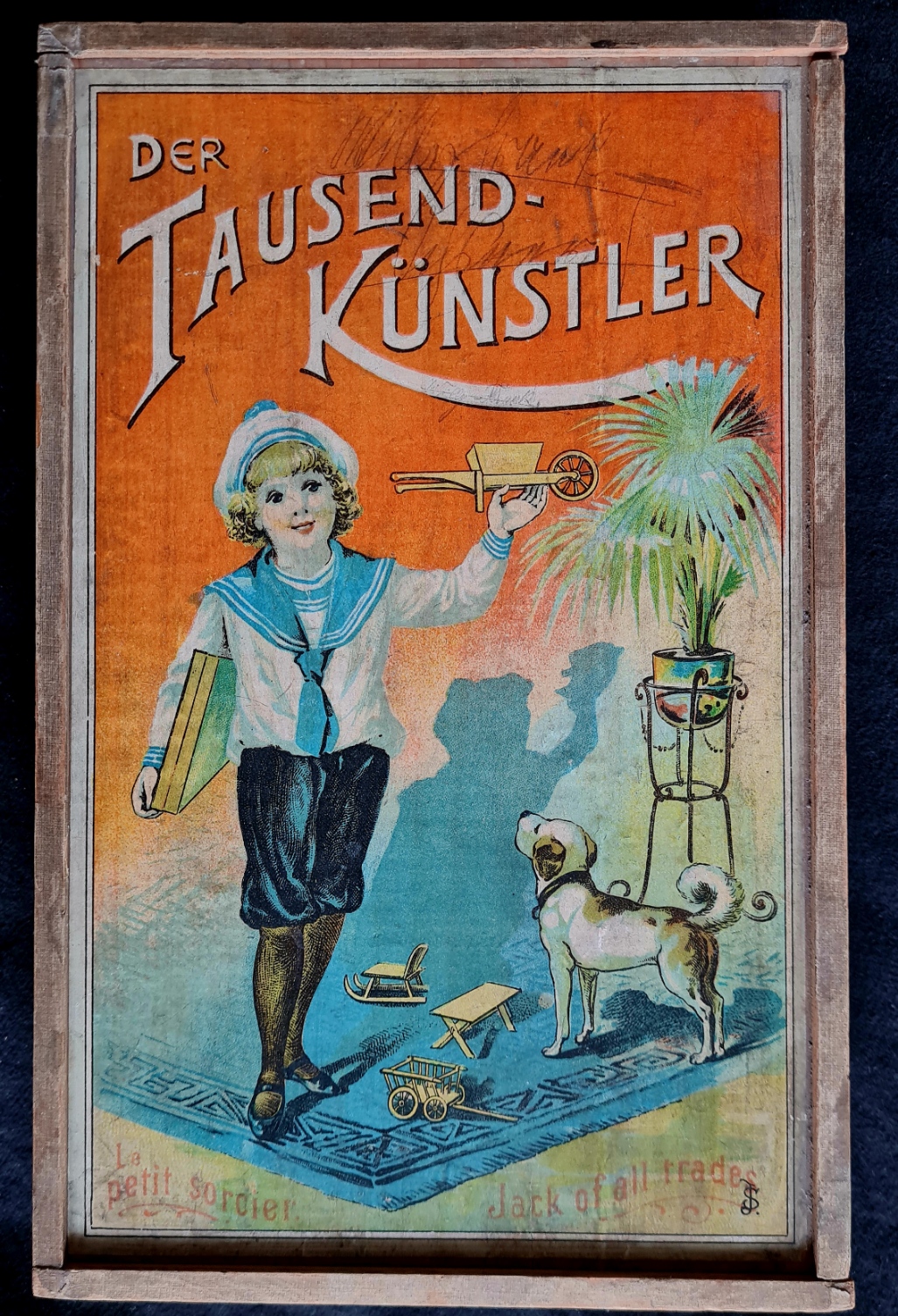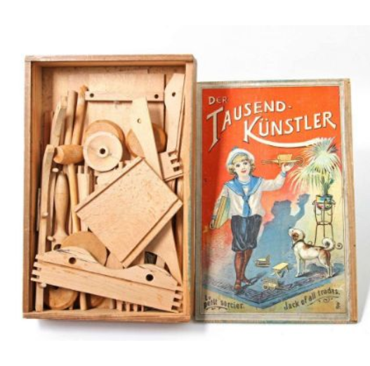 Beim Sammlungsexemplar ist offensichtlich ein Original Tausendkünstler-Holzkasten (Julius Stief) mit einem Konstruktionsspiel eines unbekannten Herstellers befüllt worden. Einige Holzteile sind gebrochen, die Ergänzungsteile für einige Vorlagen unvollständig.