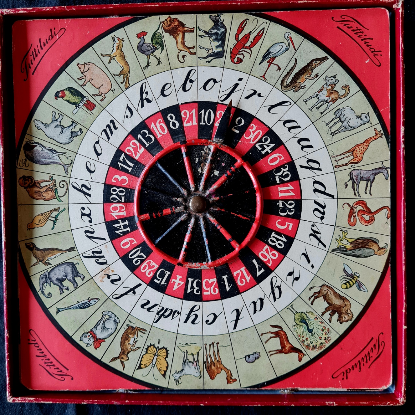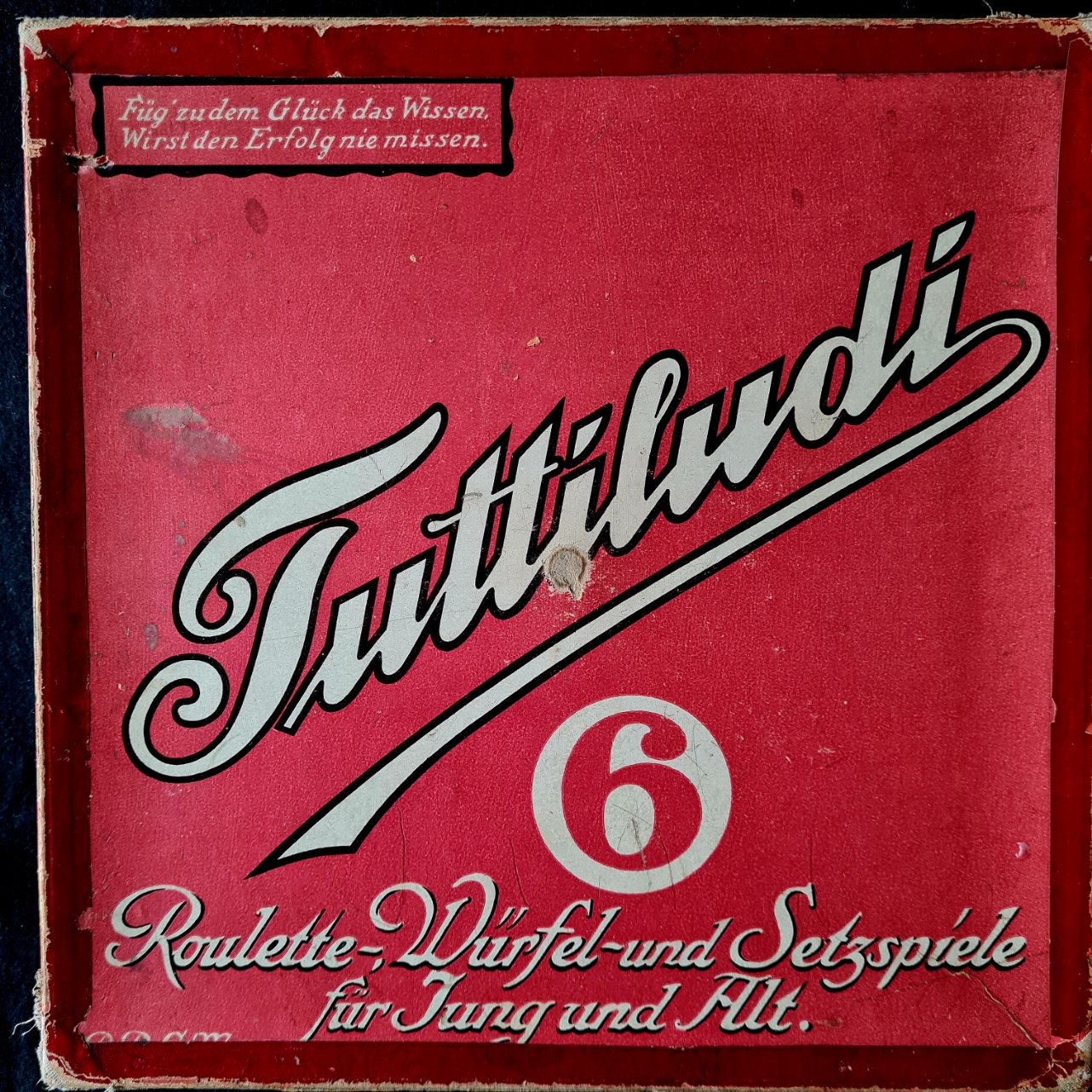 Bei Tuttiludi Roulett-, Würfel- und Setzspiele für Jung und Alt. handelt es sich um eine Spielesammlung die sechs Spiele umfasst, wobei vier auf der Benutzung des Roulette-Rads basieren: Bilder-, Buchstaben- und Zahlen-Roulette sowie ein dem Mensch ärgere dich nicht ähnliches Tuttiludi-Geduldspiel. Darüberhinaus liegt noch ein Spielplan für Mühle und Dame bei.