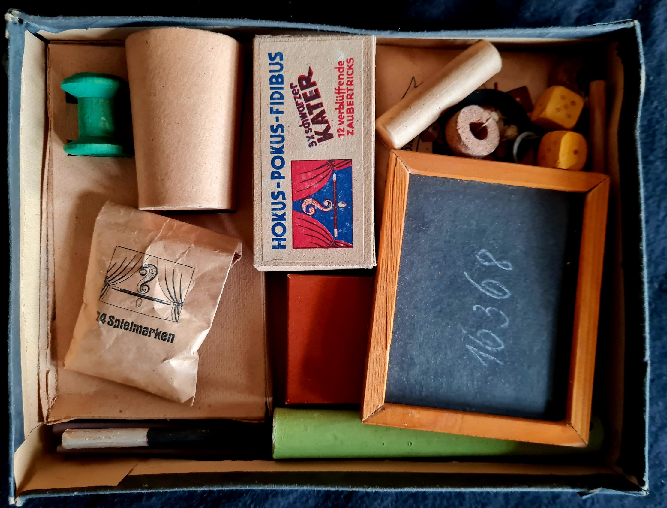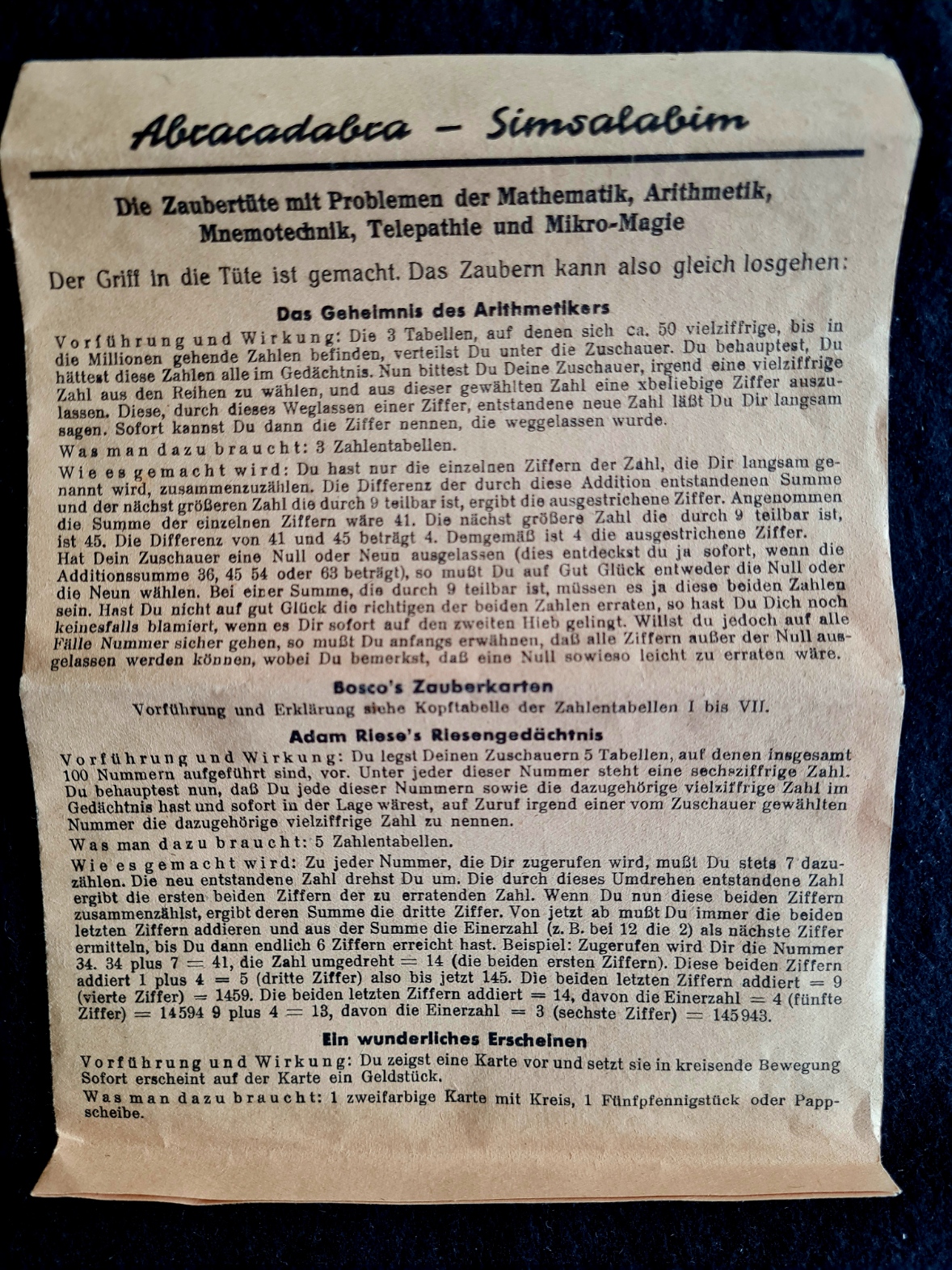 In einer (beschädigten) Pappschachtel befinden sich ein hölzerner Zauberstab, ein Tütchen mit Spielmarken, 2 Papp-Blasröhrchen, eine grün bemalte Pappröhre, sowie Tafel, Becher und Zwirnrolle. Eine Schachtel mit der Beschriftung HOKUS-POKUS-FIDIBUS verspricht 12 verblüffende Zaubertricks - leider fehlt die Anleitung dazu. Eine Zaubertüte ABRAKADABRA SIMSALABIM für problemfreudige Menschen jeden Alters enthält Zauberutensilien und eine Anleitung für 12 Probleme der Mathematik, Arithmetik, mnemotechnik, Telepathie und Mikro-Magie (vollständig).