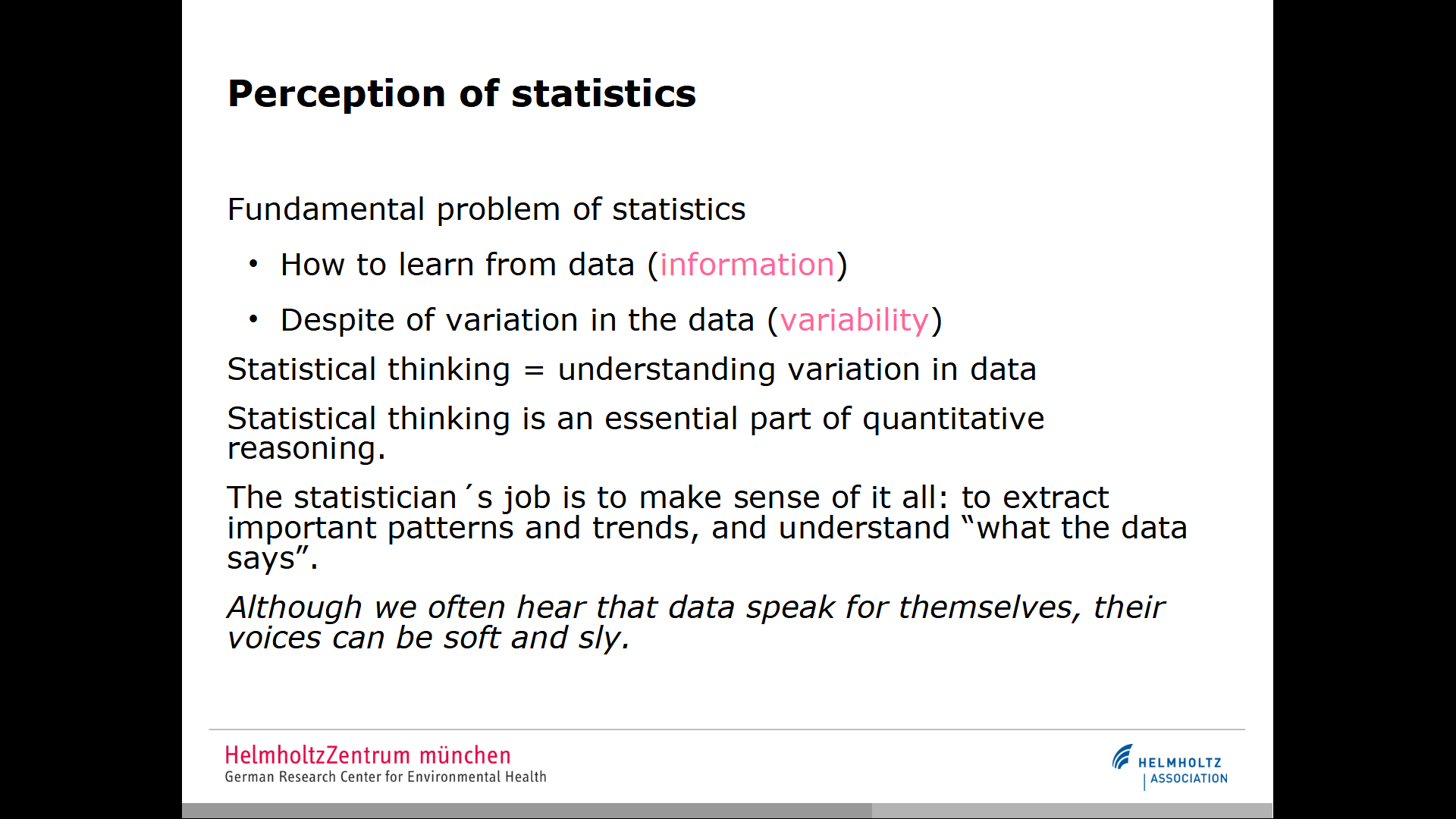 Aus einem Vortrag am HelmholtzZentrum münchen aus dem vorigen Jahrhundert zur Wahrnehmung von Statistik und zur Rolle des Statistischen Denkens: