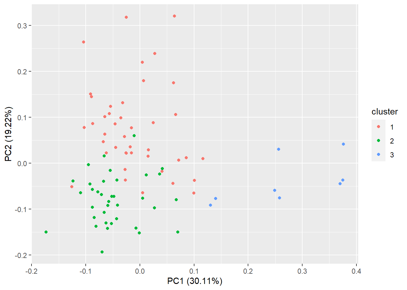 Zur Durchführung einer PCA wird normalerweise eine Funktion wie prcomp verwendet. In dieser Analyse wird jedoch autoplot aus dem R package ggplot2 benutzt. Mit den autoplot Funktionen sollen für jeden Datentyp mit einem einzigen Kommando bessere default Grafiken schnell und einfach erstellt werden können. Dazu ist meist nur die Angabe des Datensatzes und einer Auswertungsmethode nötig. Mit der Begründung primär an der Visualisierung der Daten interesiert zu sein, wird hier eine Clusteranalyse (Funktion pam, partitioning around medoids) benutzt; zur Visualisierung wird automatisch eine PCA durchgeführt (lediglich die Ausgabe der Biplot-Vektoren muss angefordert werden).
