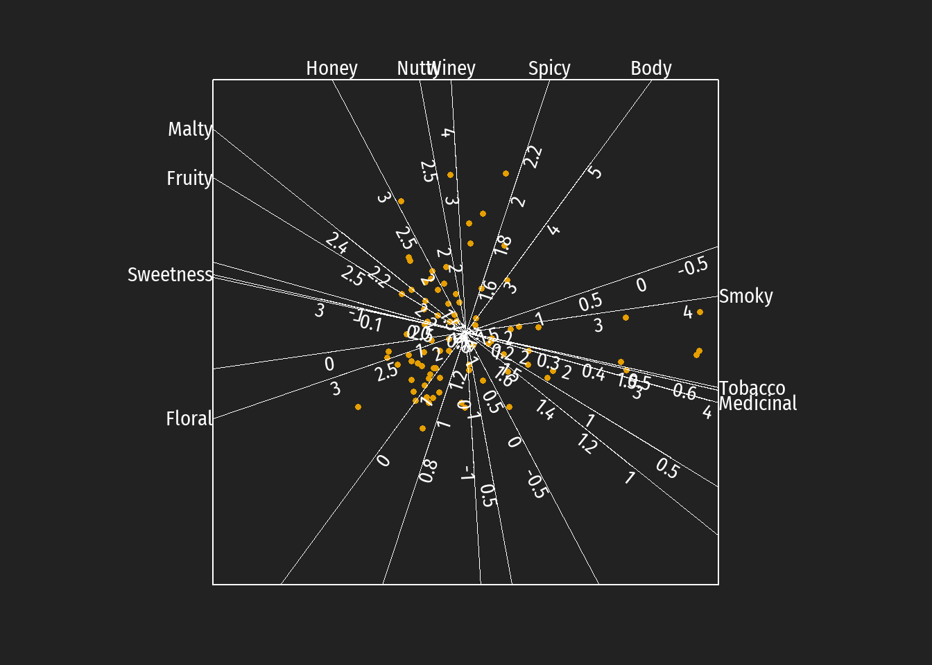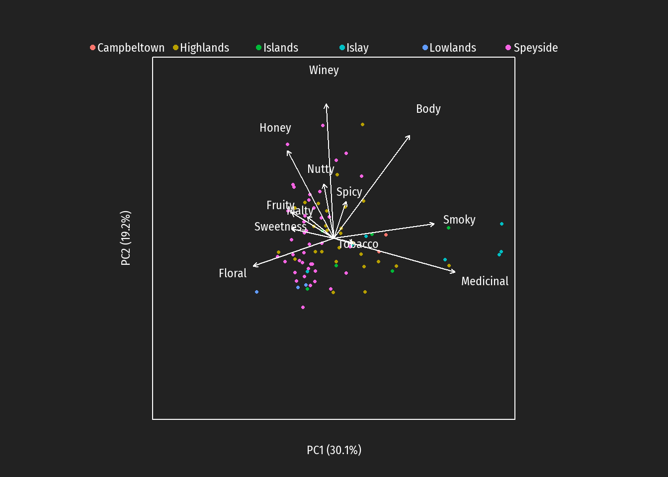 A whiskey that comes to lie on the lower right of the 2-dimensional PCA space would have both properties: it would be complex and smoky at the same time. I guess that a whiskey exhibiting both characteristics would be just too much for the palate to handle (i.e. smokiness masks complexity).
