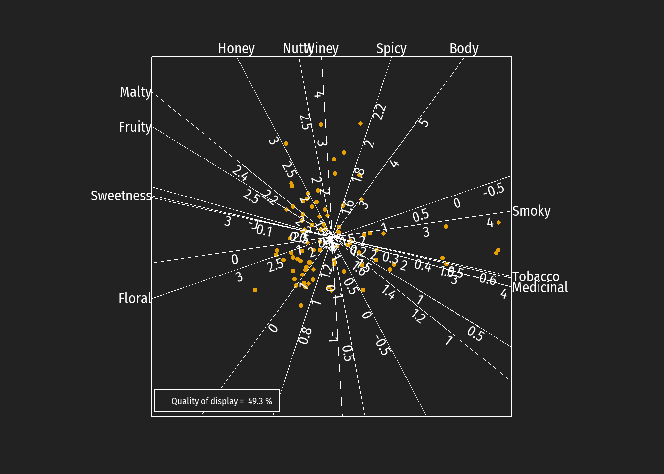 Die Abbildung lässt eine gewisse Clusterung der Regionen bezüglich der Variablen erkennen. Beispielsweise haben etliche Islay Destillerien hohe Skalen-Werte bei den Geschmacksskatetegorien Medicinal und Smoky. Außerdem sind Abhängigkeiten zwischen den Variablen abzulesen (Biplot-Vektoren in ähnlicher Richtung; z.B. hohe Abhängigkeit zwischen Medicinal und Smoky). Gemäß dem Hauptkomponentenkonzept sind die erklärten Varianzen für Komponente 1 (PC1) und Komponente 2 (PC2) angegeben. Die Achsen selbst und die Skalierung sind weggelassen. In vielen empirischen Untersuchungen hat sich eine inhaltliche Interpretation der Hauptkomponenten als schwierig und oft inhaltlich ziemlich willkürlich erwiesen. Deswegen werden auch kalibrierte Biplots zur Visualisierung der PCA-Ergebnisse benutzt.