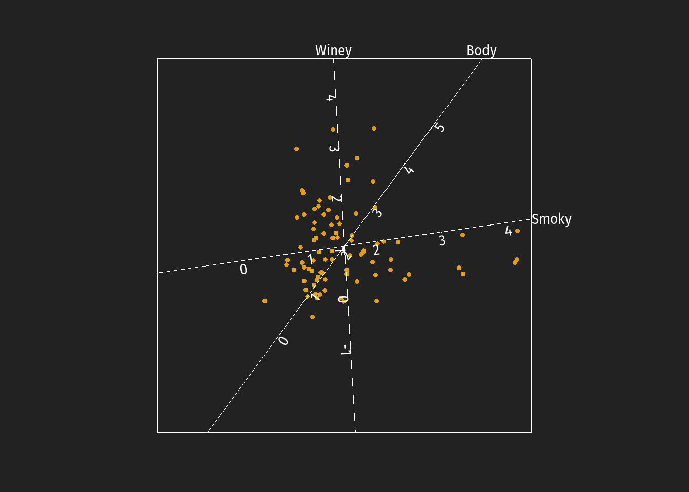 Diese kalibrierte Biplotdarstellung ist nicht eindeutig. Die Abbldungen können einer beliebigen Rotation sowie beliebigen orthogonalen Verschiebungen der Achsen unterzogen werde. Die approximatierten Werte der Markmale - als Projektionen auf die jeweiligen Achsen - bleiben dabei erhalten. Zur Beschreibung von bevorzugt auftretende Geschmackstendenzen bei Destillerien unterschiedlicher schottischer whiskey Regionen können in diesem Biplot die unterschiedlichen Regionen auch farbig markiert werden.