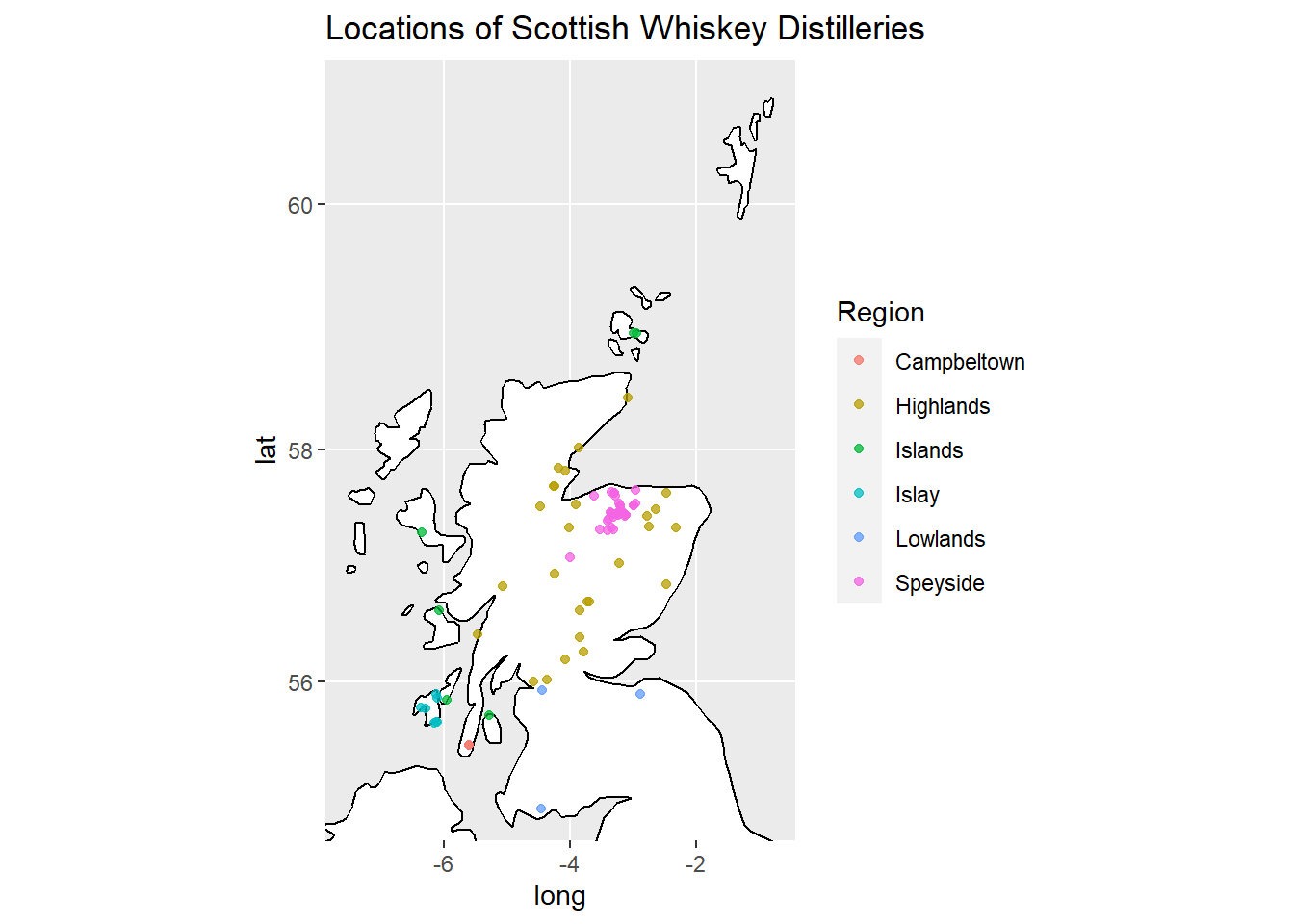 Die folgenden Abbildungen zeigen die räumliche Anordung der sechs schottischen Whiskey Regionen sowie die Lage der 86 Destillerien.Sie sind direkt dem post von M. Döring entnommem und können problemlos unter Verwendung von RStudio und RMarkdown reproduziert werden.