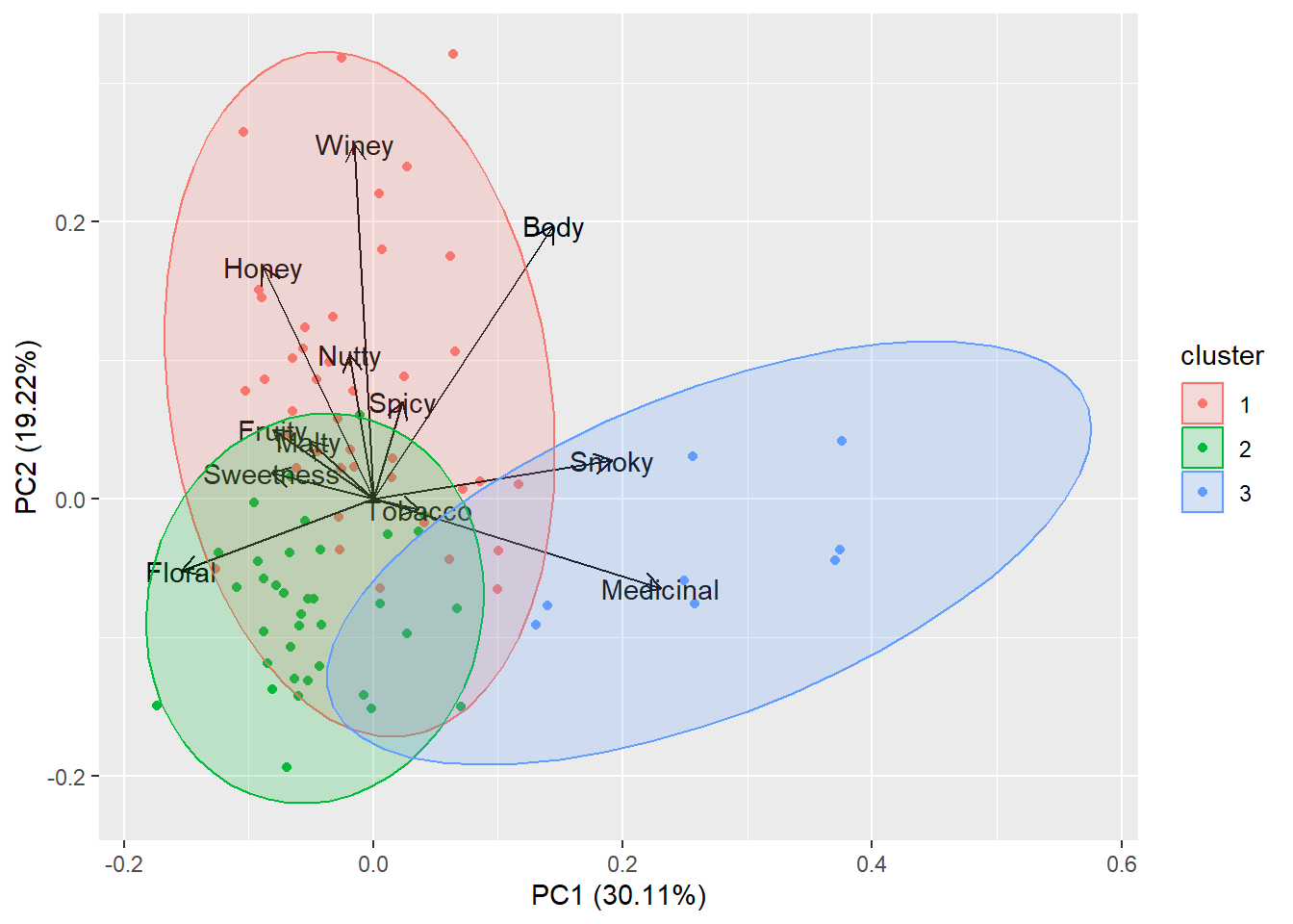 Die eigentliche Analyse (Dimensionsreduktion, Visualisierung, Interpretation) soll auf der Basis des Biplots geschehen ( PCA ). Die autoplot Grafik zeigt eine Biplotdarstellung mit skalierten Hauptachsen (PC1 und PC2) einschließlich der erklärten Varianz der einzelnem Komponenten (30.11% bzw. 19.22%). Außerdem werden die Variablen als Biplot-Vektoren dargestellt. Deren Projektionen auf die Komponentenachsen (nicht eingezeichnet, durch den Nullpunkt) bestimmen die sog. Ladungen bezüglich der Hauptkomponenten. So wird PC1 haupsächlich über die Merkmale Medicinal und Smoky bestimmt, während die zweite Komponente von den Merkmalen Winey und Honey beeinflusst wird. Für Body gibt sich eine etwa gleich große Ladung für beide Komponenten.