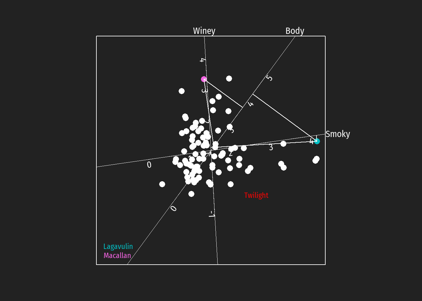 Zur Veranschaulichung nochmals die kalibrierte Biplotdarstellung (Twilight, Lagavulin und Macallan markiert).