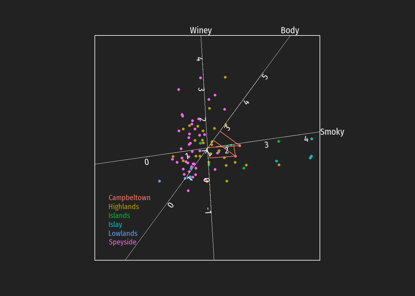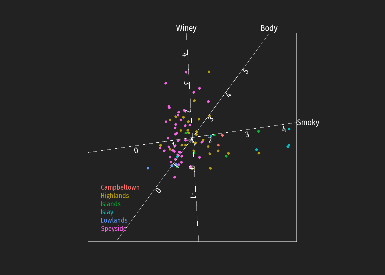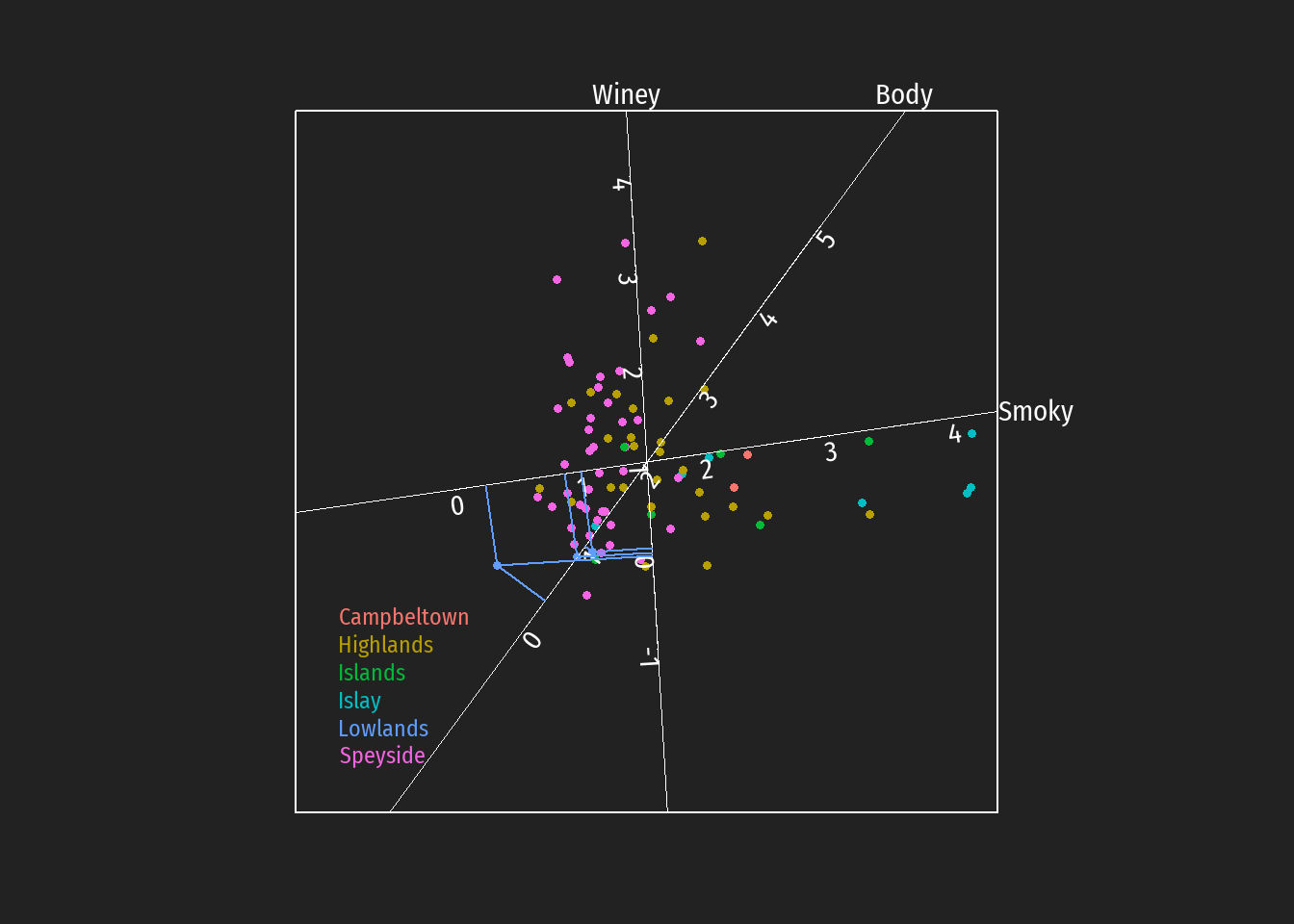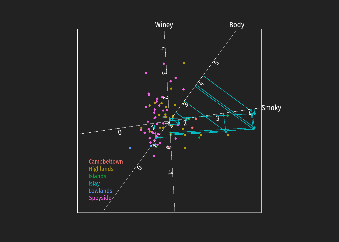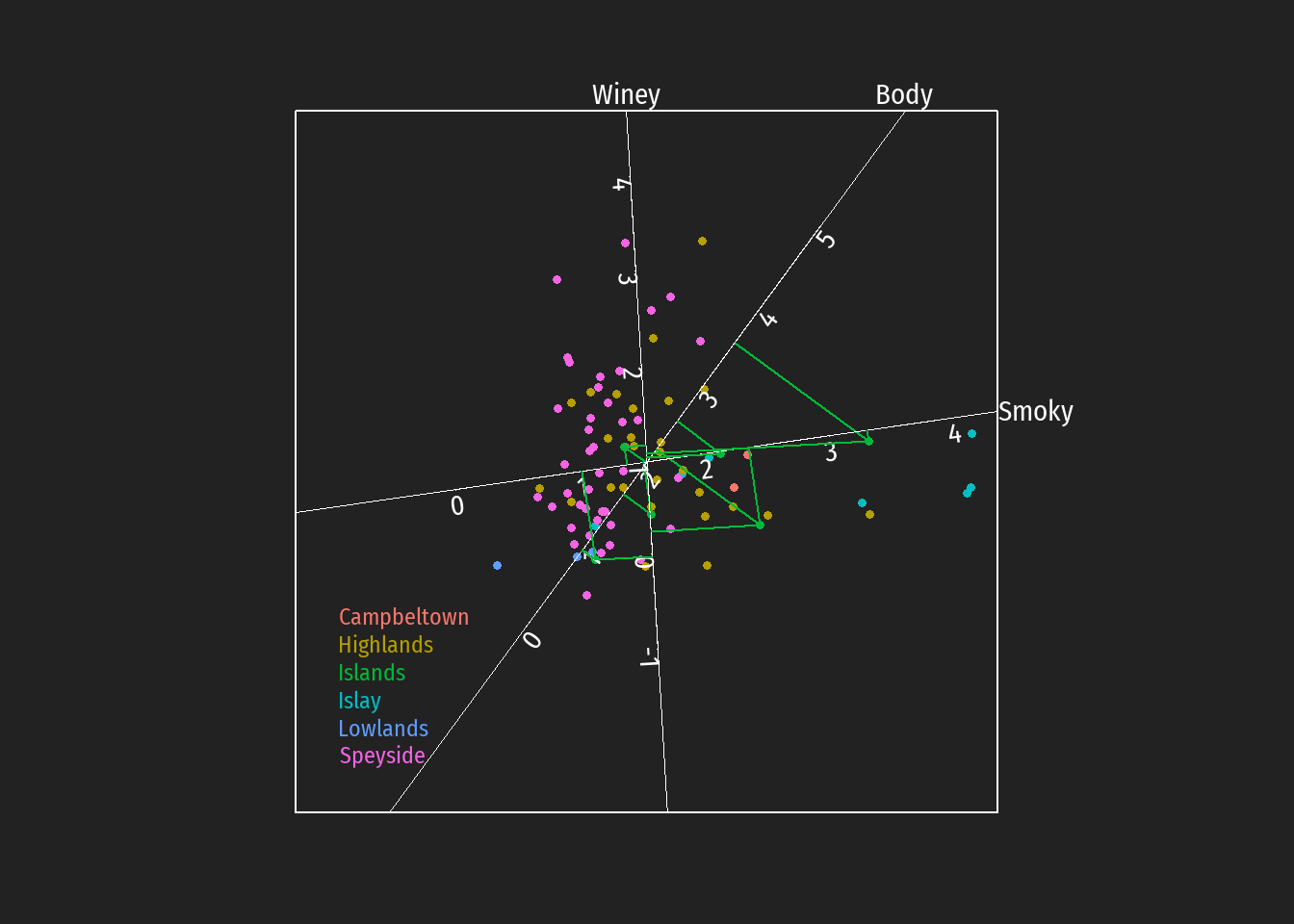 Durch Einzeichnen der Projektionen auf die Achsen können z.B. Hypothesen bezüglich bevorzugt auftretende Geschmackstendenzen bei Destillerien unterschiedlicher schottischer whiskey Regionen leichter überprüft werden (in den folgenden Abbildungen dargestellt für die Regionen Islay, Islands, Lowlands und Campbeltown).